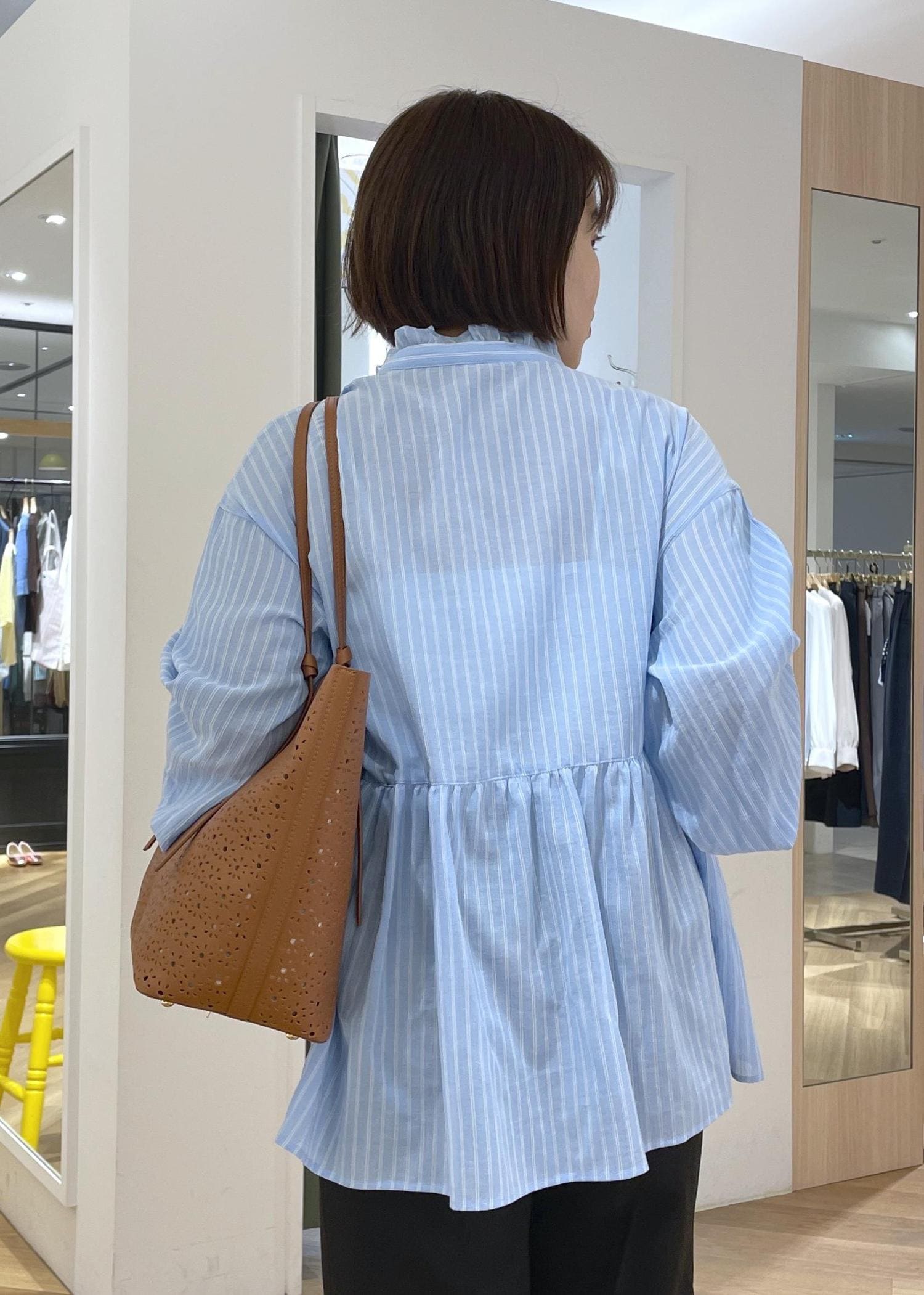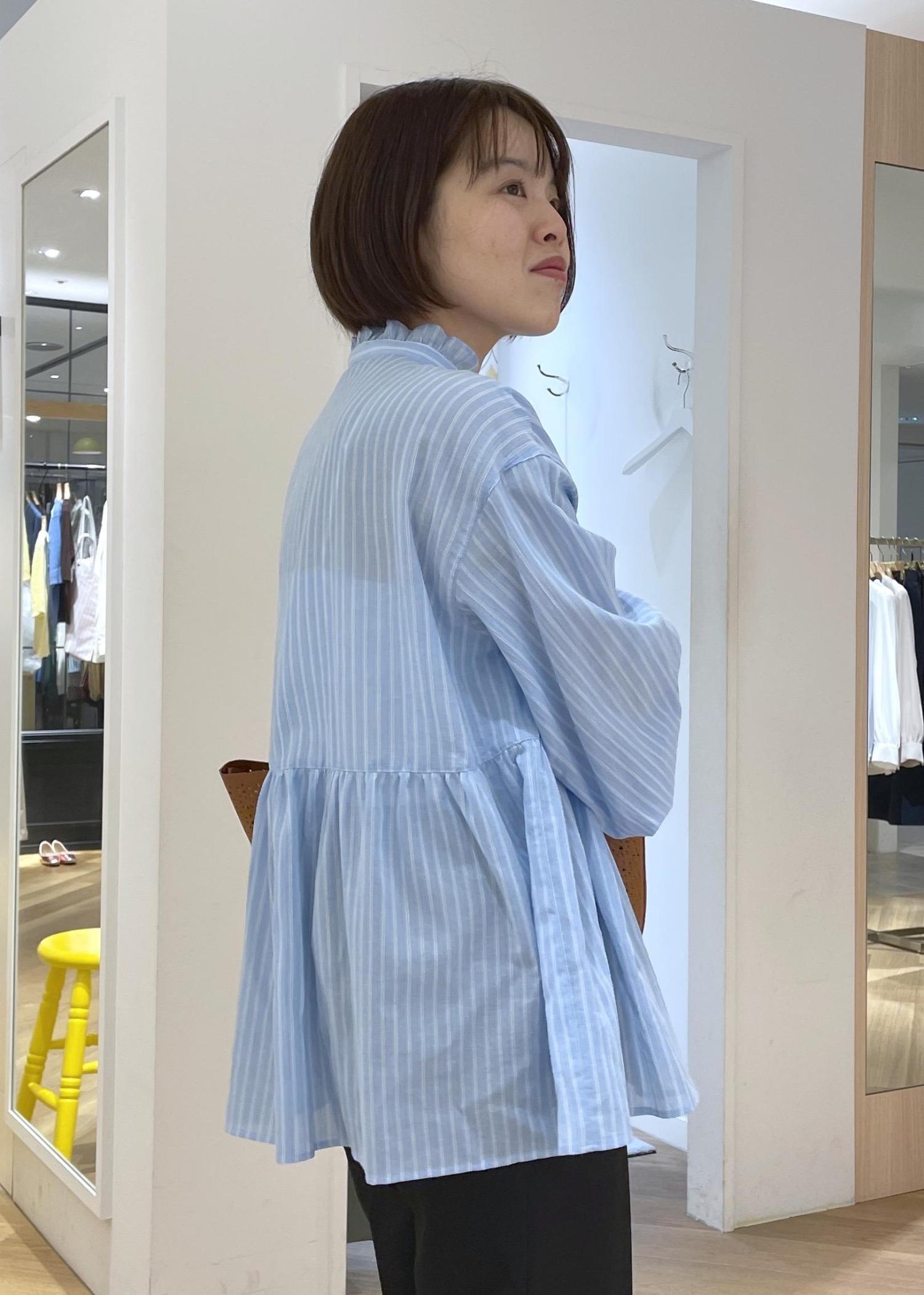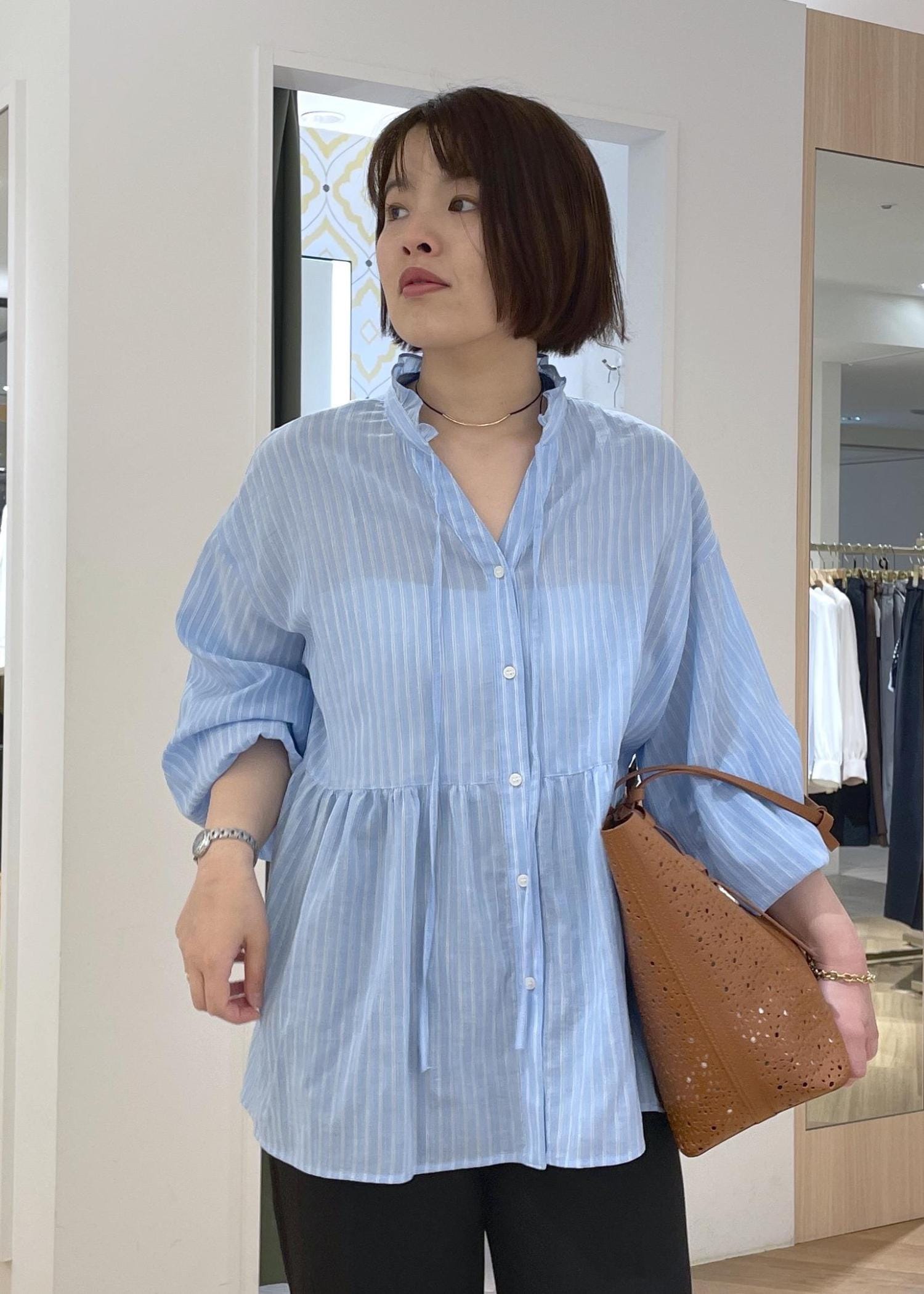 爽やかなストライプのスタンドフリルシャツにブラックのパンツを合わせた大人カジュアルコーデです!