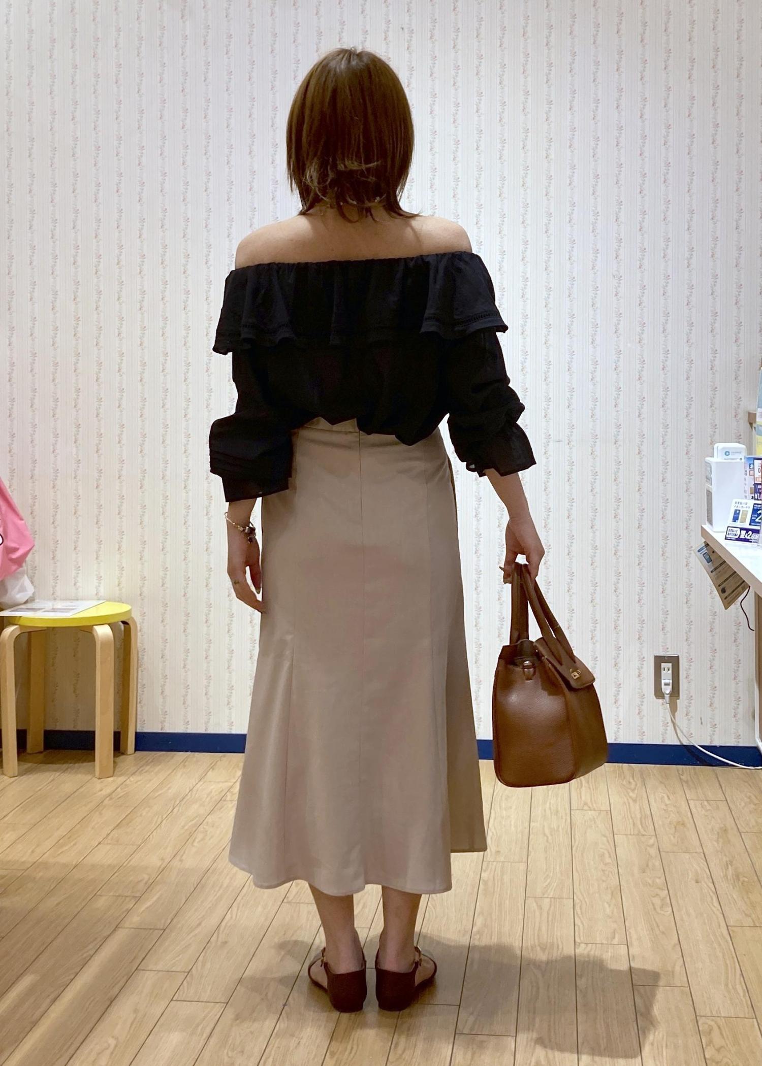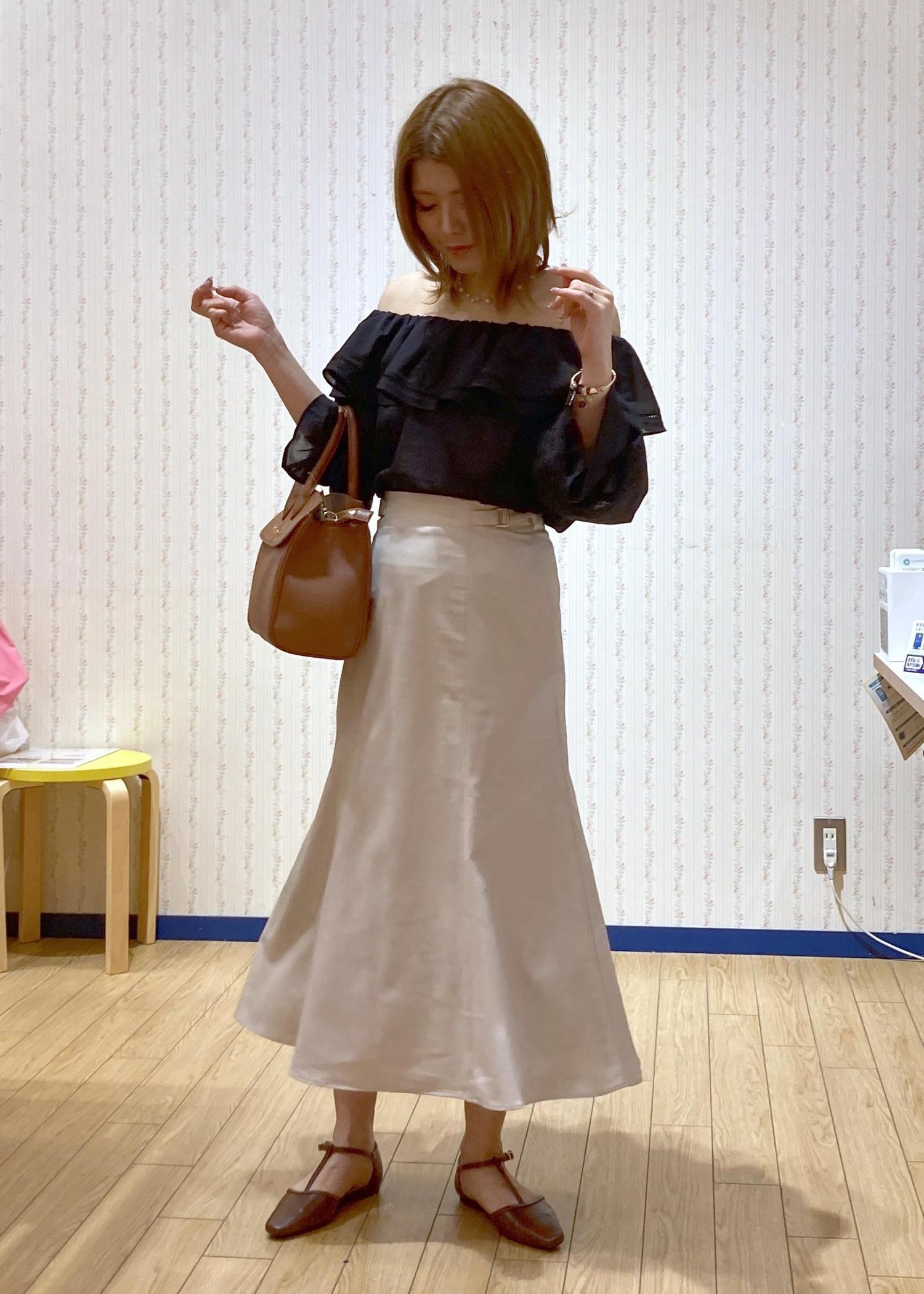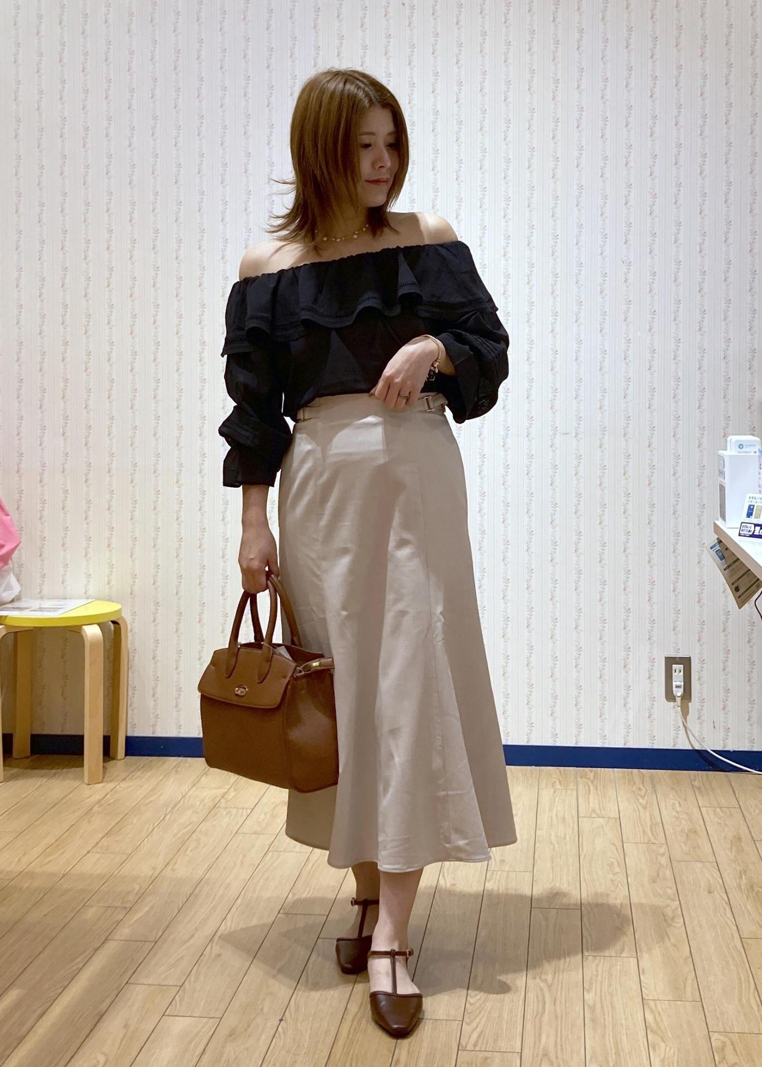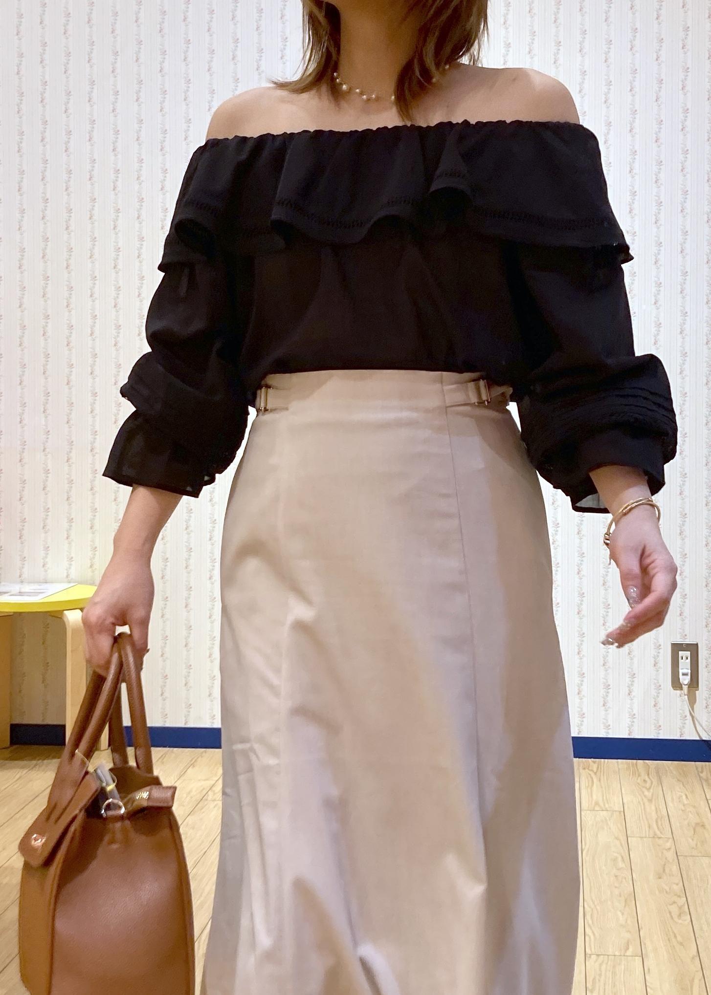 ブラックのオフショルブラウスにきちんと感のあるマーメイドスカートを合わせたON/OFF兼用の綺麗めコーディネートです。