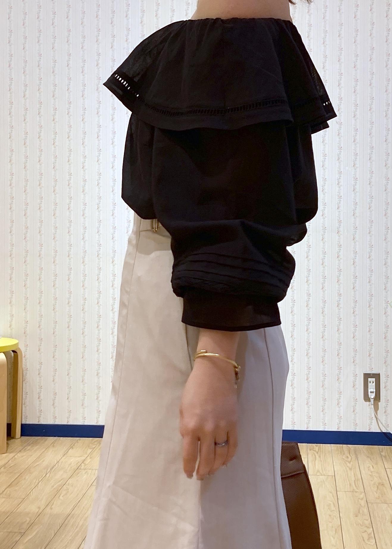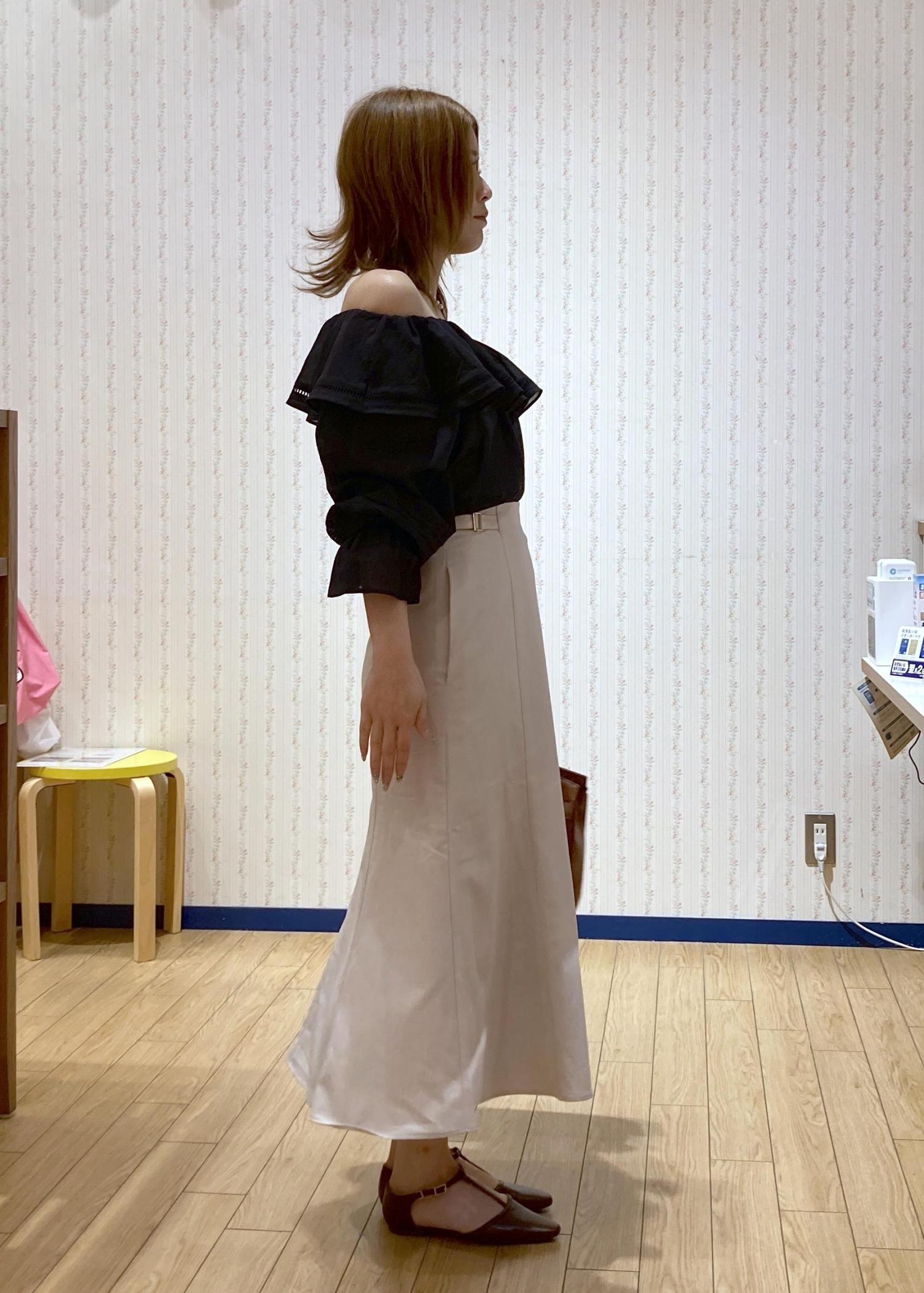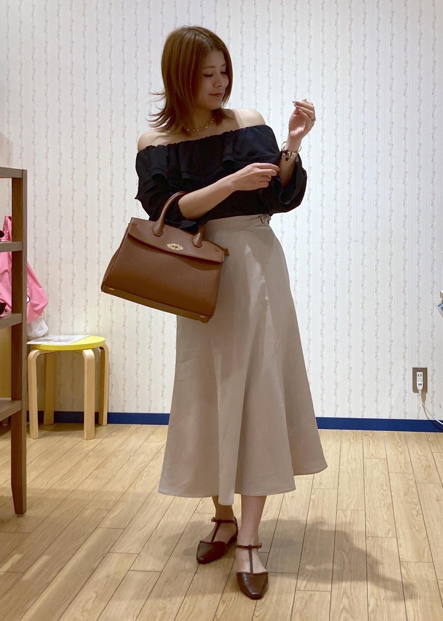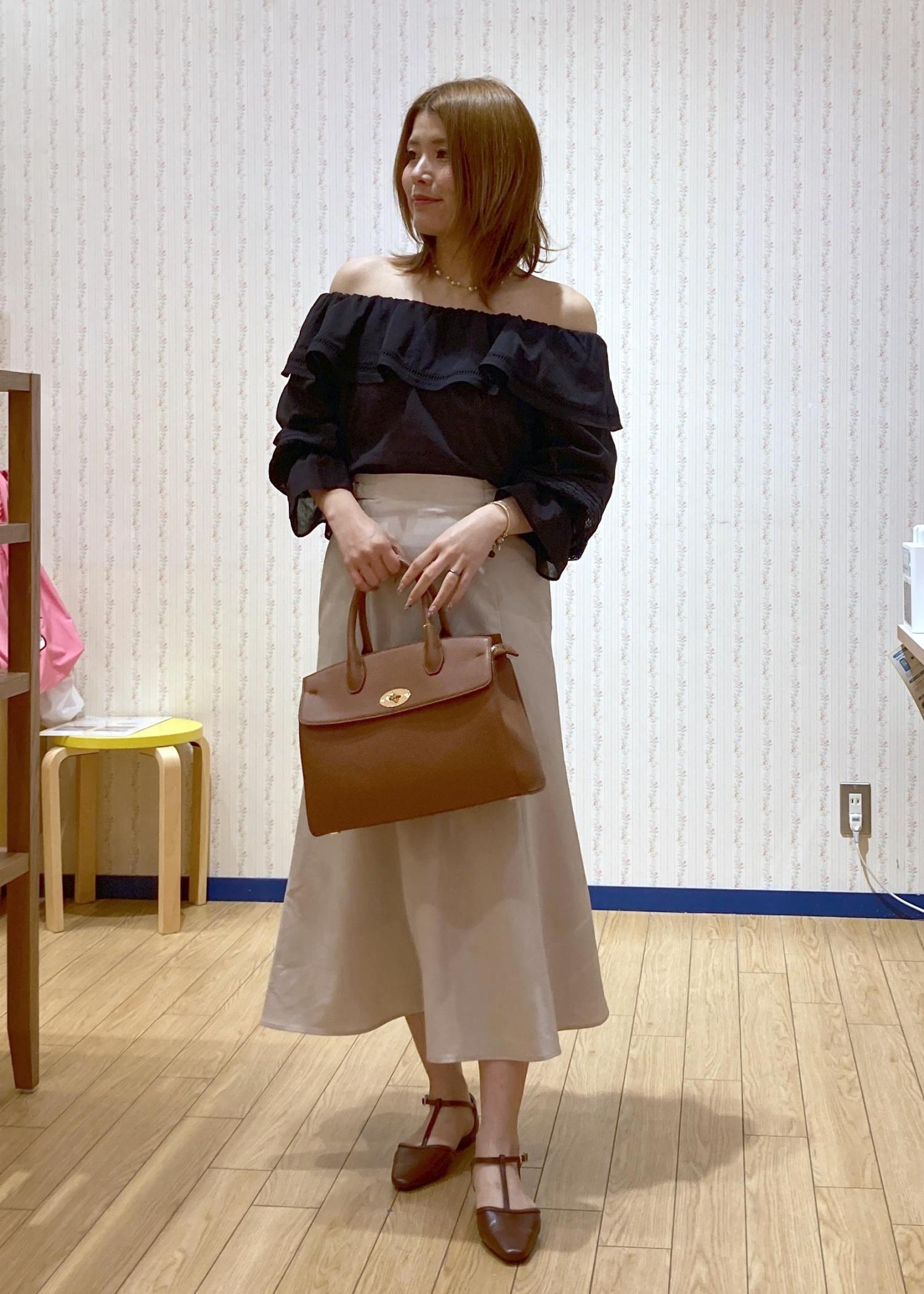 ブラックのオフショルブラウスにきちんと感のあるマーメイドスカートを合わせたON/OFF兼用の綺麗めコーディネートです。