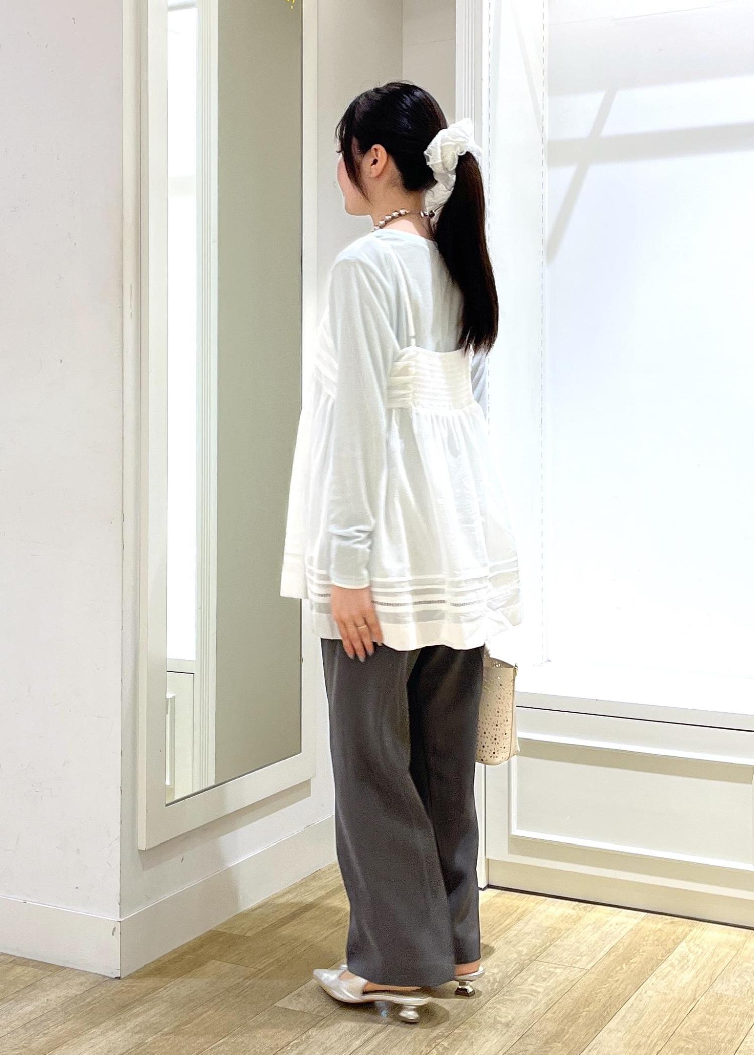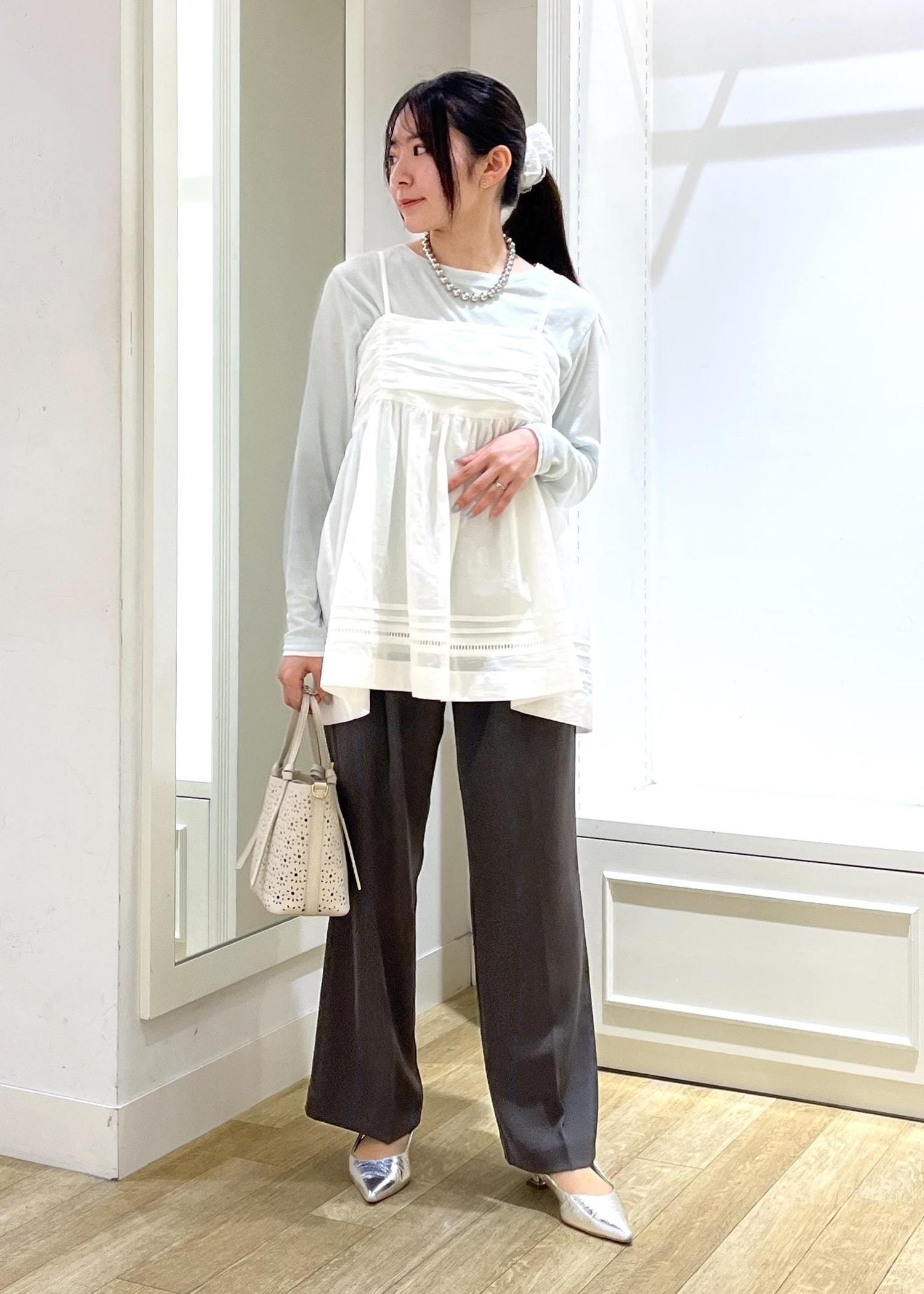 トップスは春らしいカラーのグリーンとホワイトにして、ボトムスは締まるように暗めのカラーにしました!