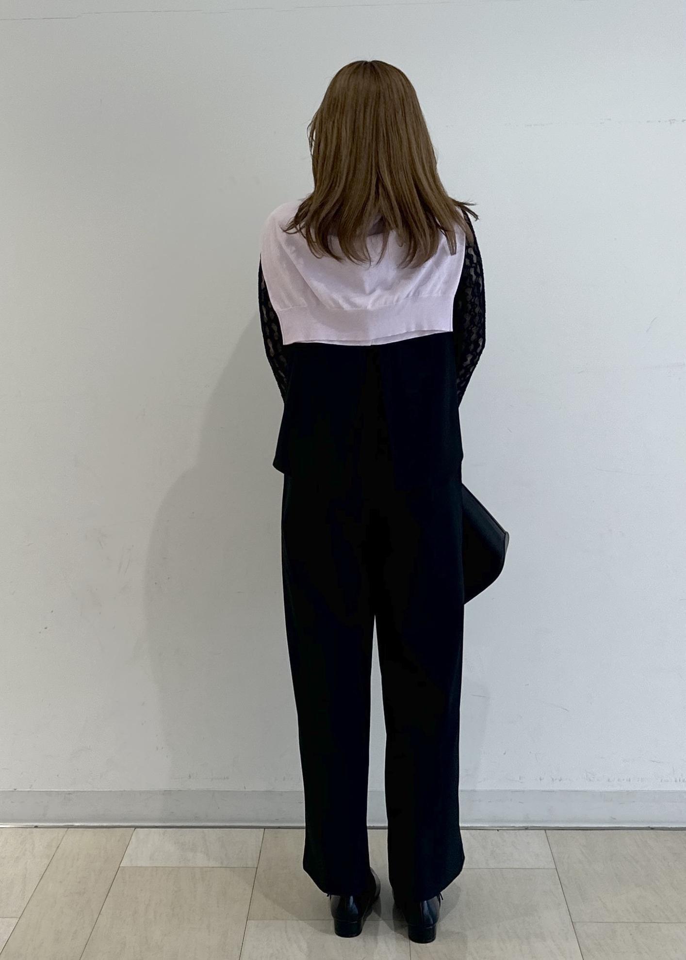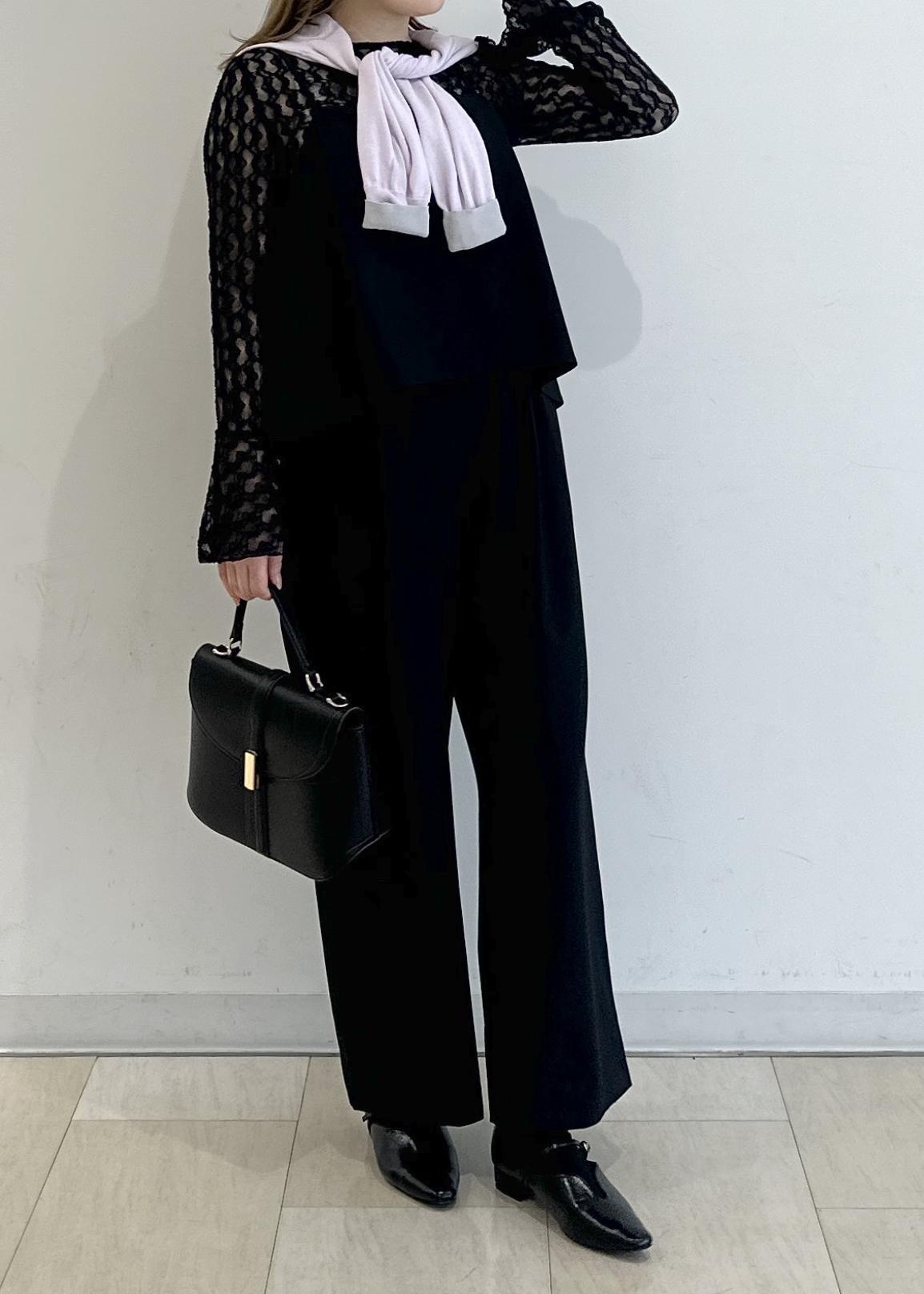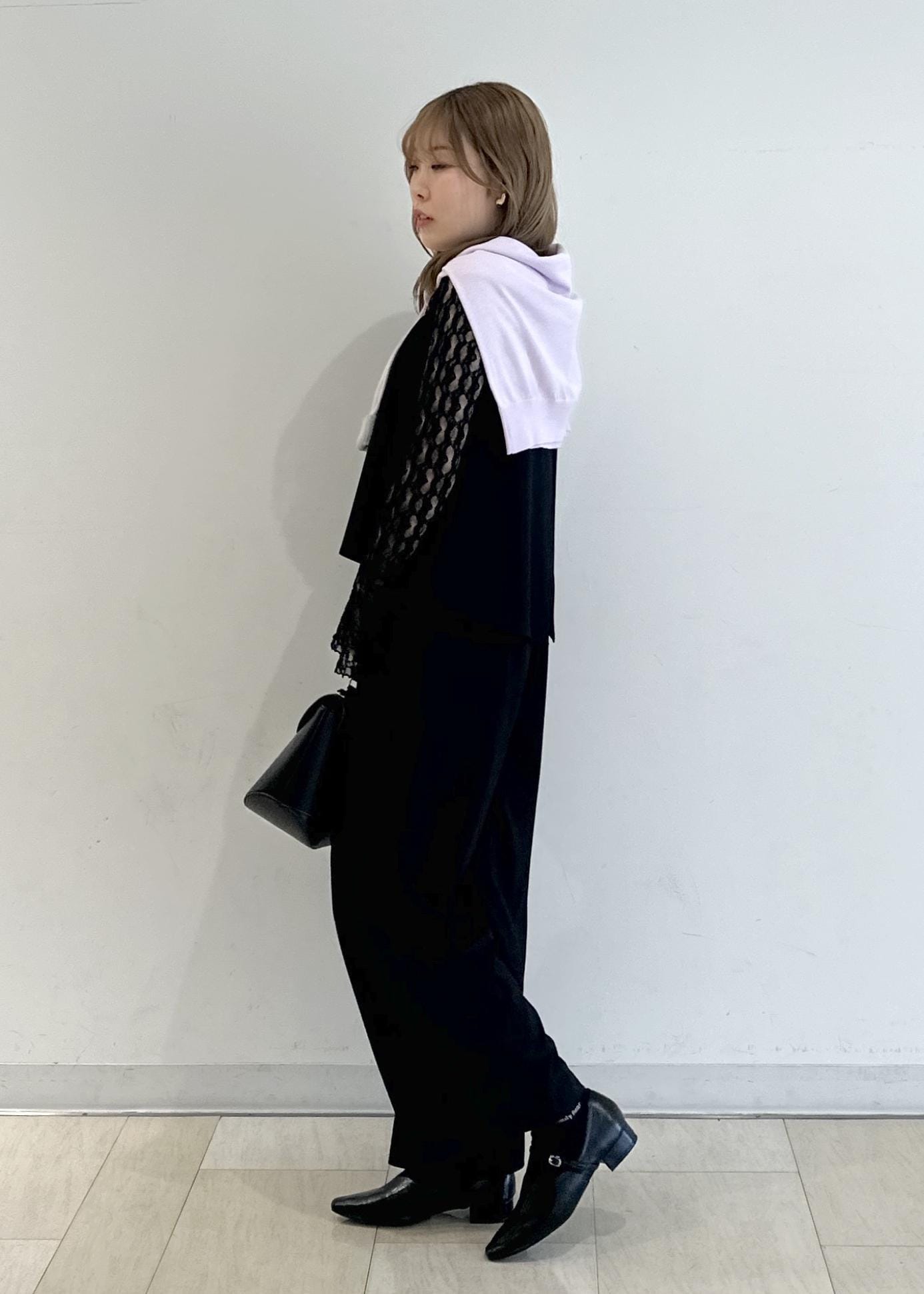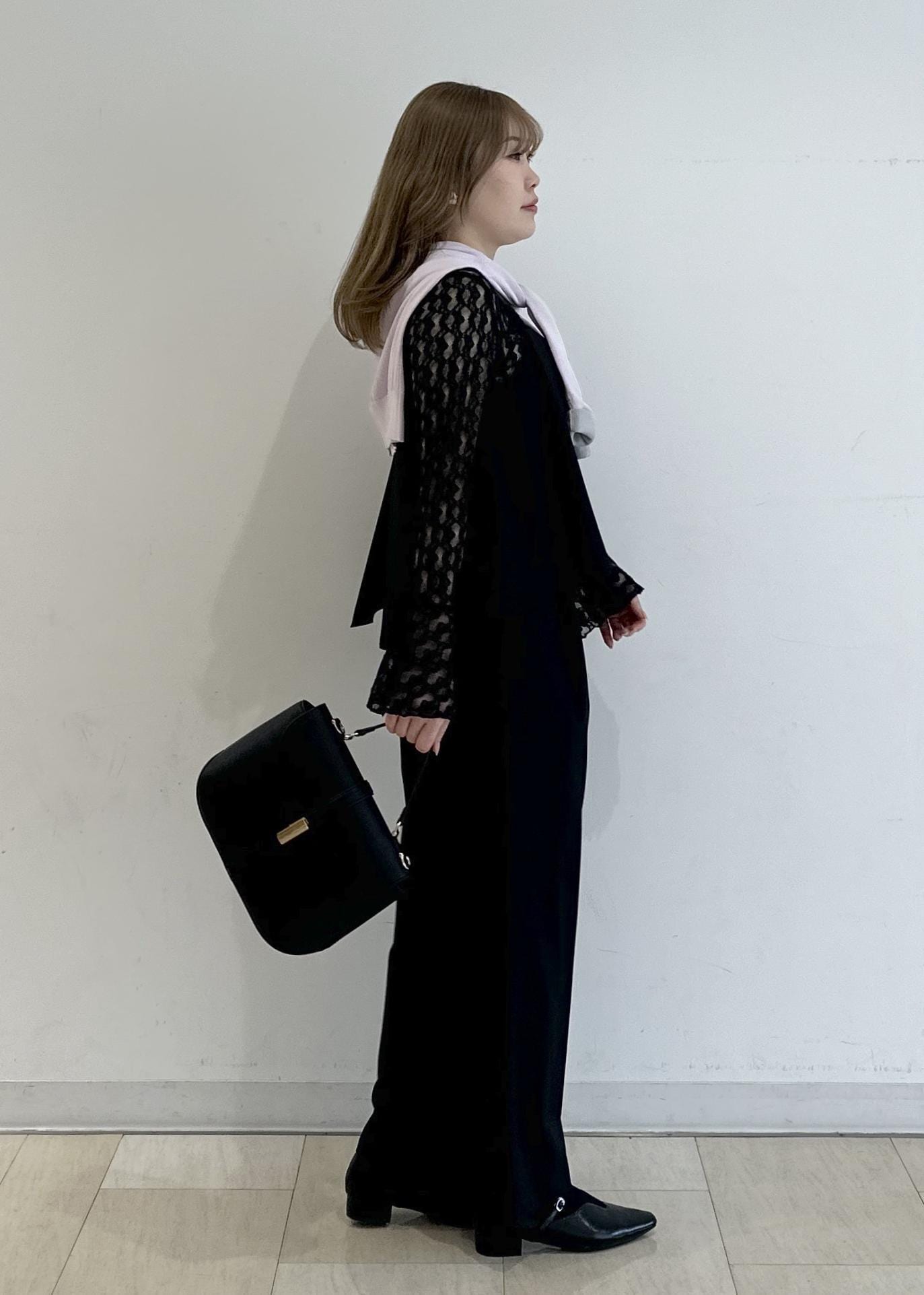オールブラックでかっこいいシルエットなのですが、インナーにシアーのベルスリーブを持ってきたり、ピンクのカーデを肩掛けにすることで上品な女性らしい雰囲気を作ってます!