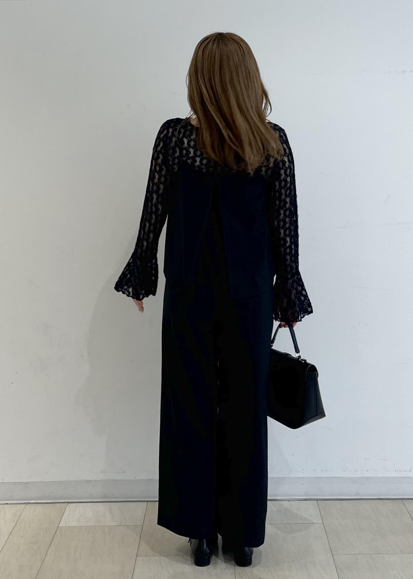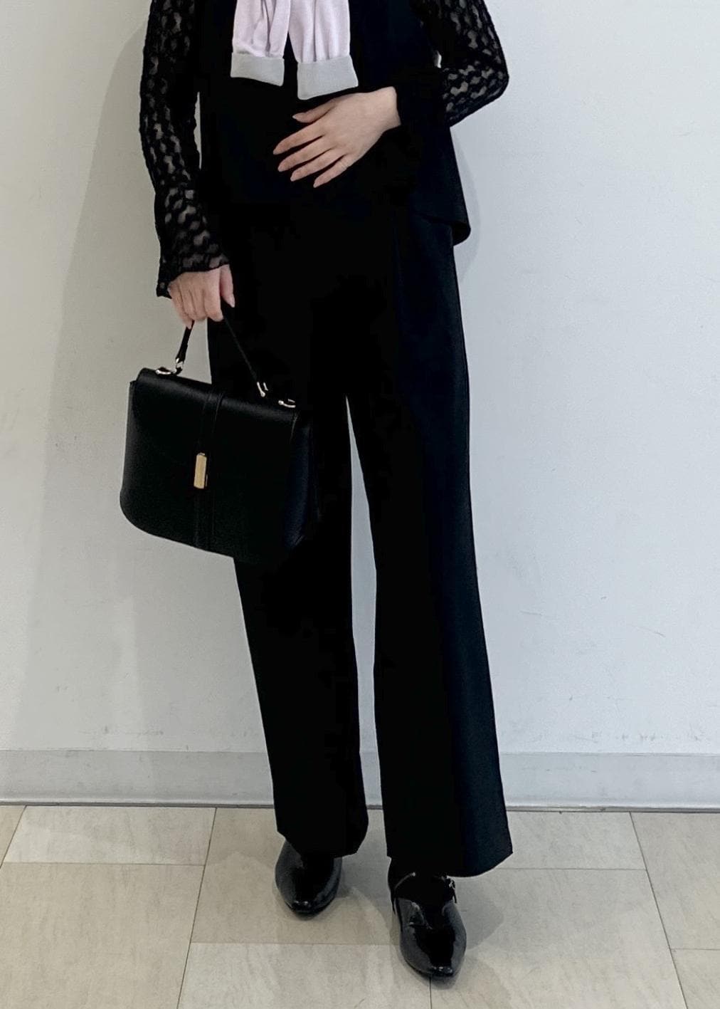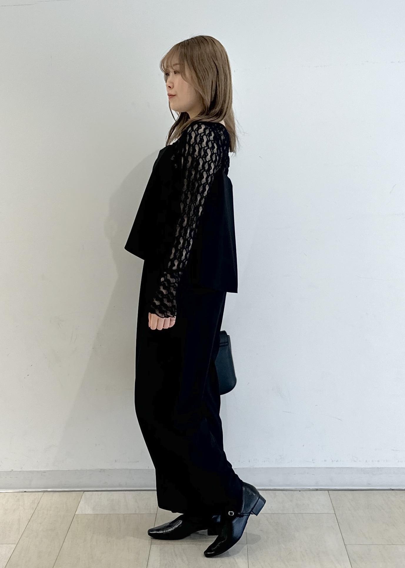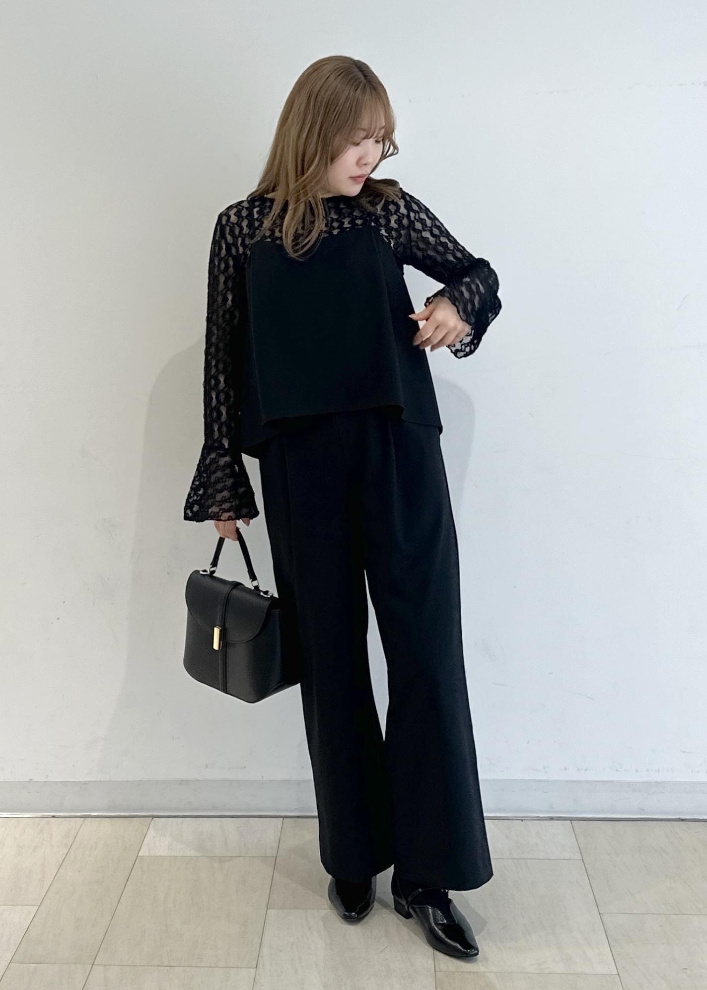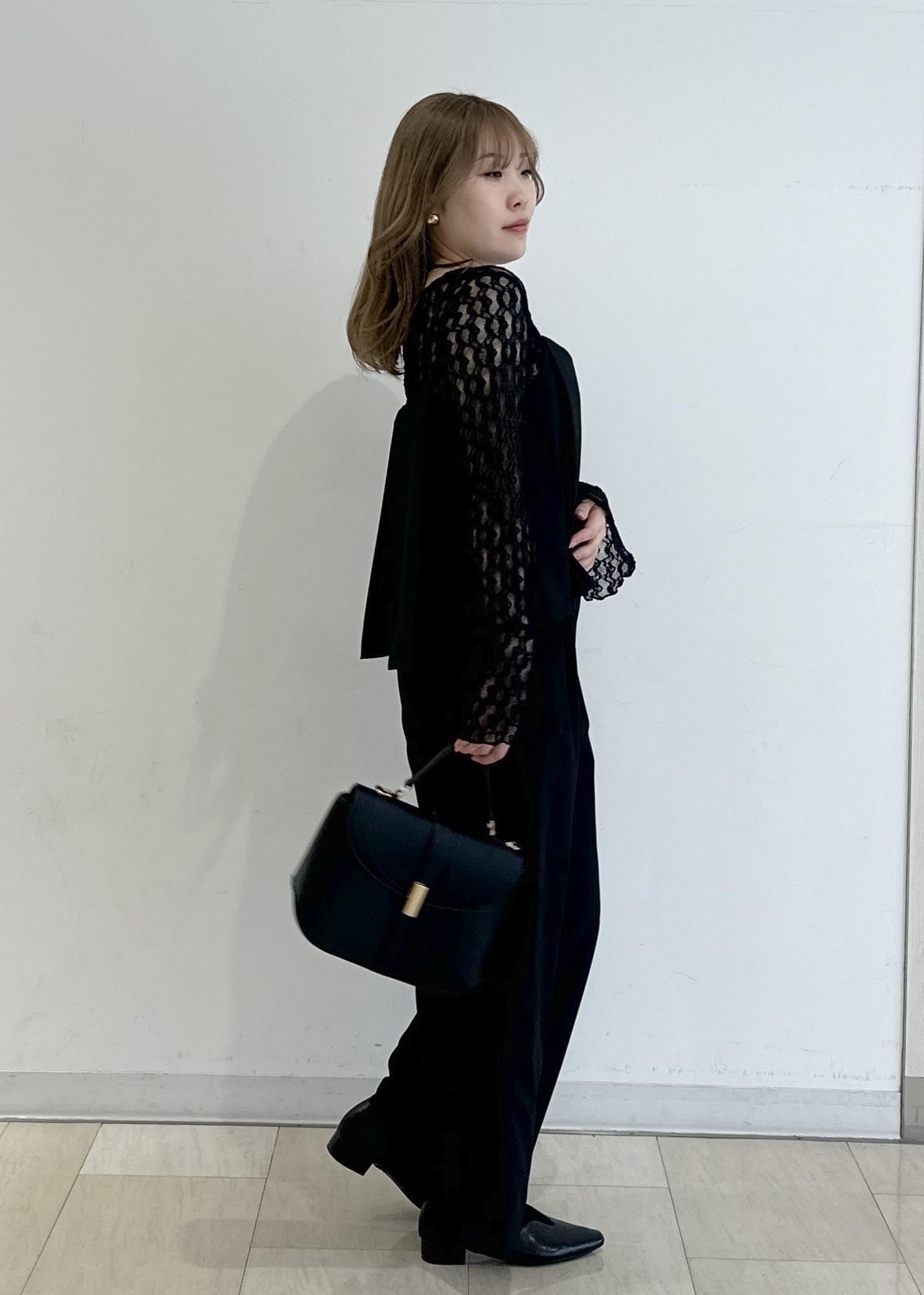 オールブラックでかっこいいシルエットなのですが、インナーにシアーのベルスリーブを持ってきたり、ピンクのカーデを肩掛けにすることで上品な女性らしい雰囲気を作ってます!