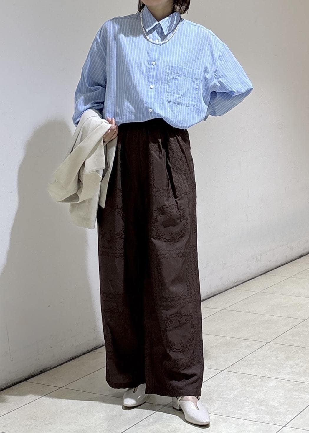 ブルーシャツにブラウンの刺繍パンツを合わせた