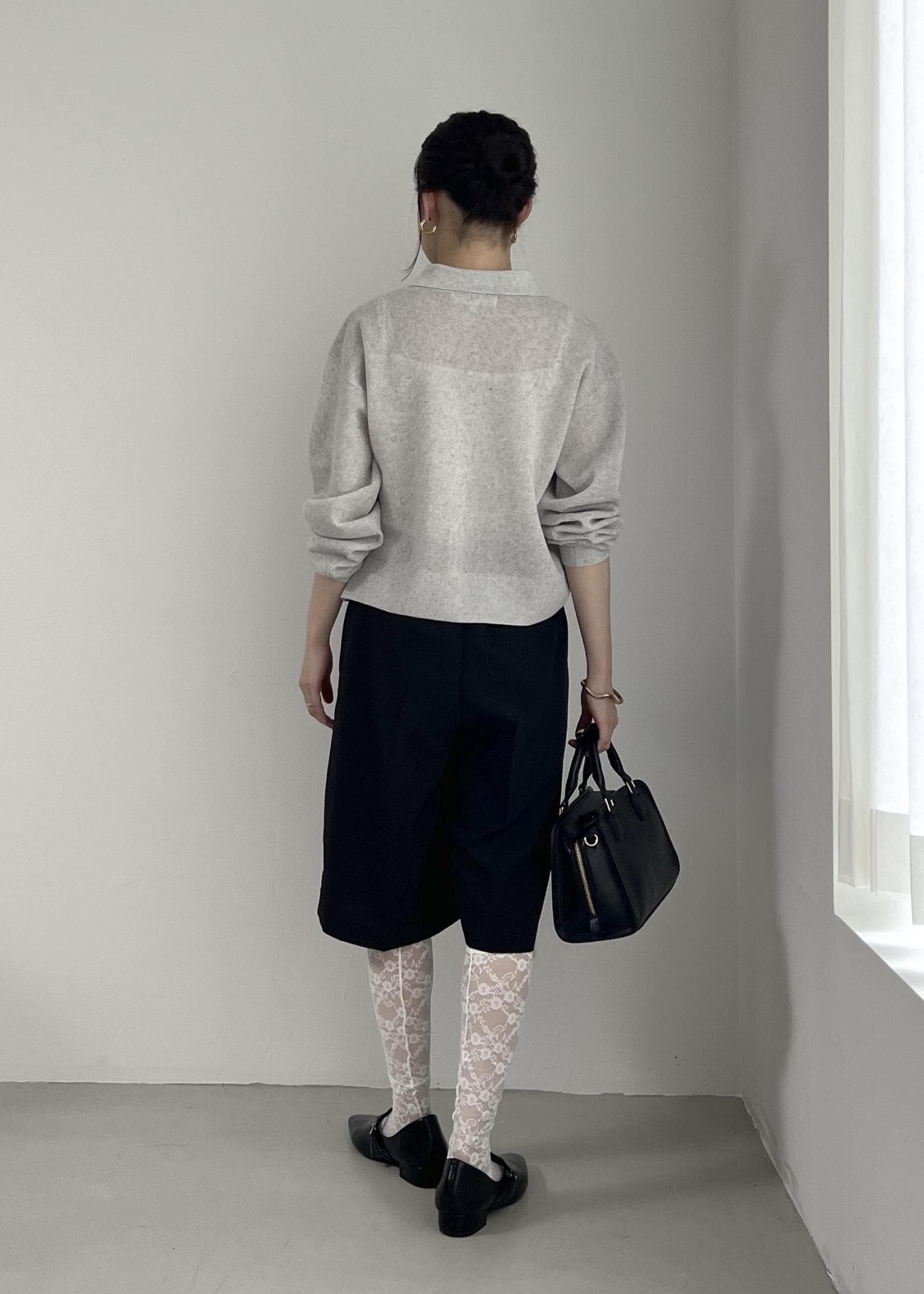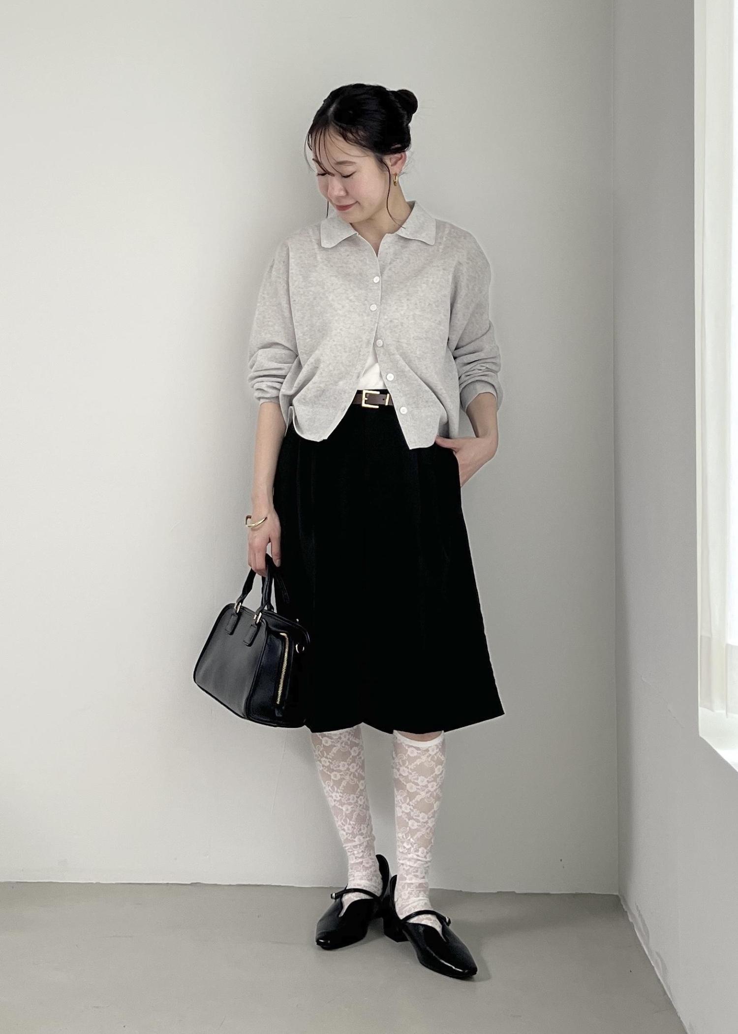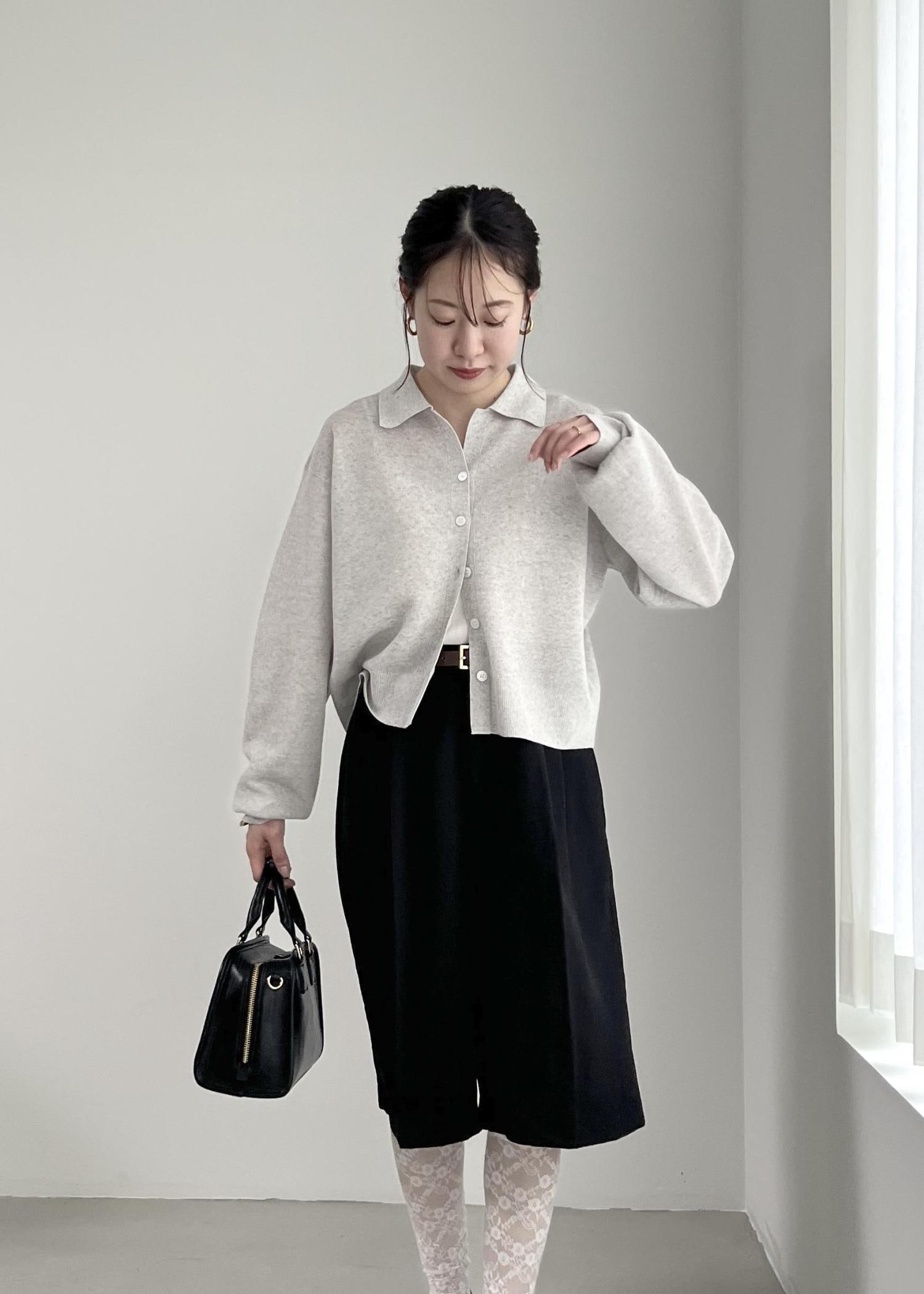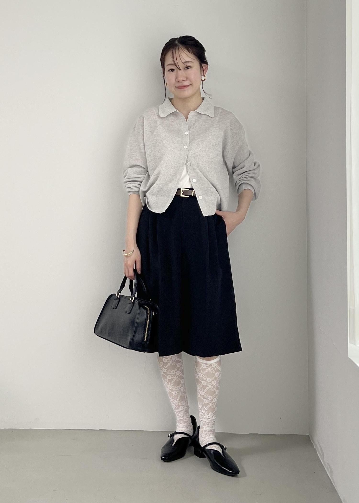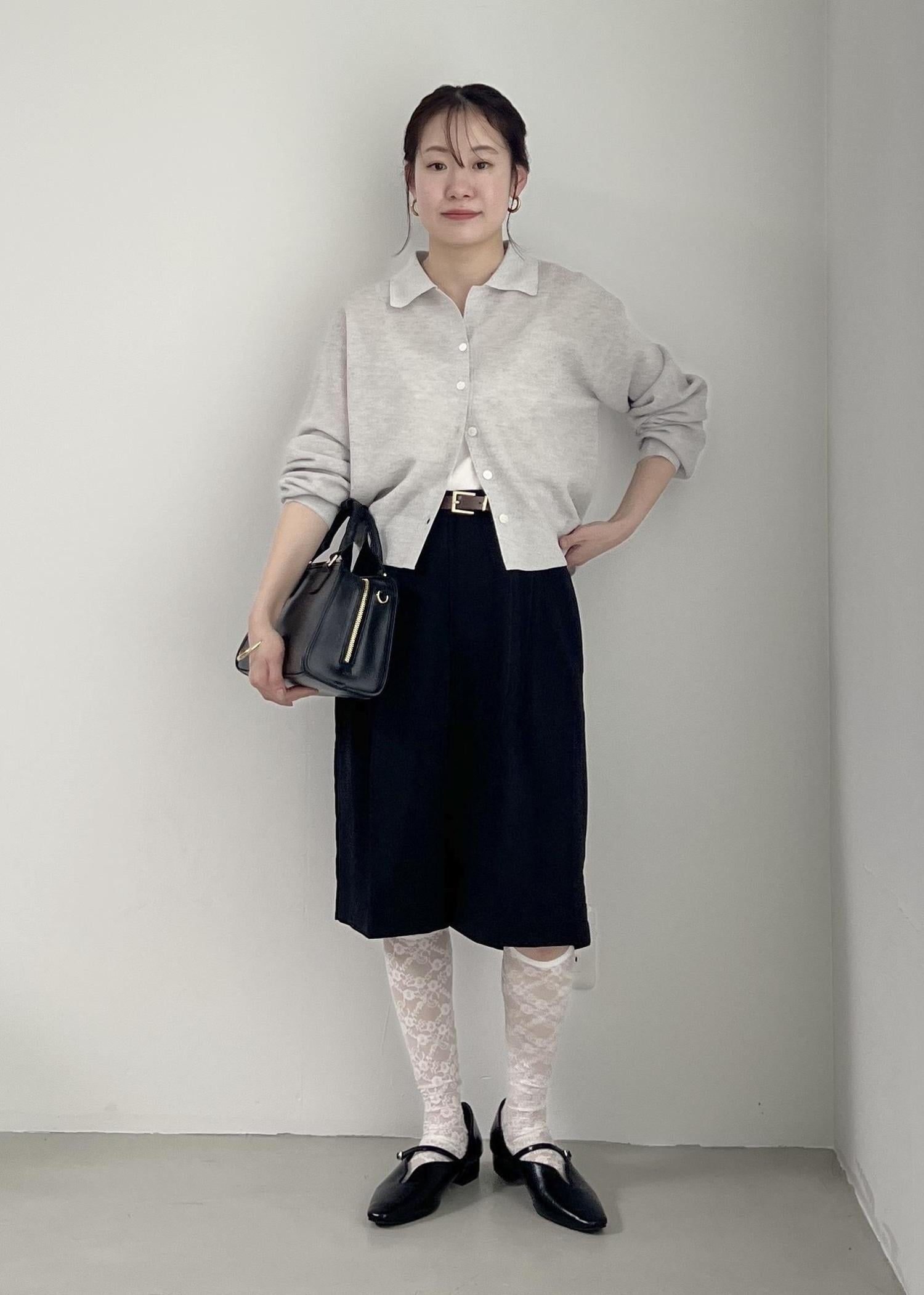 グレーのカーディガンとブラックのハーフパンツで、モノトーンコーデに。