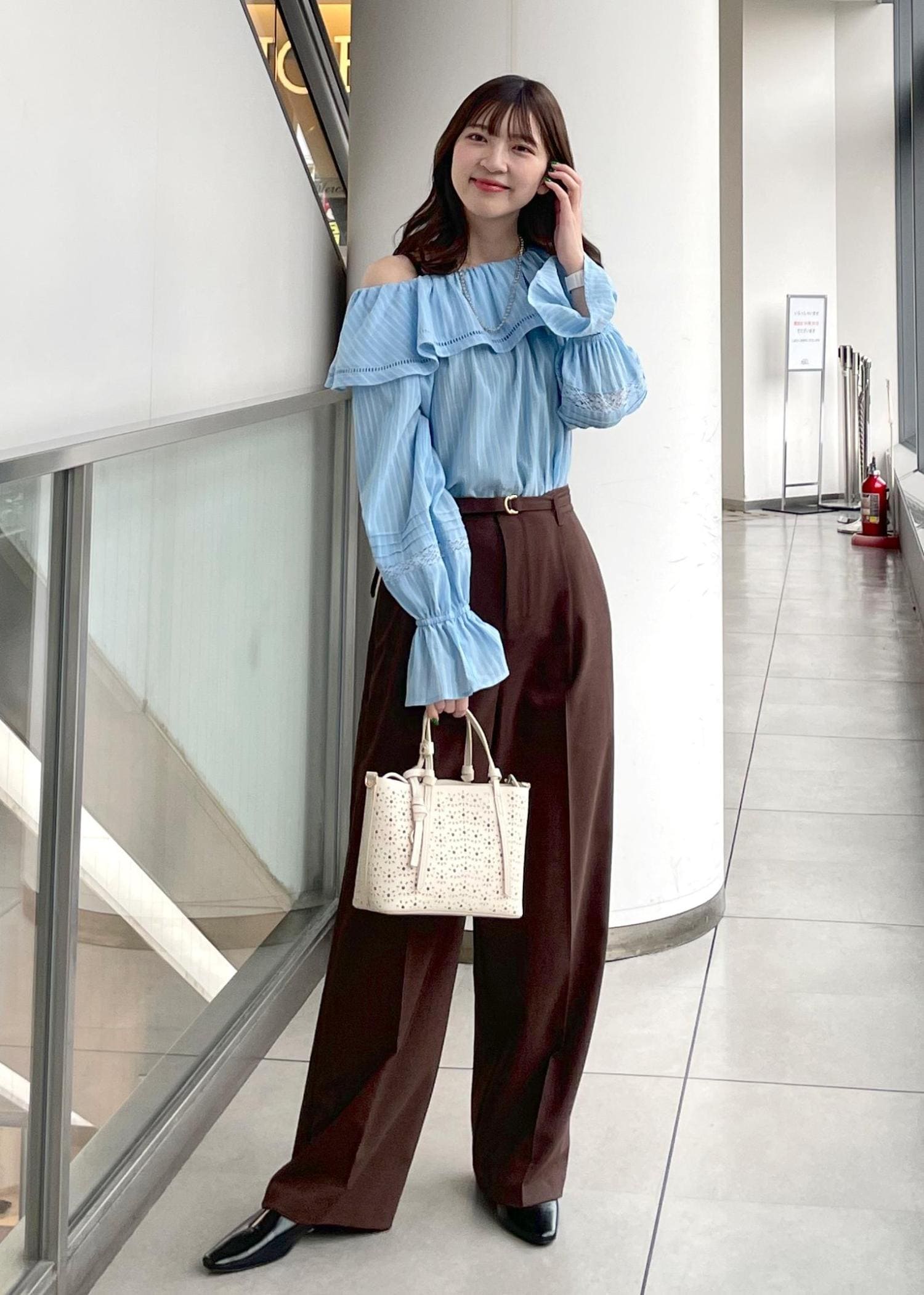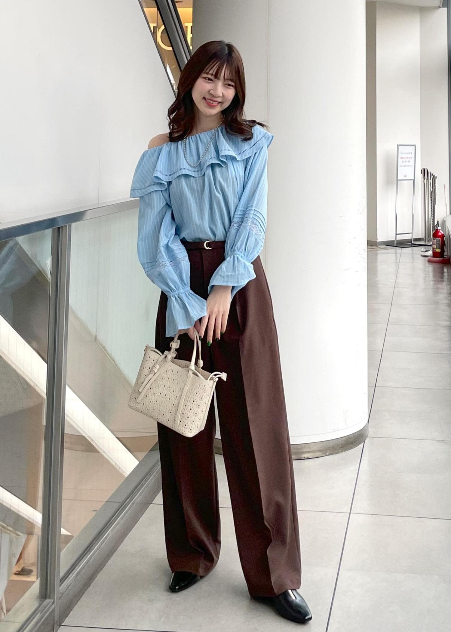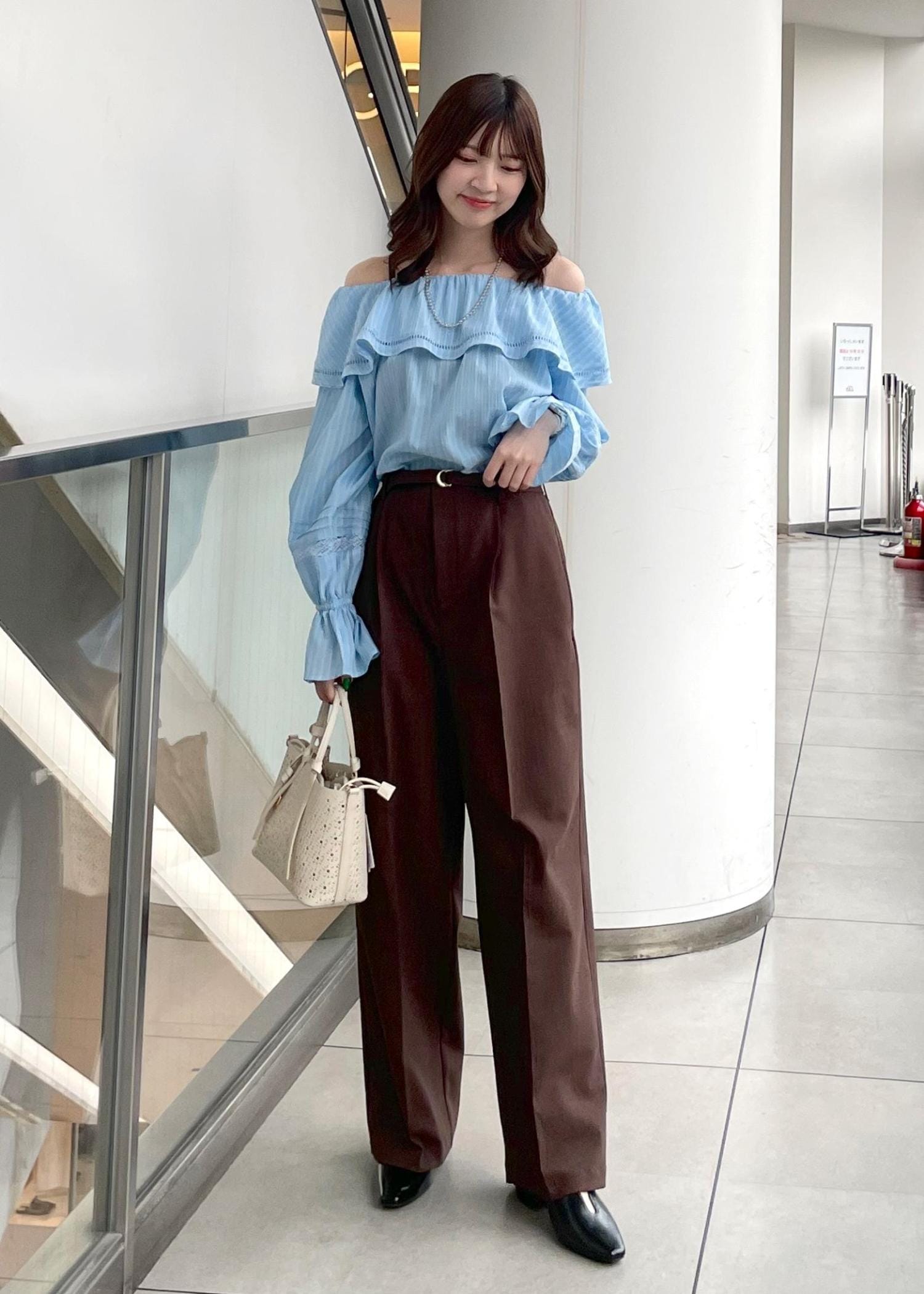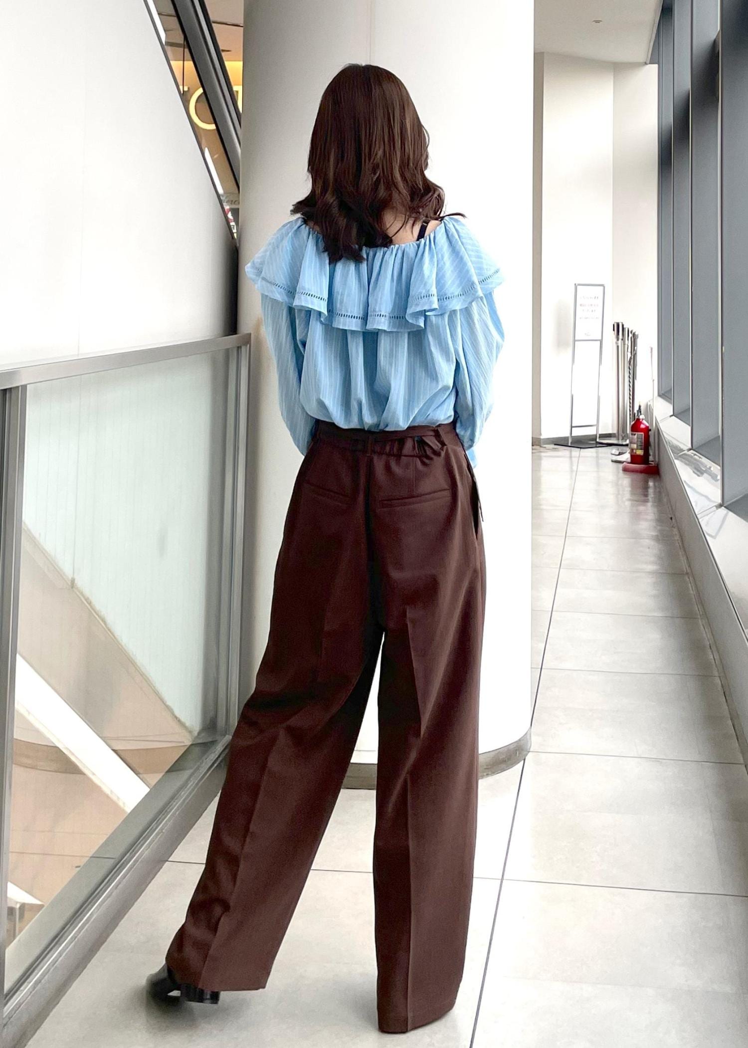 ラッフルブラウスをオフショルスタイルで着用しました。(様々な着方をしています♪)オフショルでヘルシーな肌見せが叶います。ベーシックなスタイルやワンショルスタイルも可愛くてオススメです!