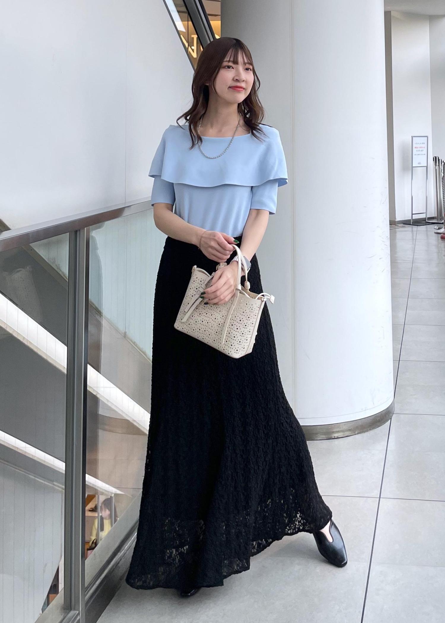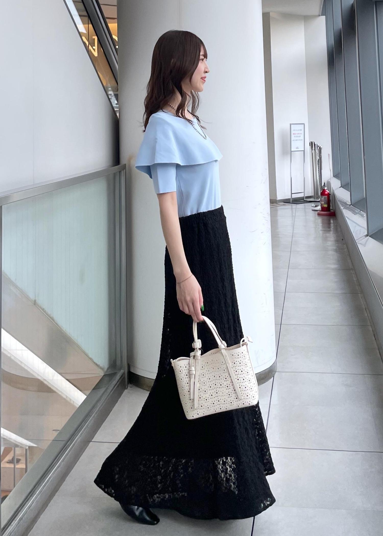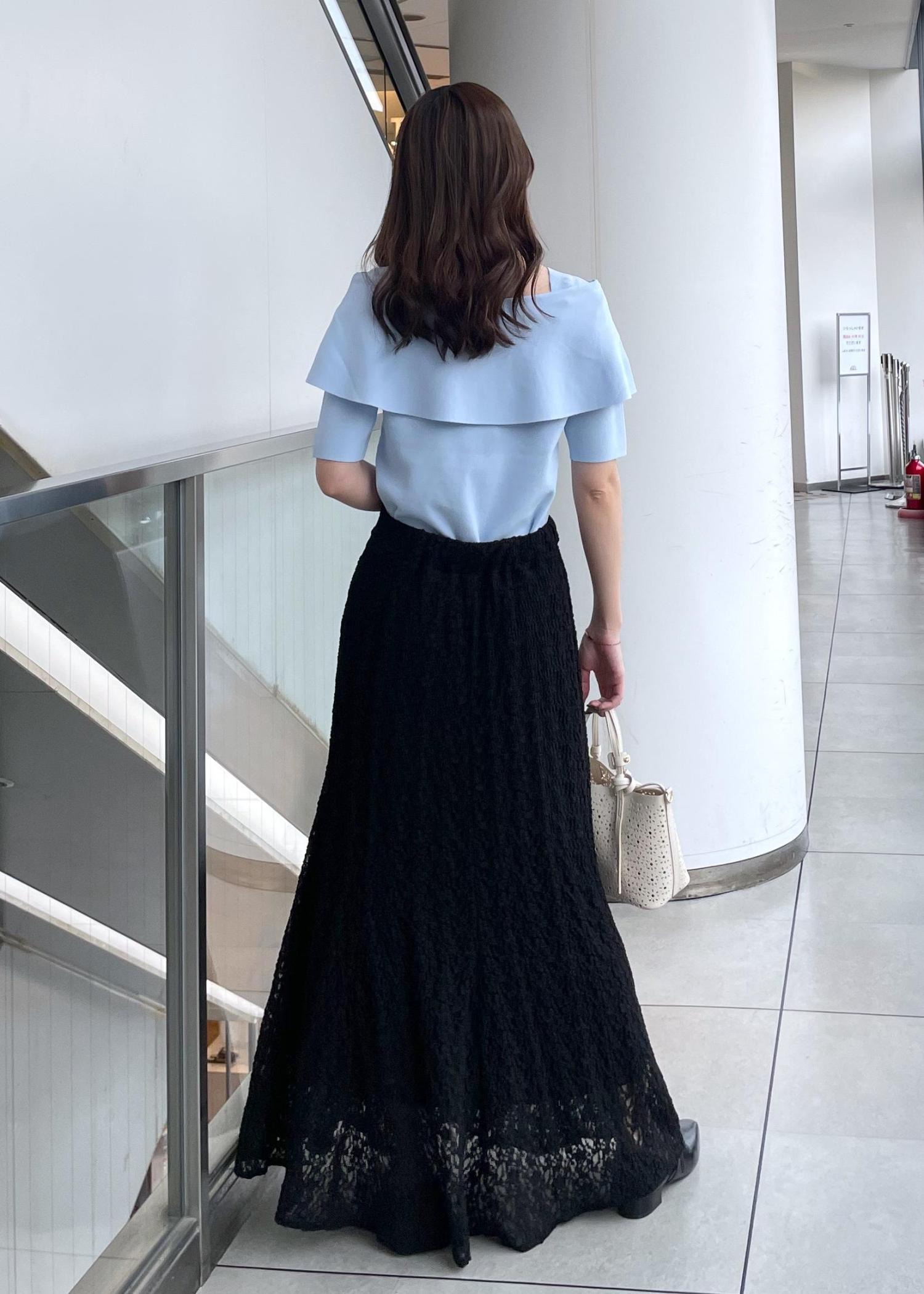 夏のお出かけにピッタリな爽やかスタイルにしました。ケープニットはマーメイドスカートとの相性が抜群で、スタイル良く見せてくれますよ。
