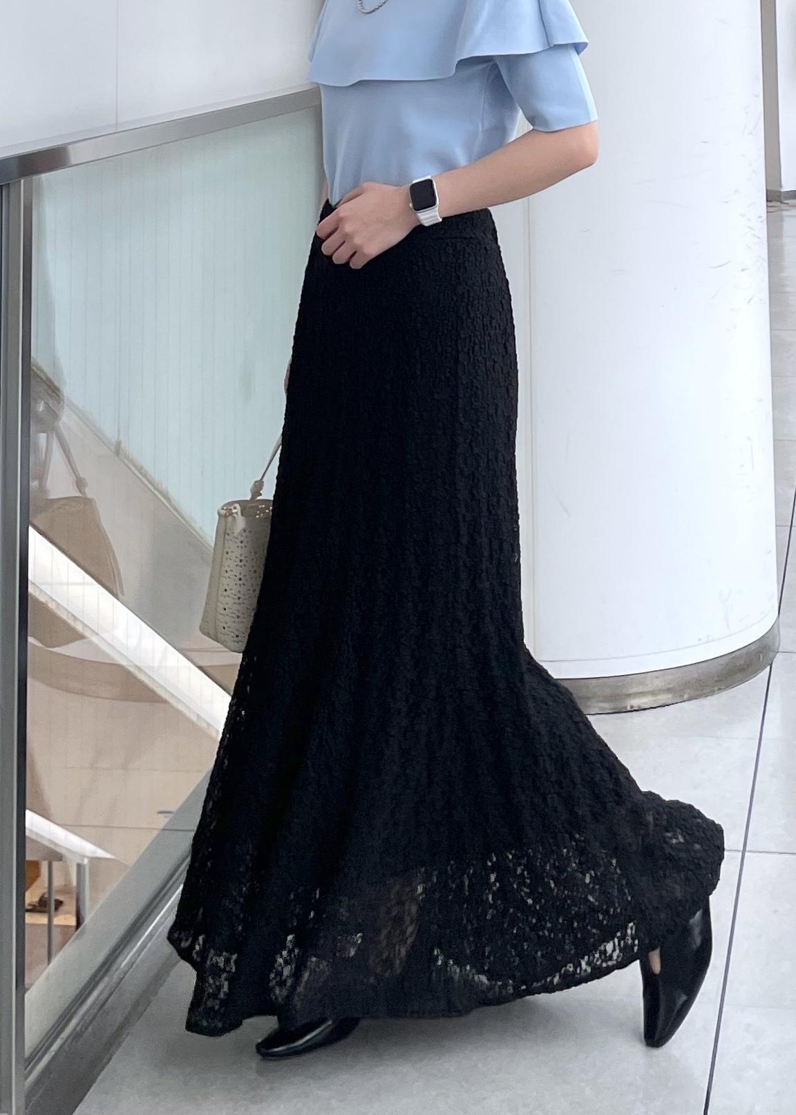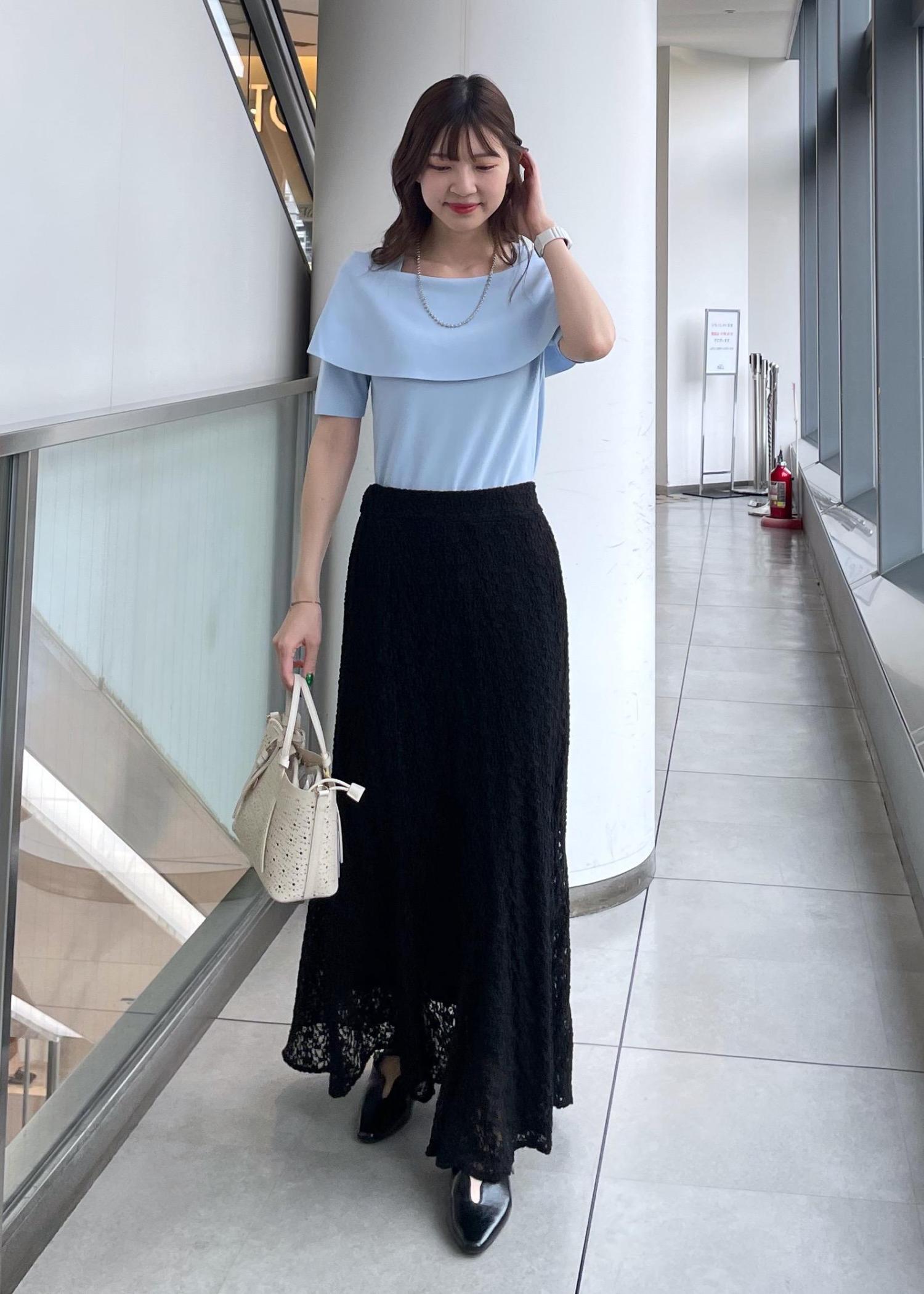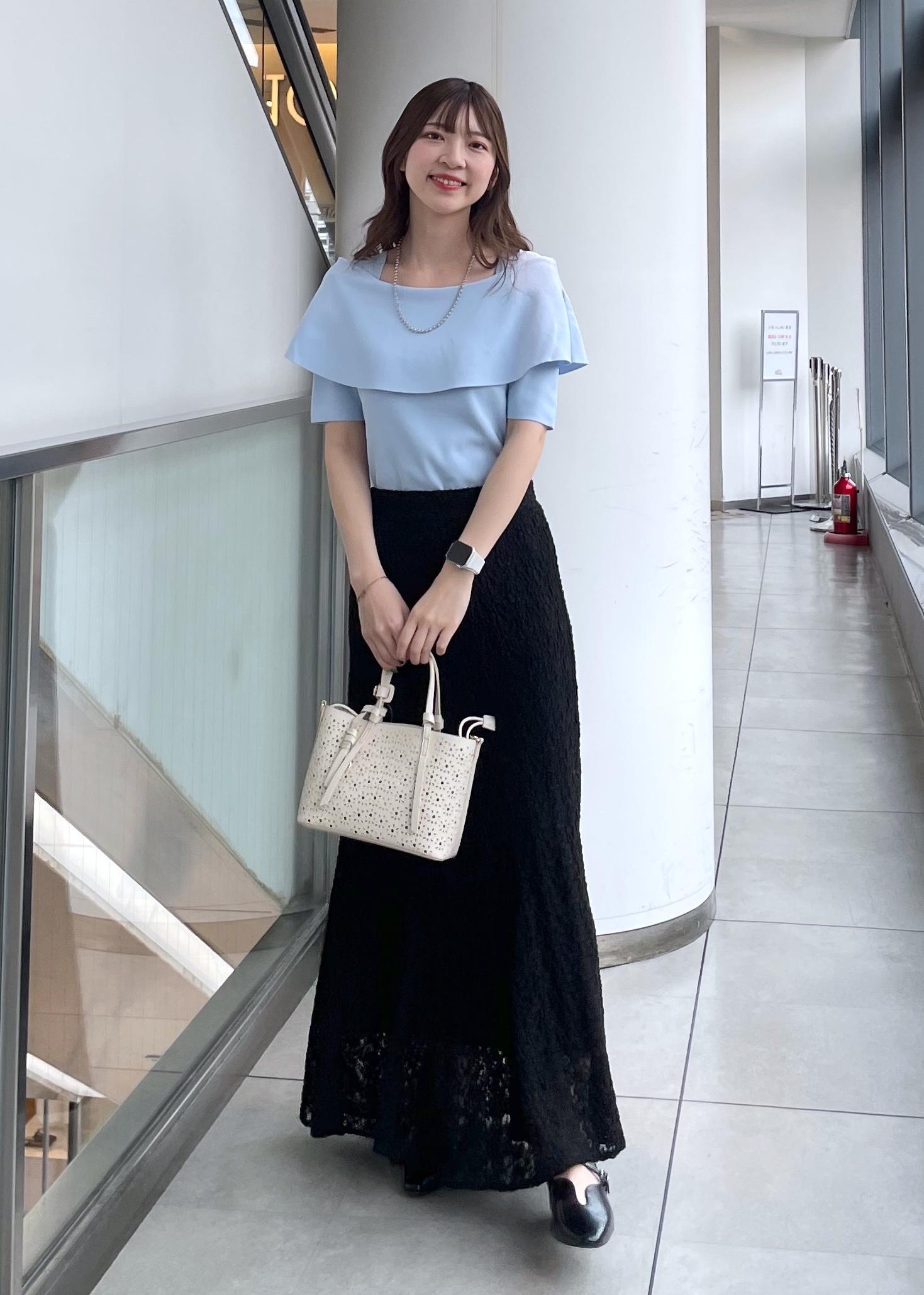 夏のお出かけにピッタリな爽やかスタイルにしました。ケープニットはマーメイドスカートとの相性が抜群で、スタイル良く見せてくれますよ。