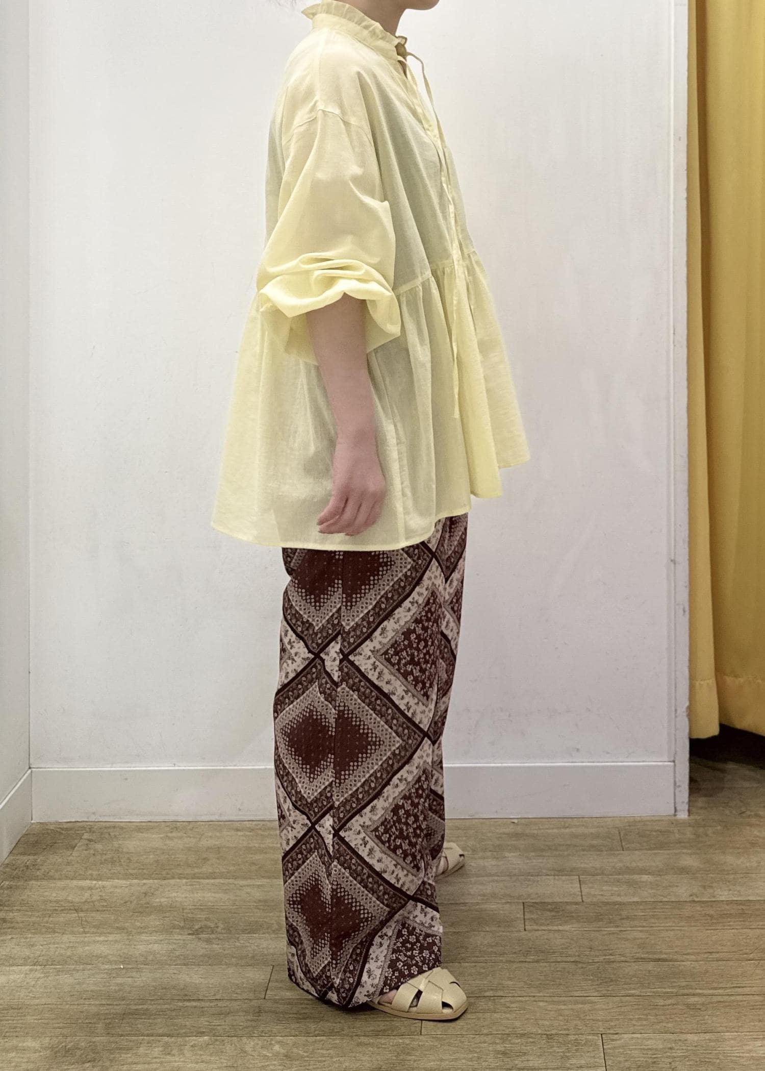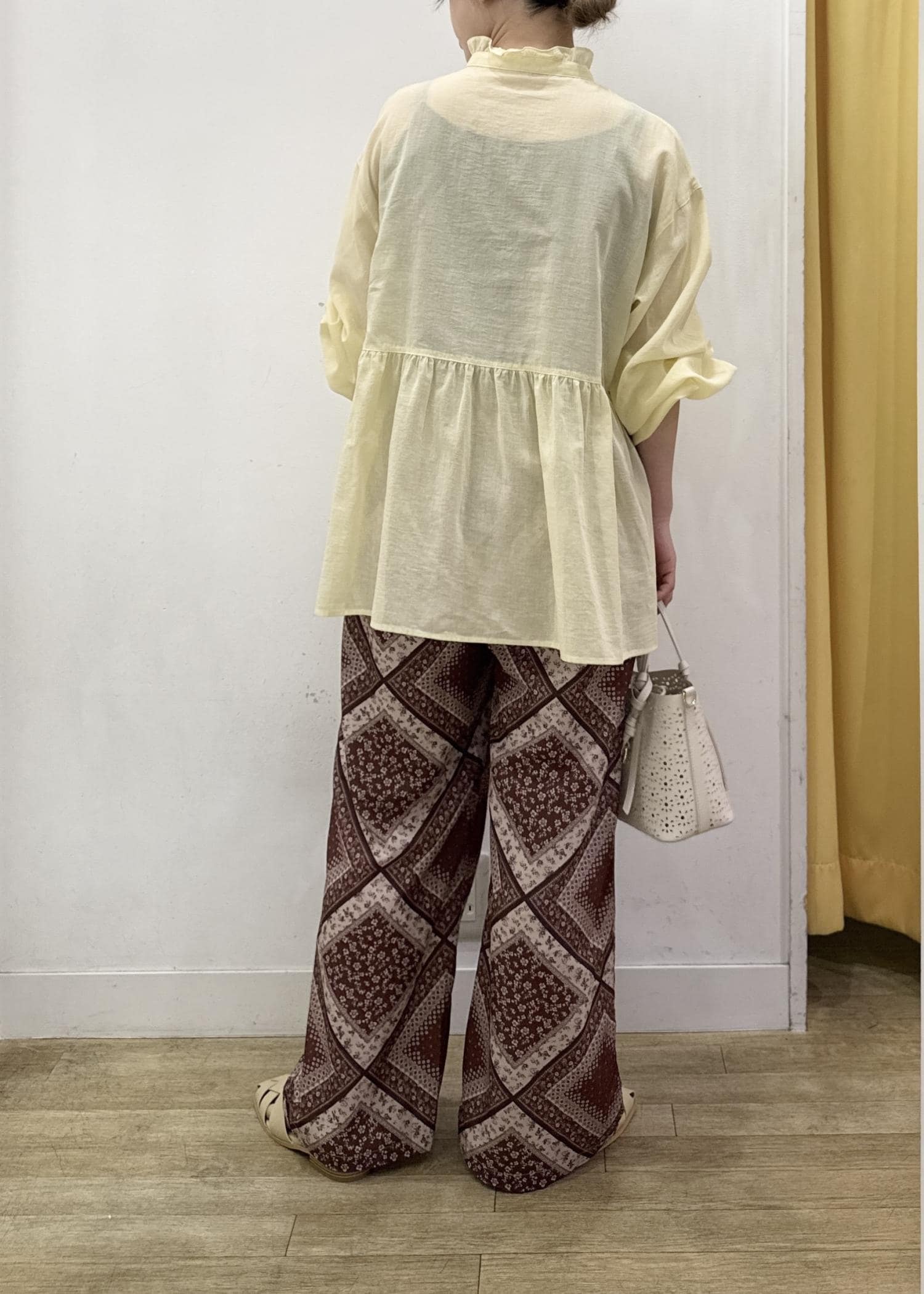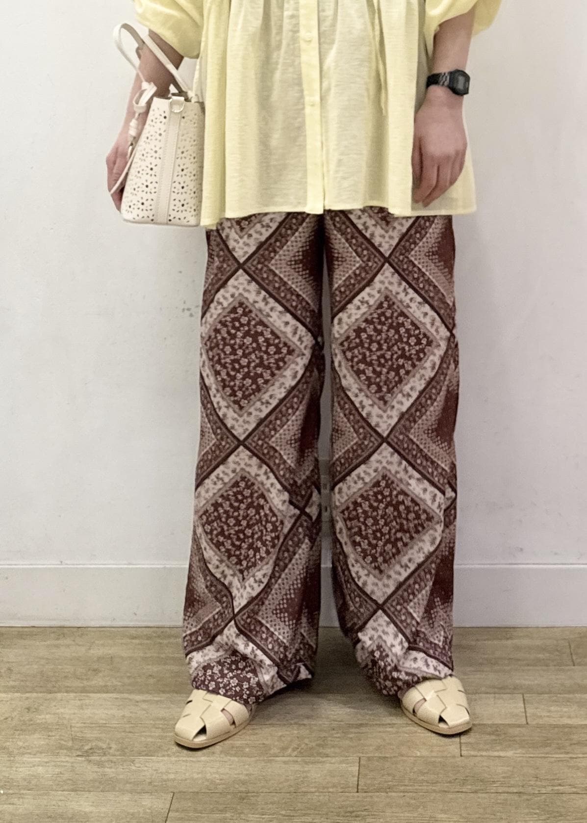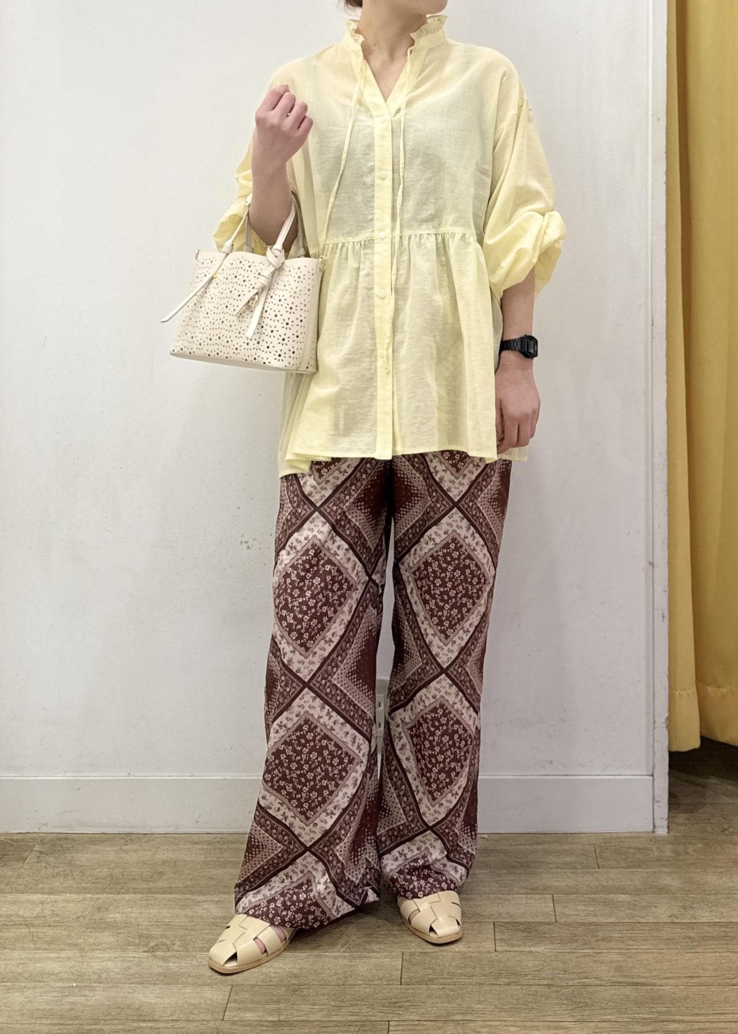 人気のイエローカラーのシャツに、スカーフ柄のパンツを合わせたラフなお出かけコーディネート!