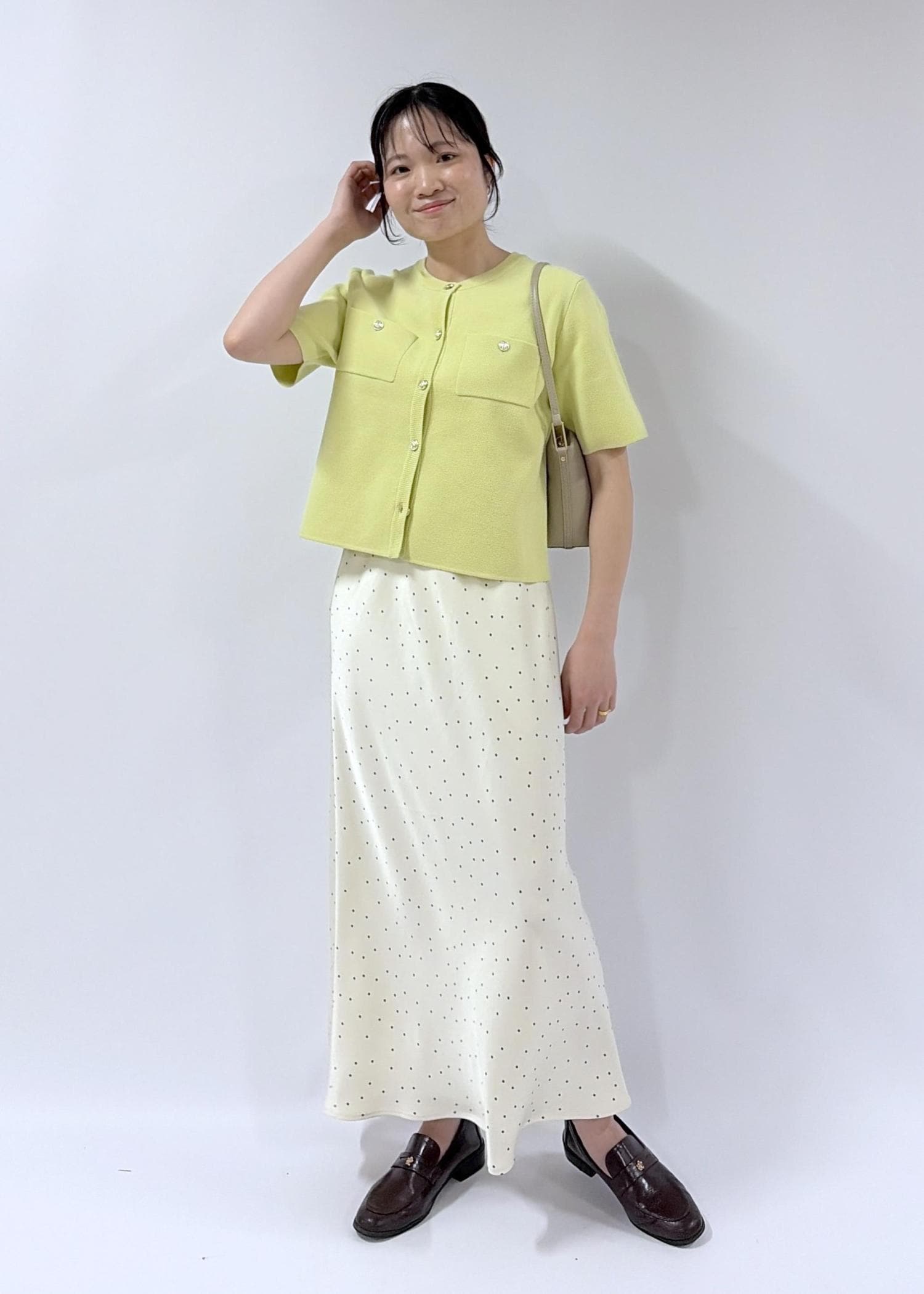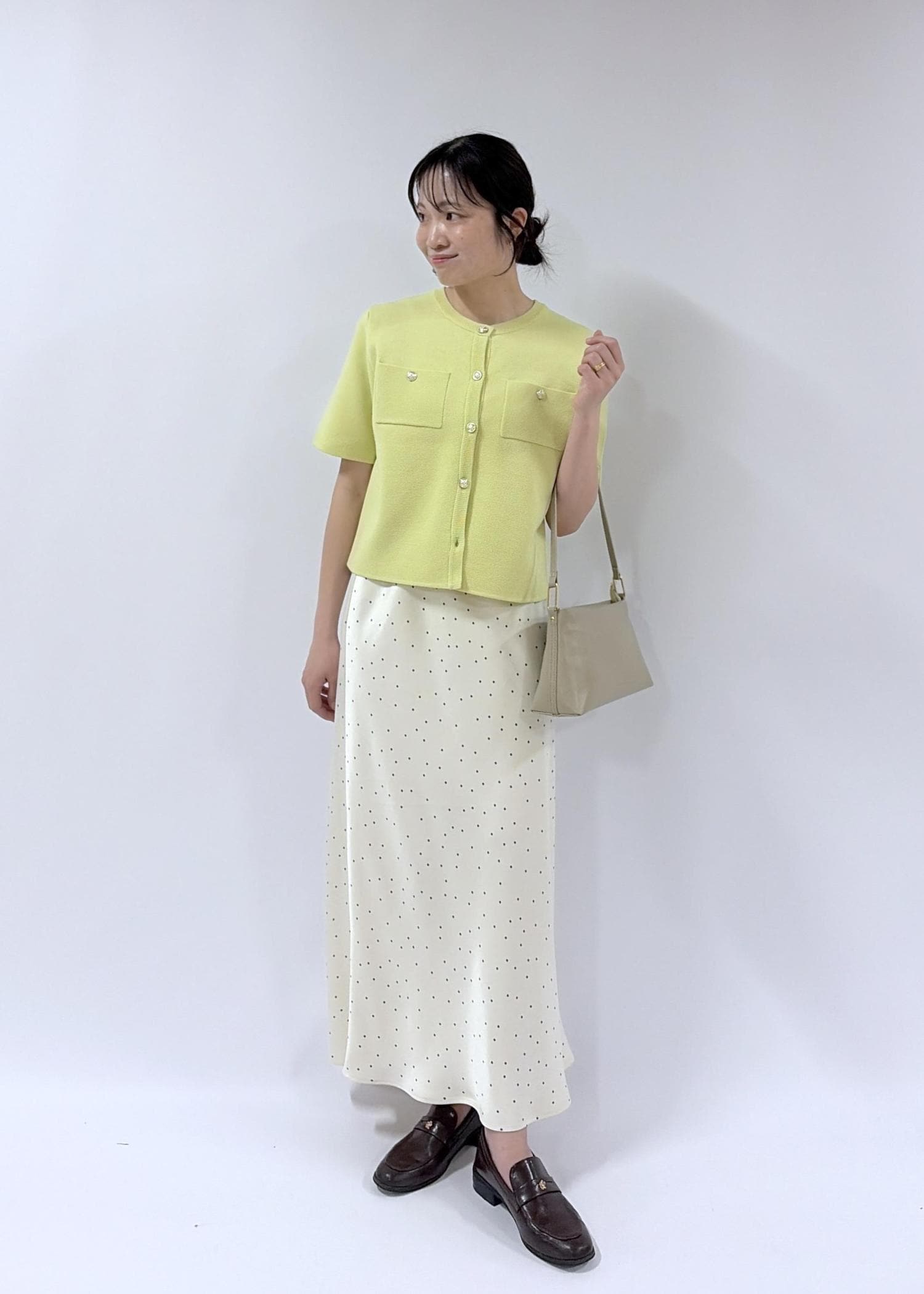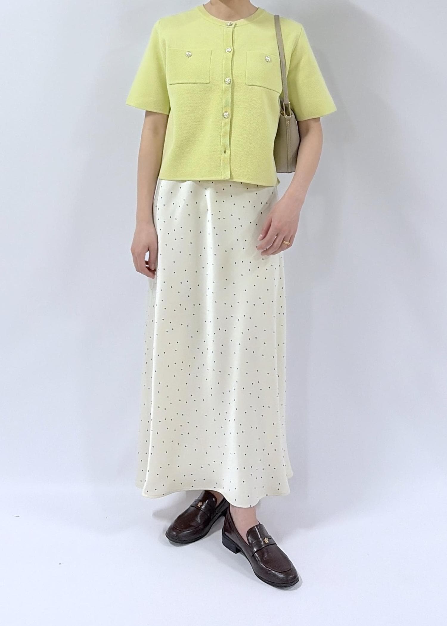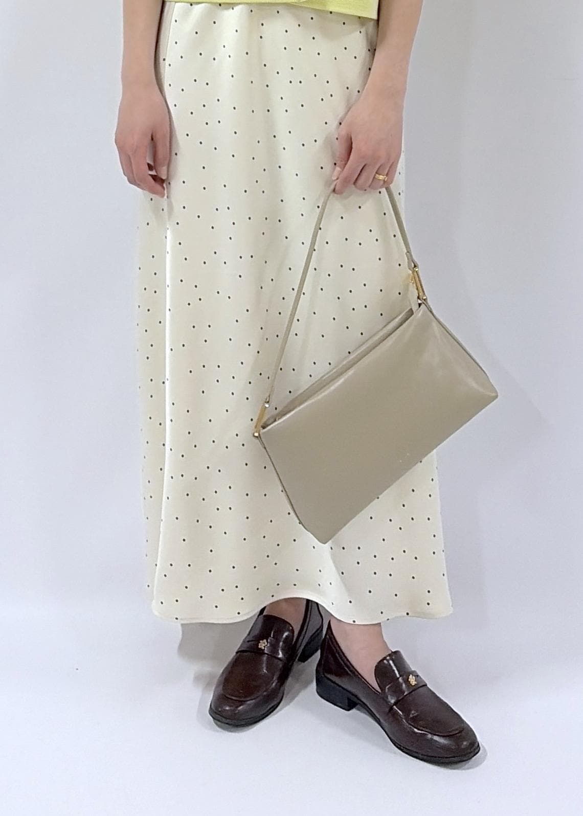 ROPÉ PICNIC細見えバイアスサテンドットスカートキナリ系 / F¥6,490レビュートレンドのドット柄。細かい柄なので落ち着いた印象で着られます。裏地はないがそこまで透け感がなく着ることが出来ました。身長は160cmで足首までくる丈です。