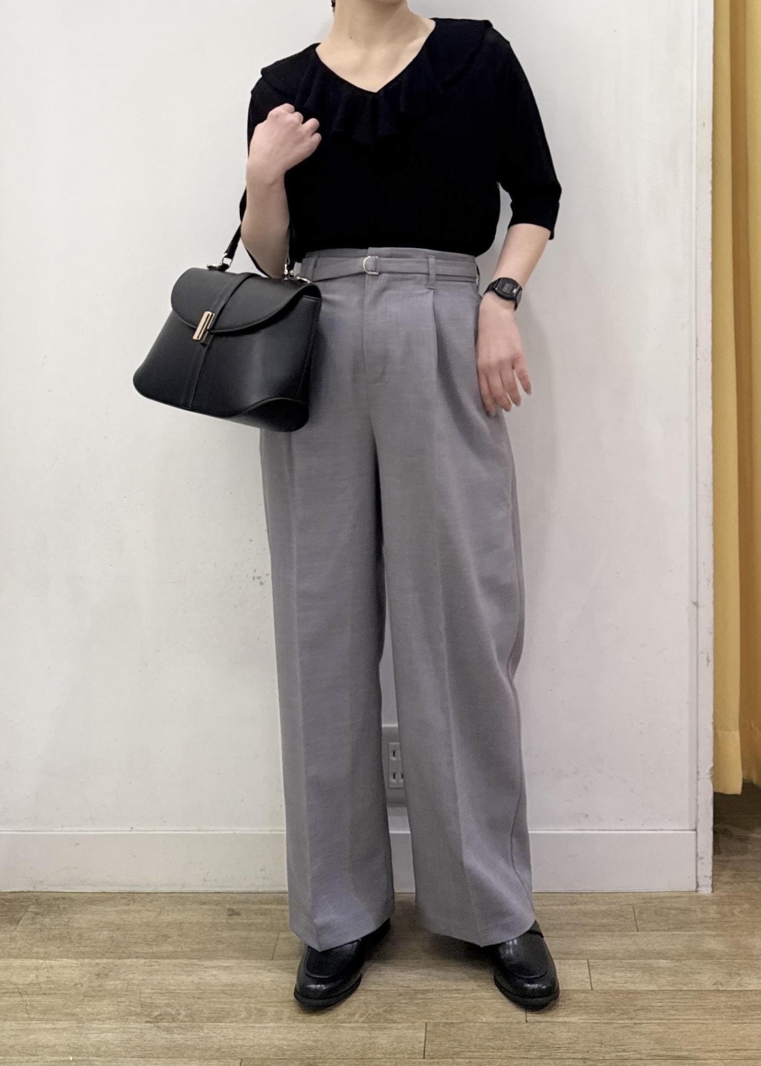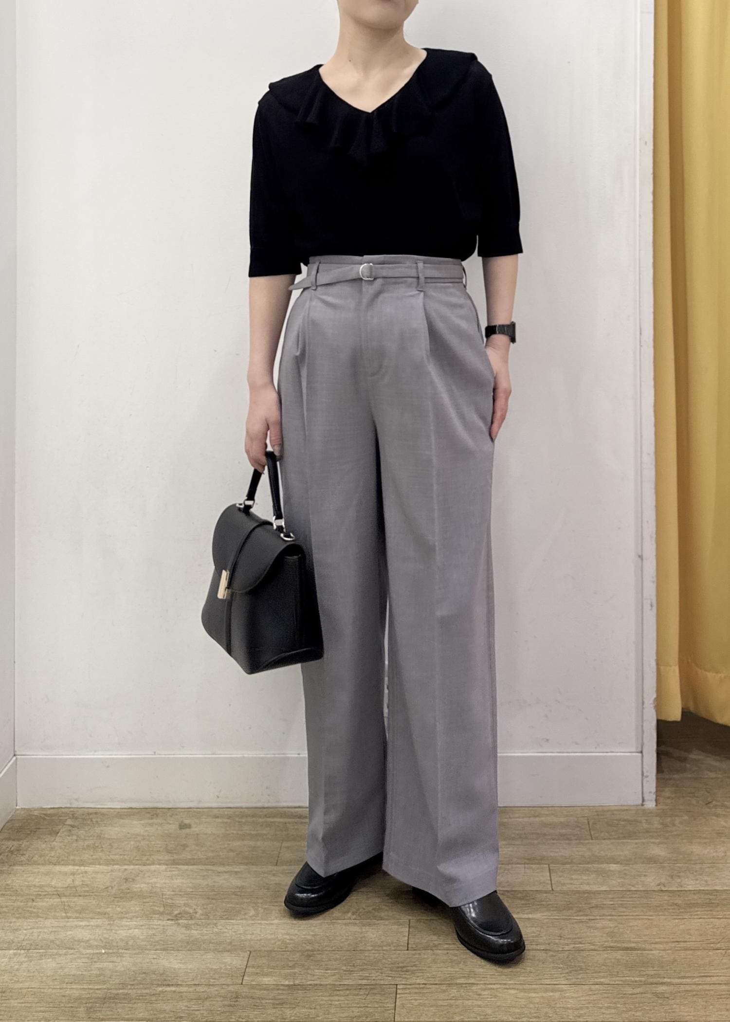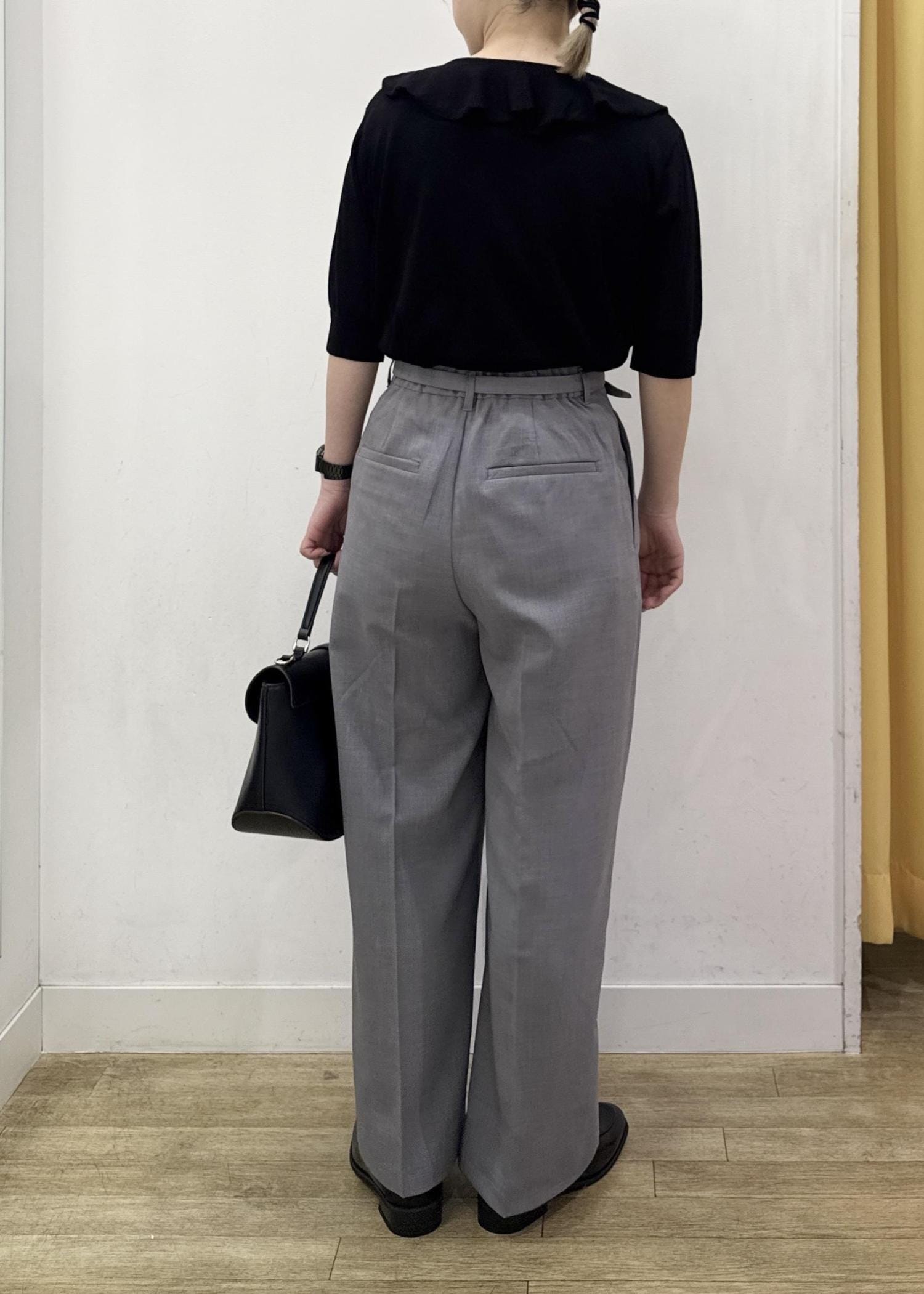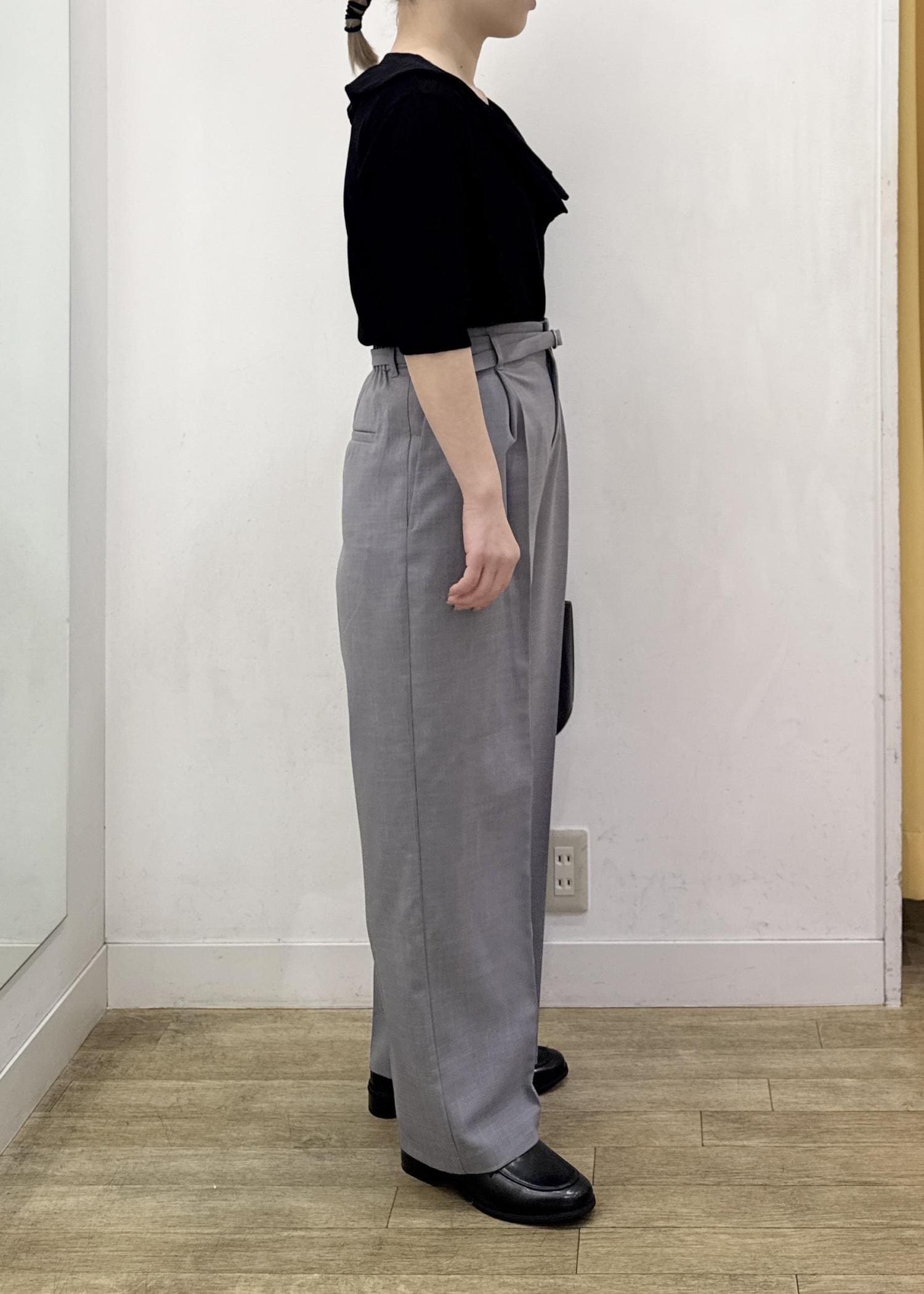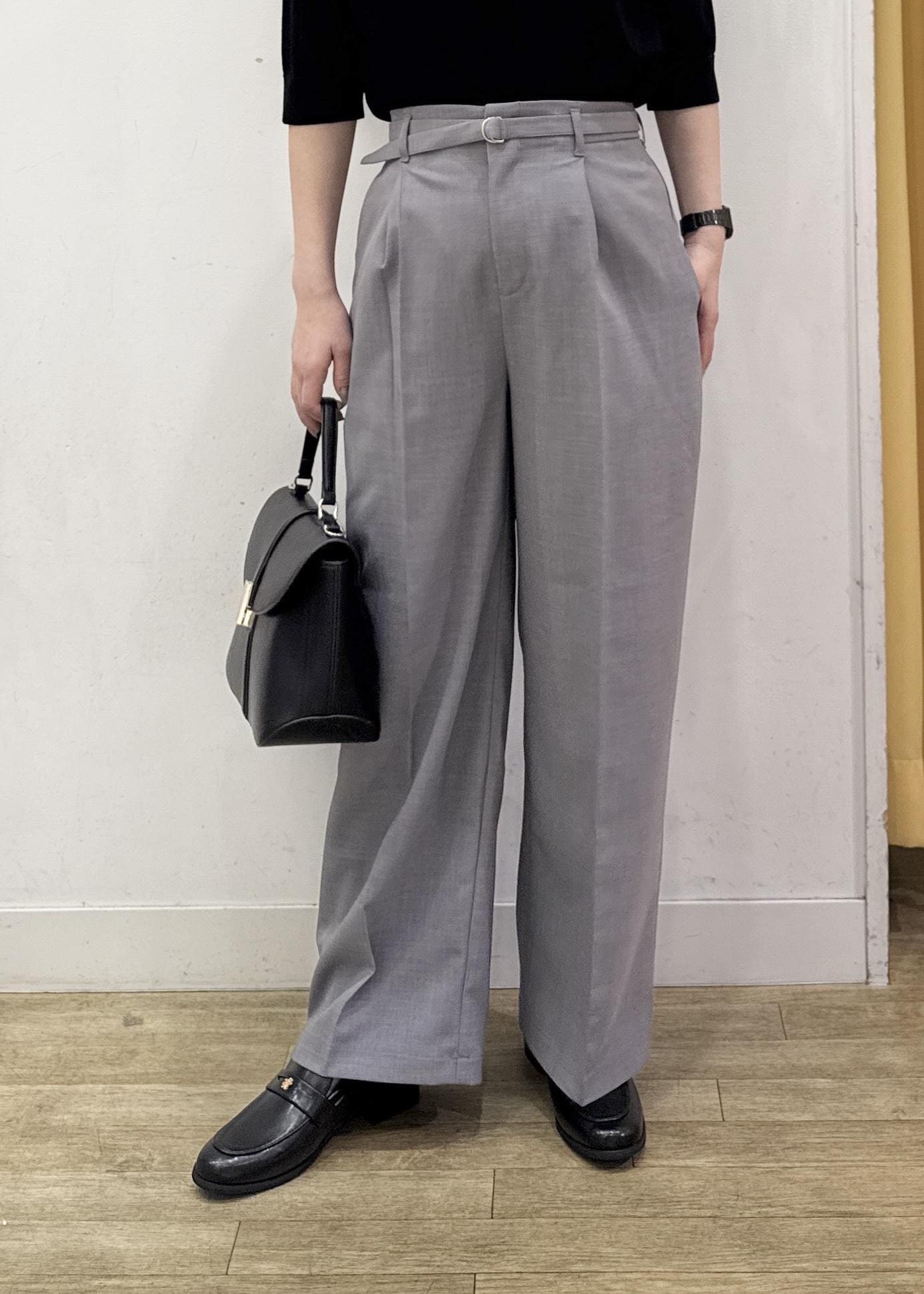 広がり過ぎないストレートめなワイドパンツはセンターライン入りとハイウエストなデザインでスッキリ見えするシルエットになります。 -