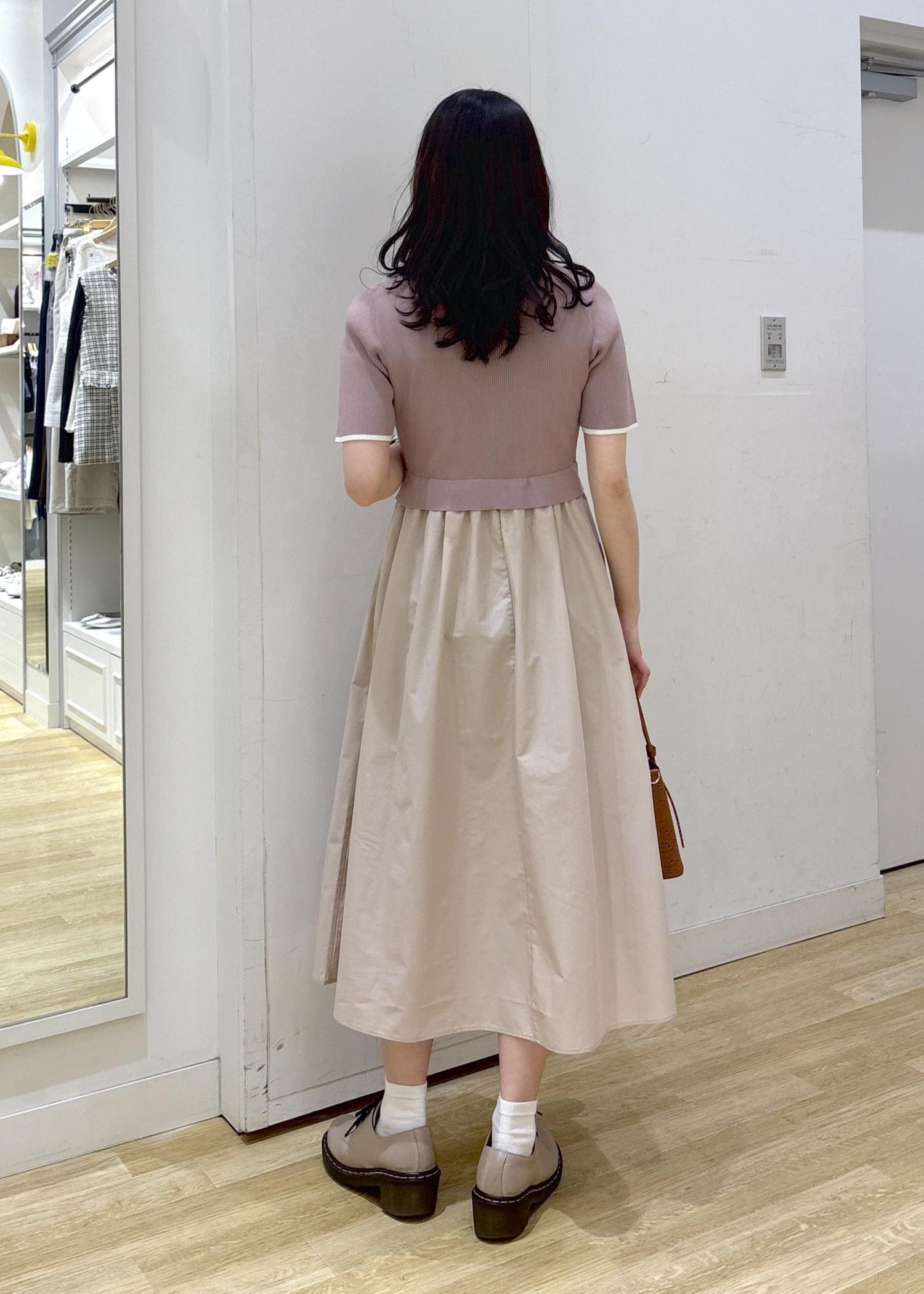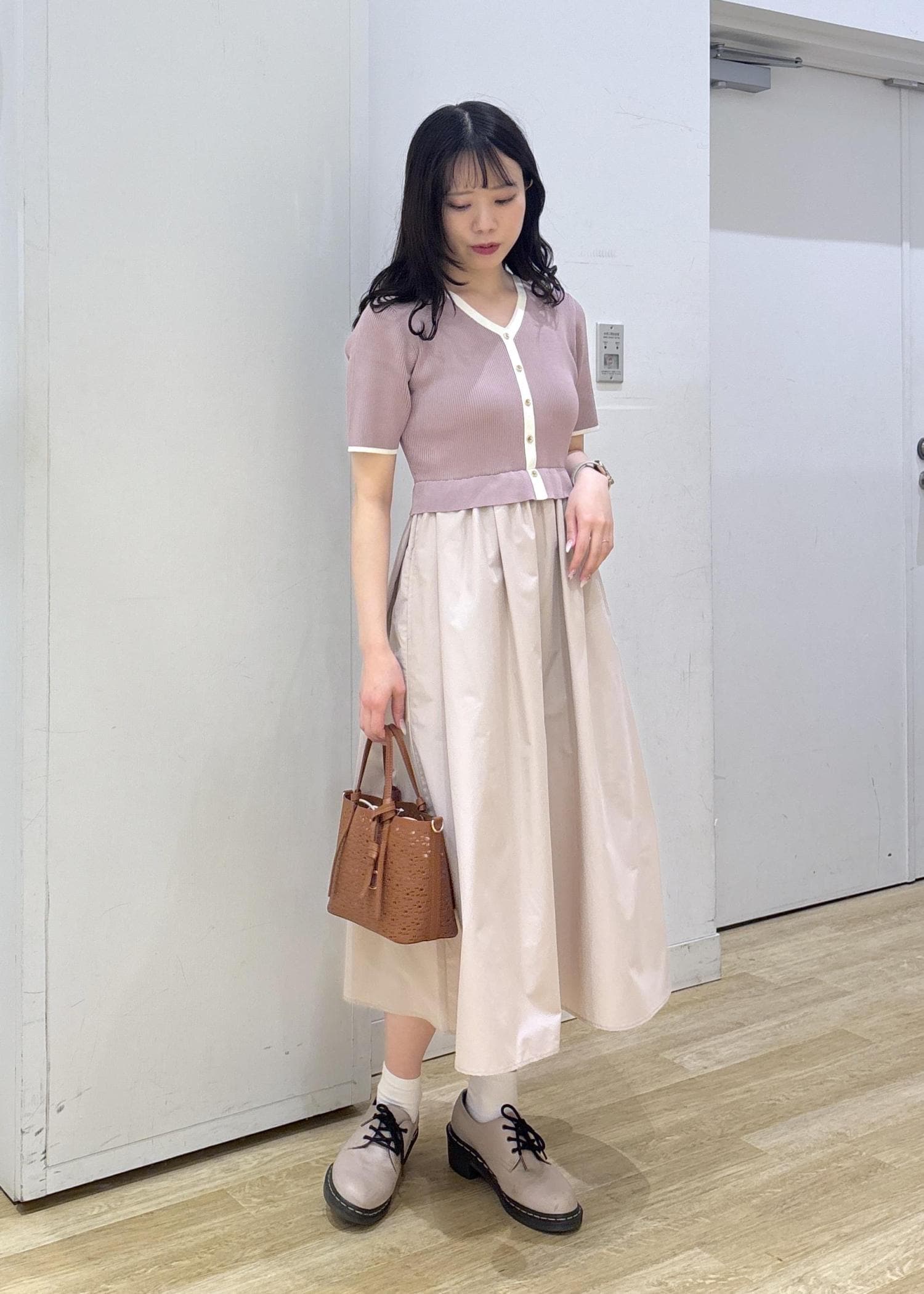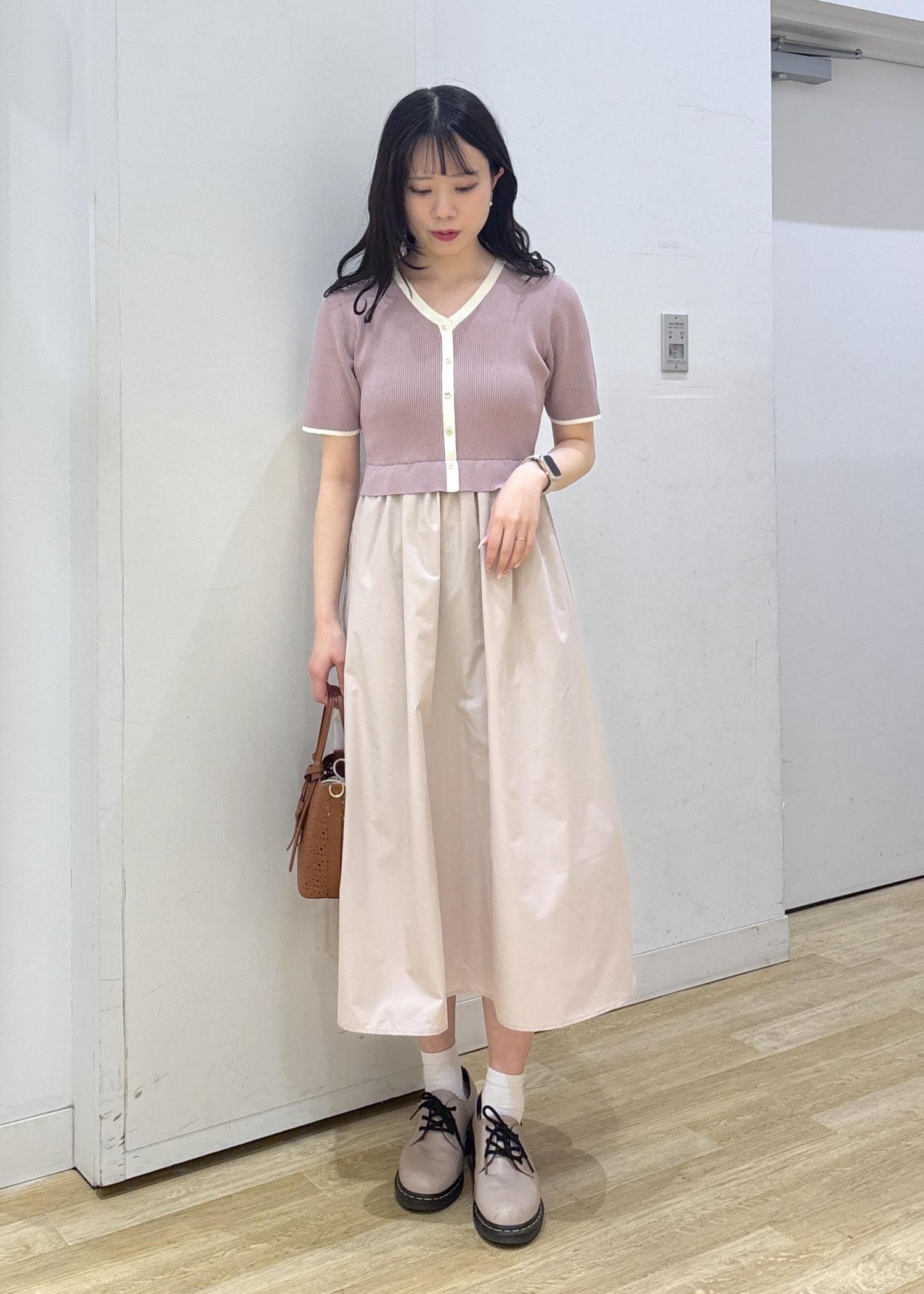 ピンクの少し甘めなワンピースにブラウンのバッグを合わせてフェミニンなコーディネートに仕上げました◎