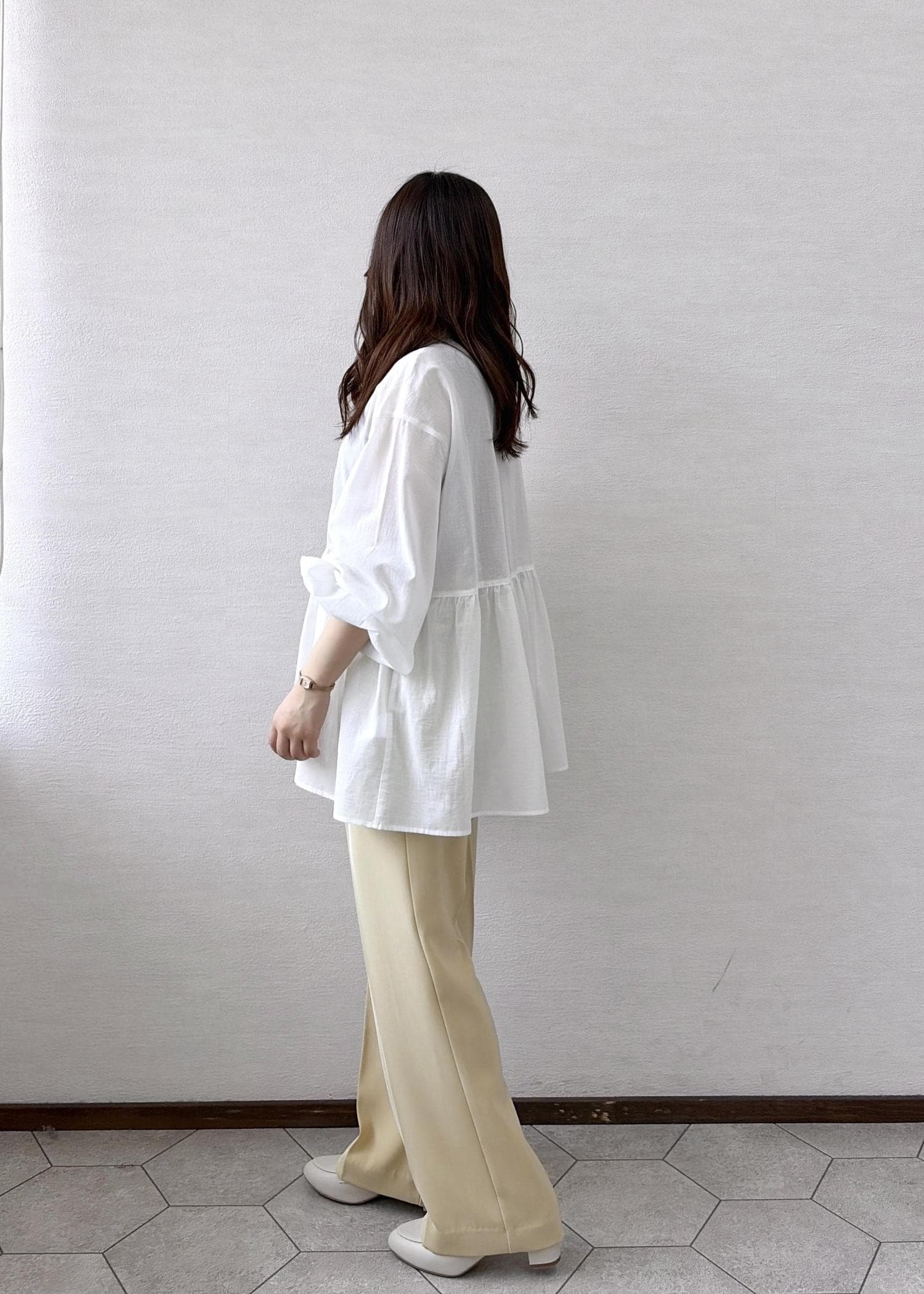 トレンドのイエローのパンツをメインに大人可愛いコーデにしました!トップスはフレアシルエットかつ首元にフリルがあるので可愛くなりすぎないように、パールのネックレスで大人っぽくしました!