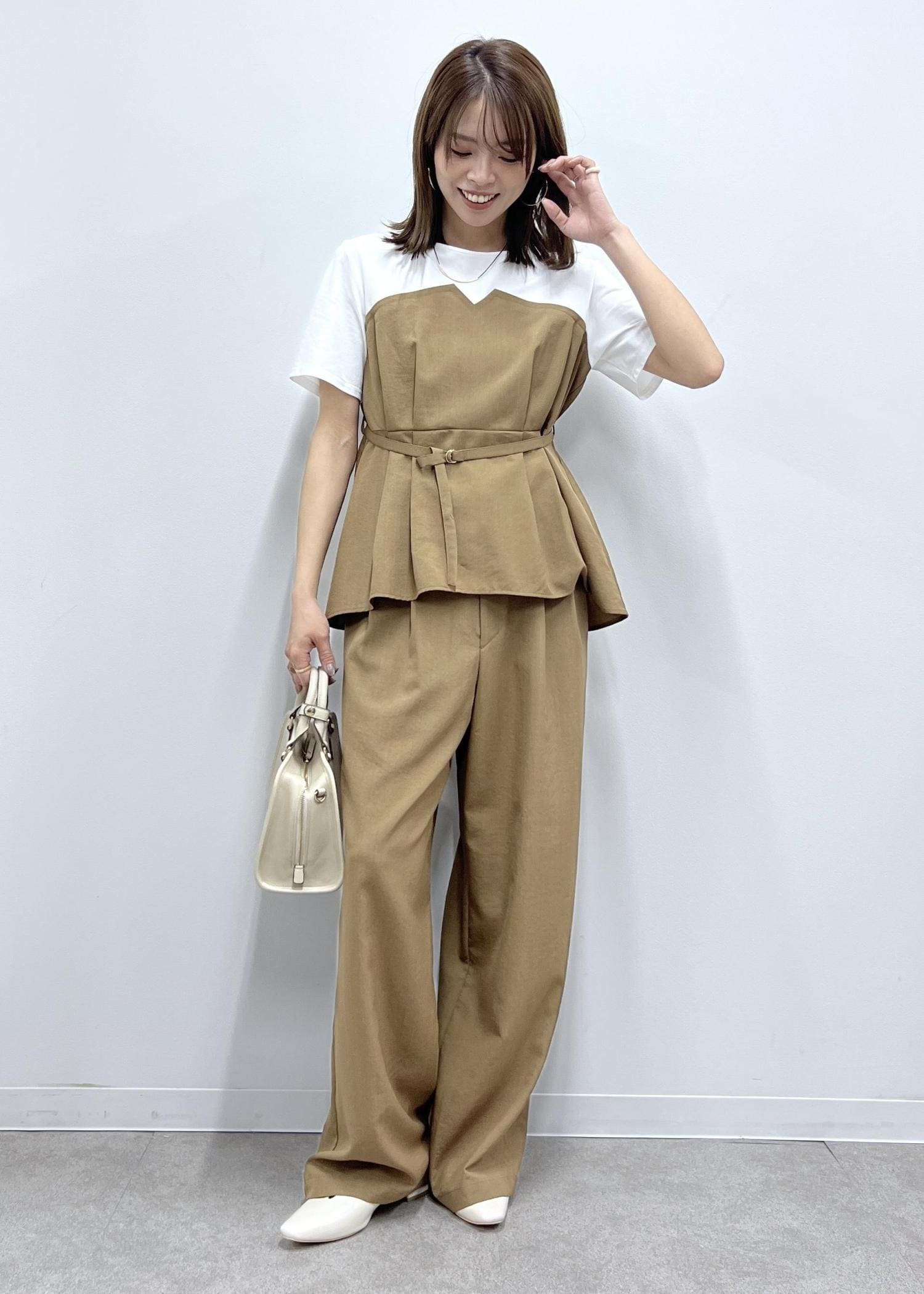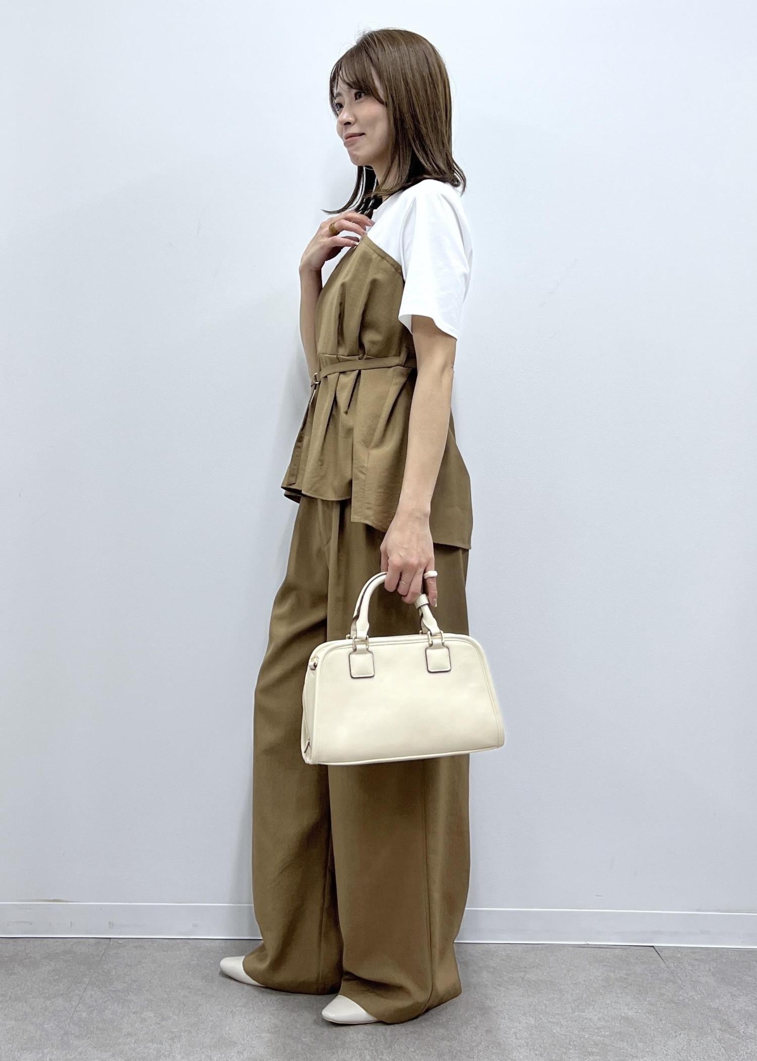 大人っぽさのあるキャメル系のカラーで、小物はホワイトで軽やかに。