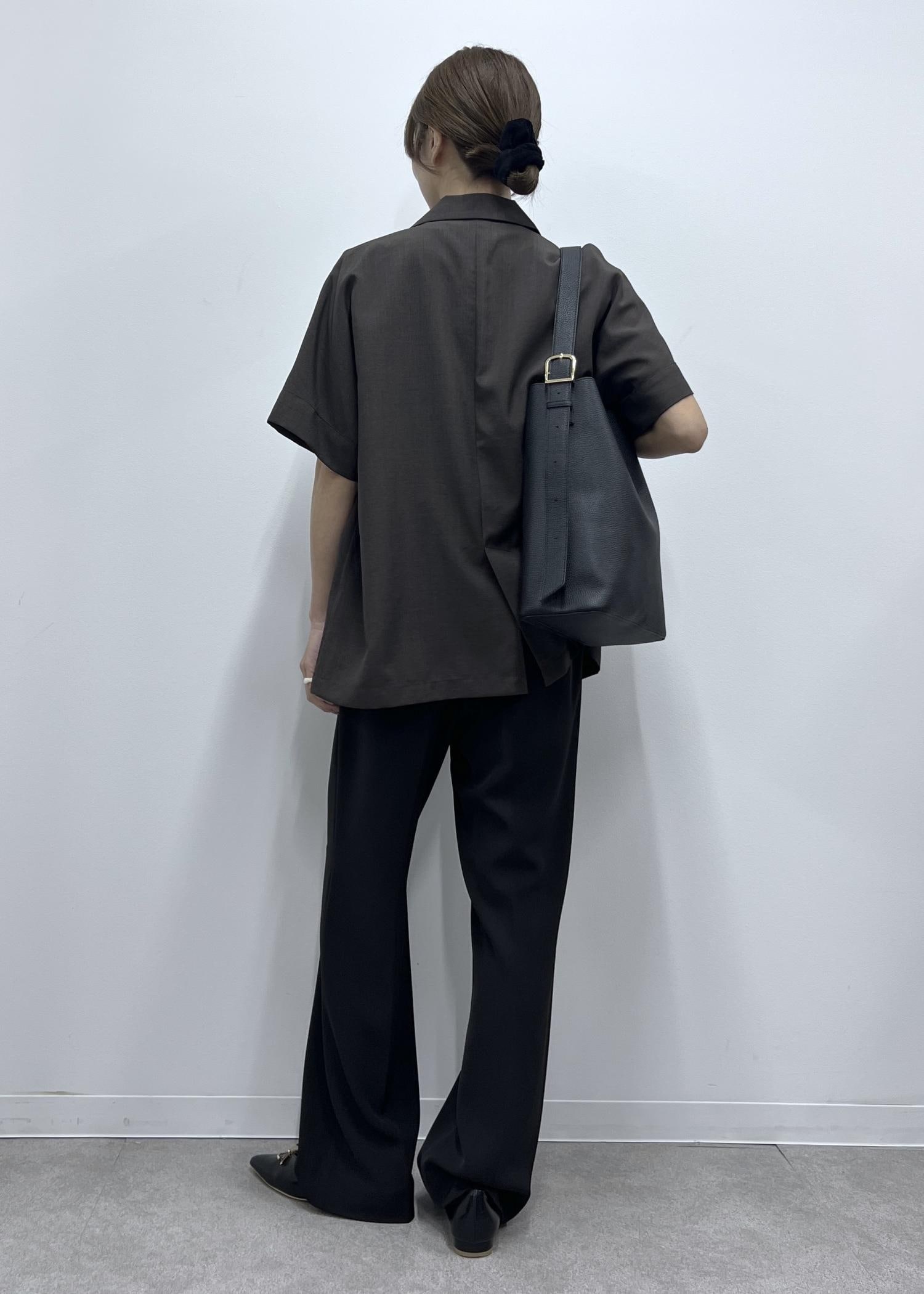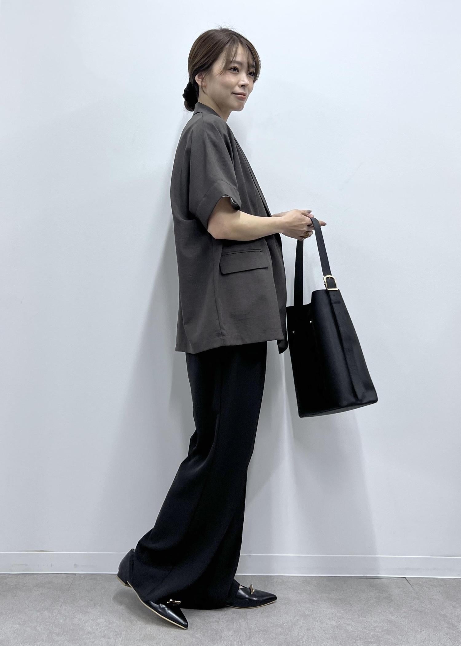 ゆったりシルエットのジャケットには、フレアパンツでスッキリ感のあるスタイリングに。