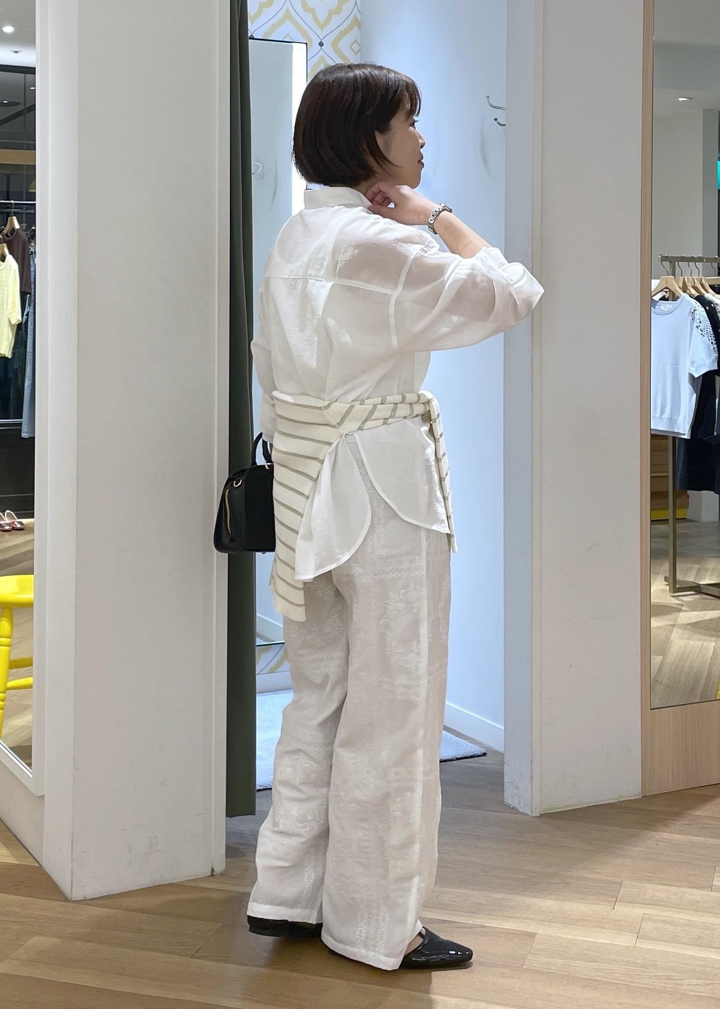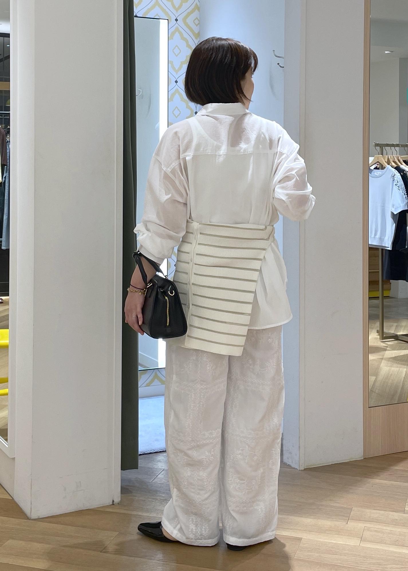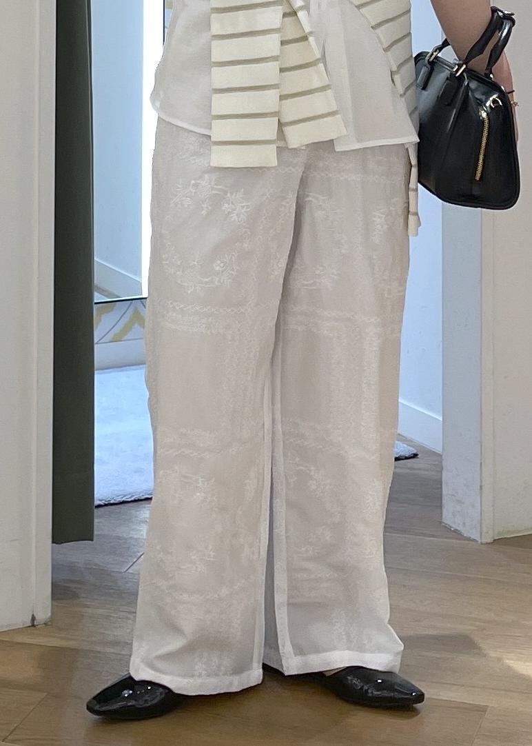 リラックス感ある綿ボイルの白シャツにレースのイージーワイドパンツを合わせた、リラックス感あるワントーンコーデです!