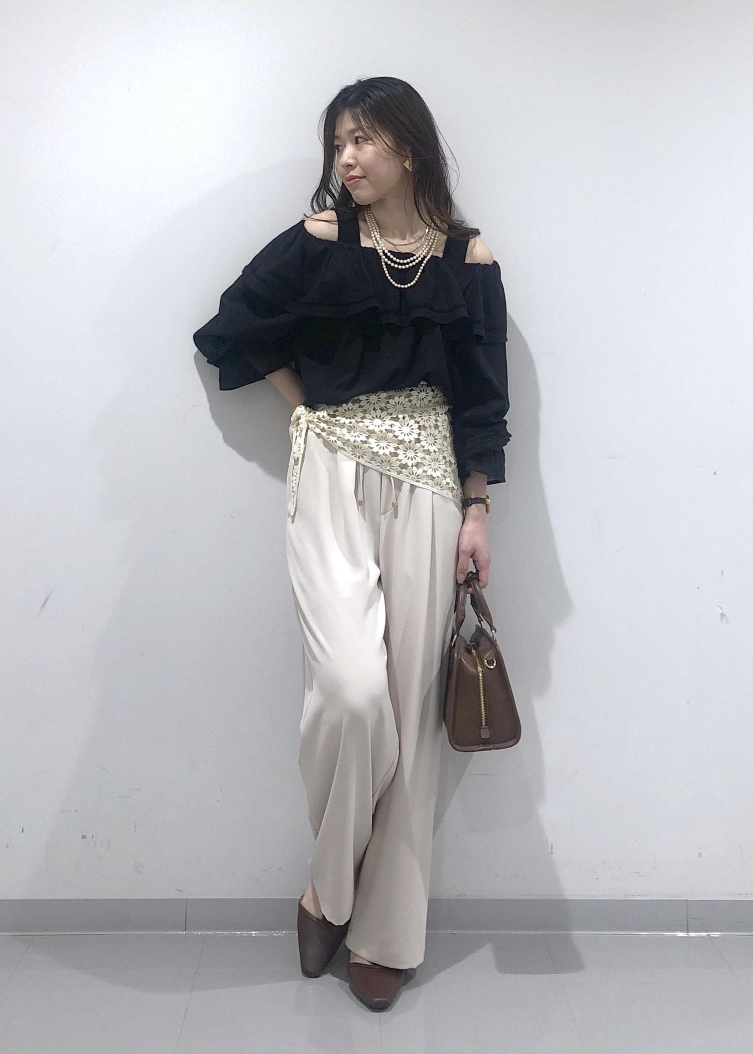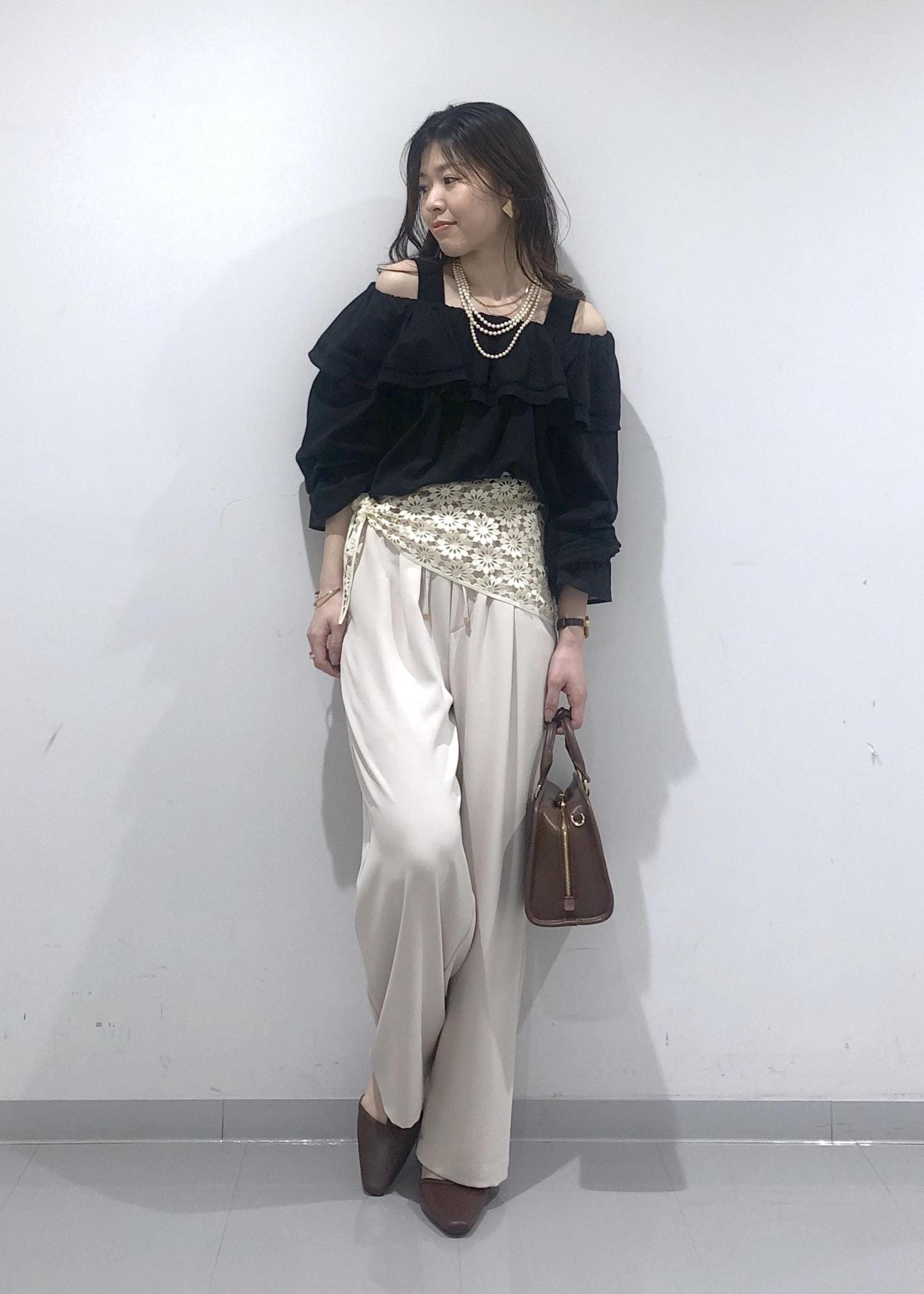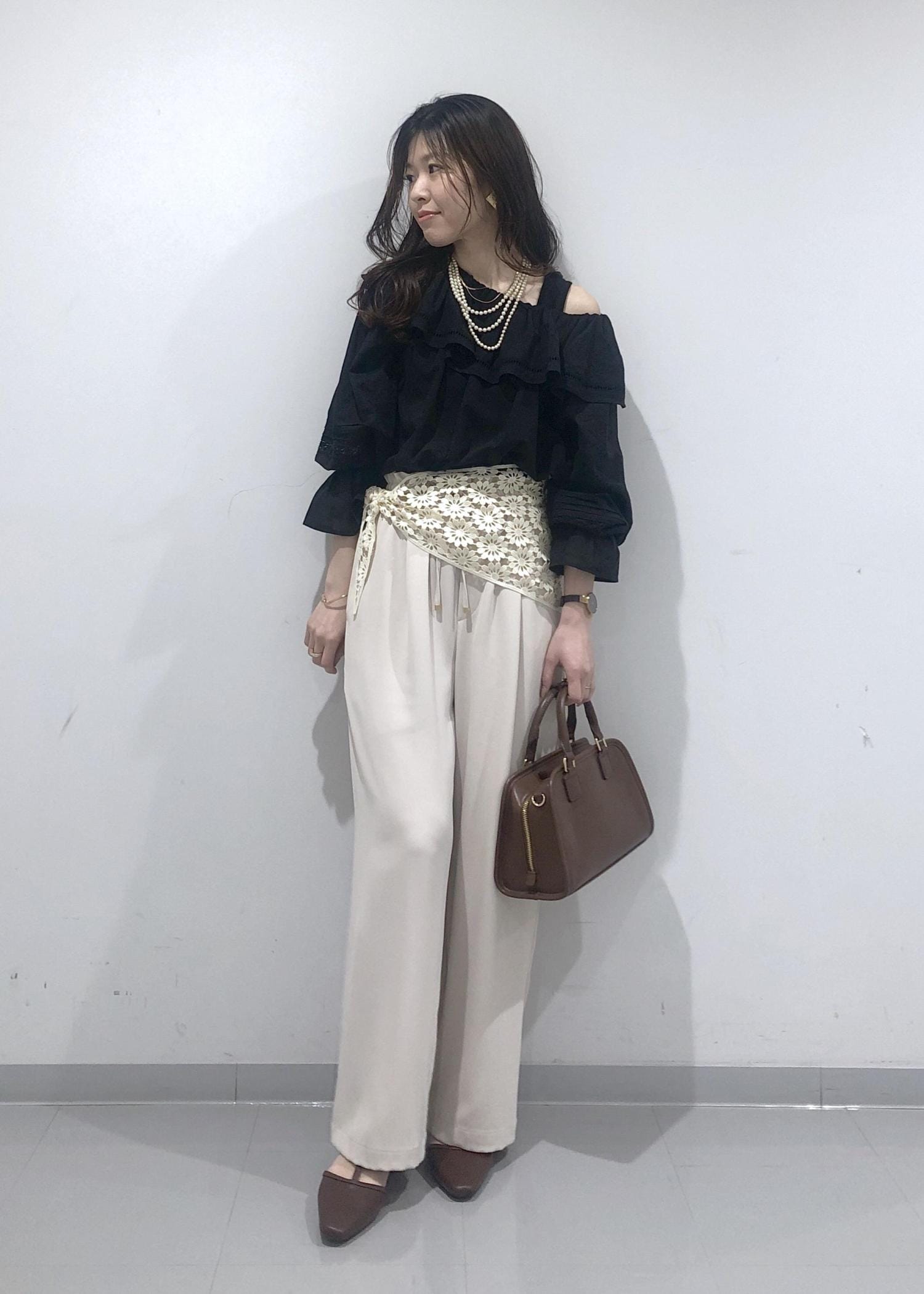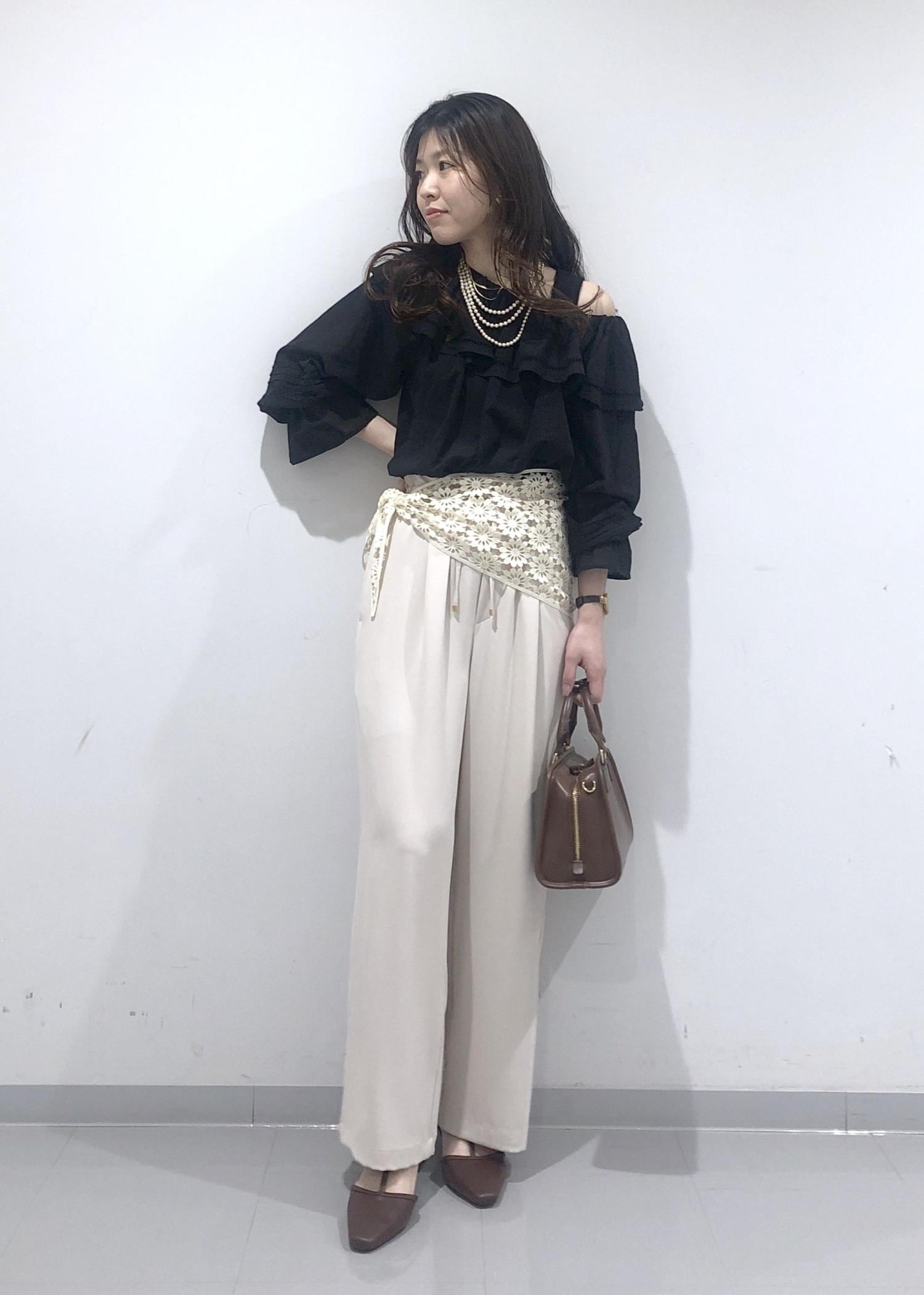 華やかなフリルカラーのオフショルダーブラウスに、イージーワイドパンツを合わせ、さらにプラス1のおしゃれアイテムとして、花柄レース編みスカーフを腰に巻きました!
