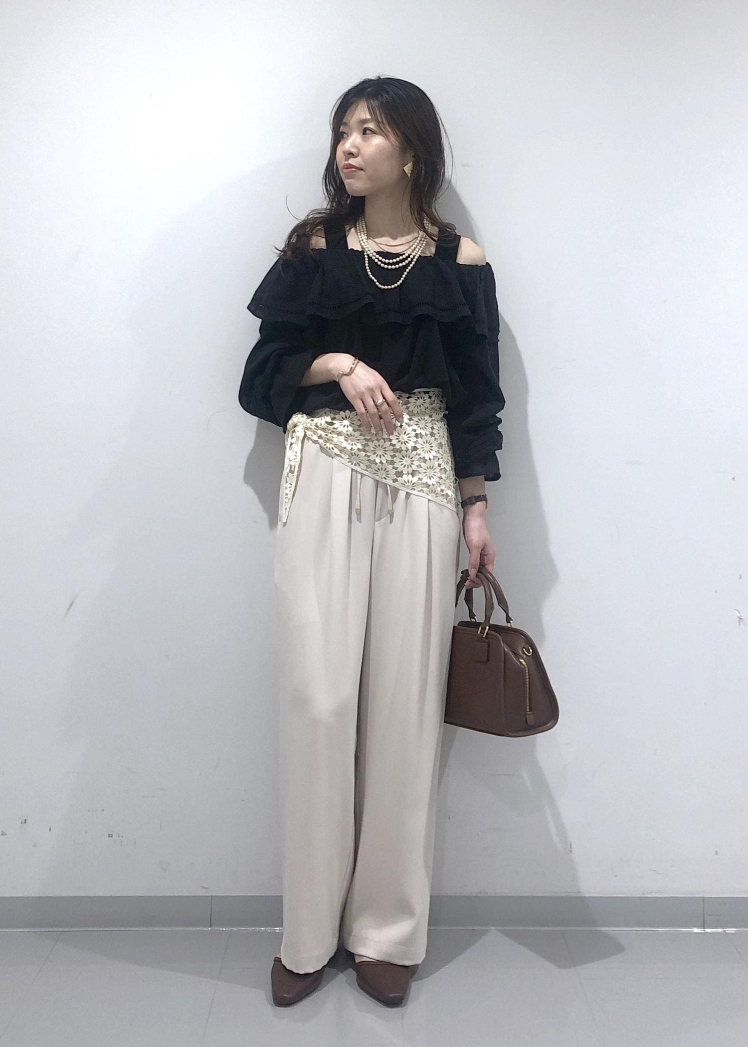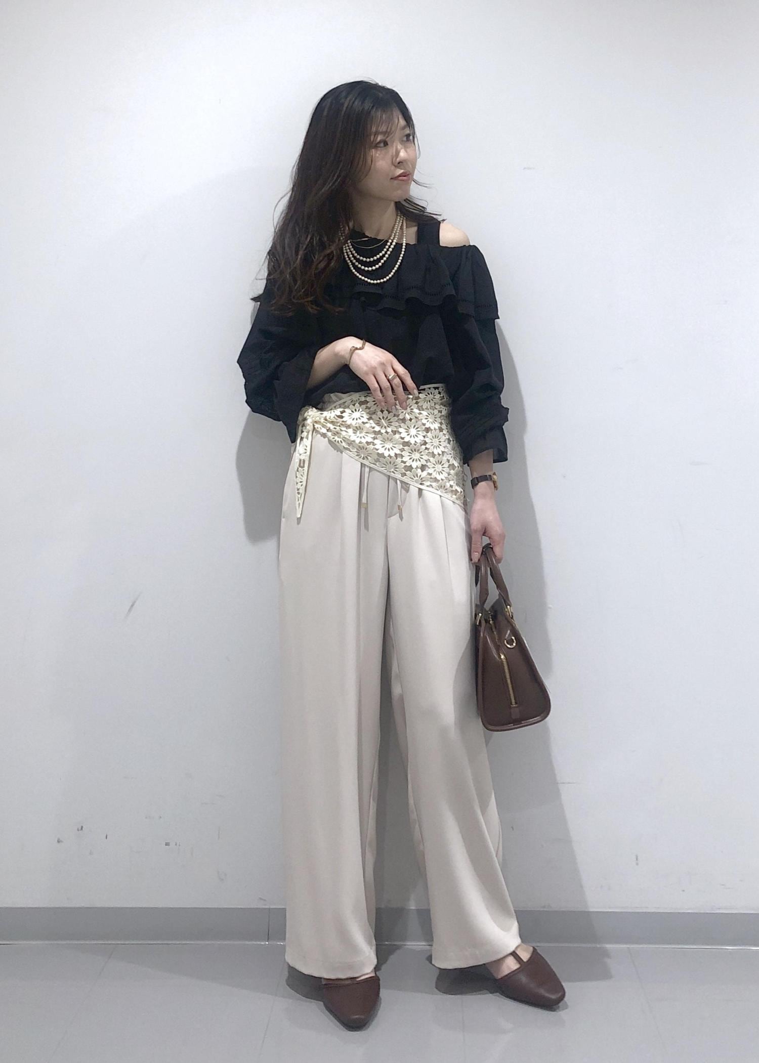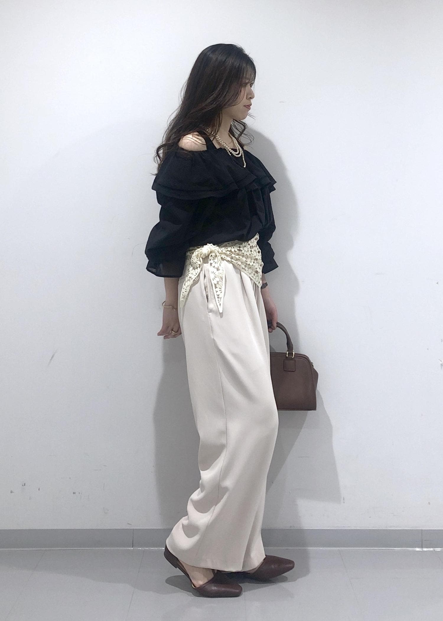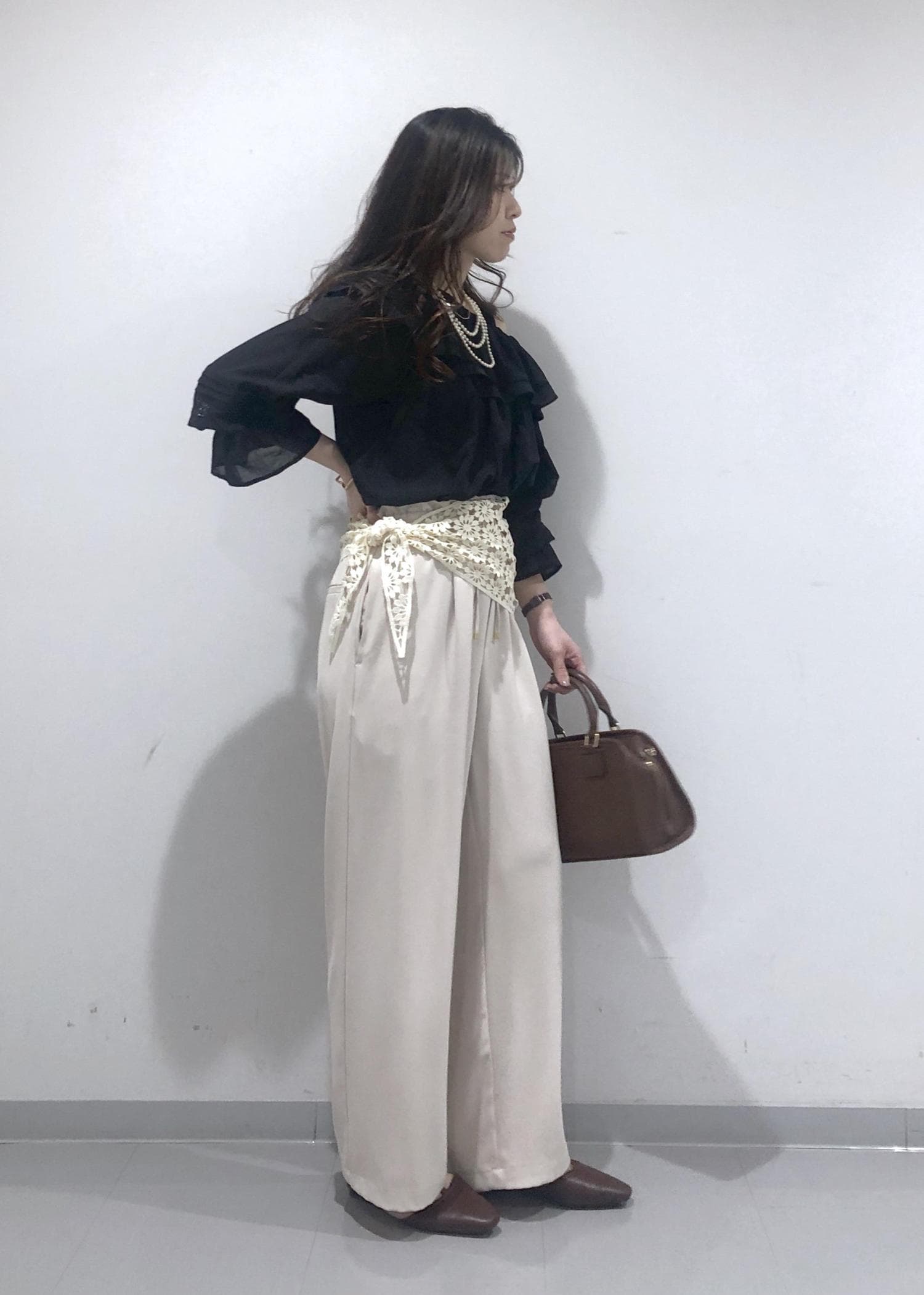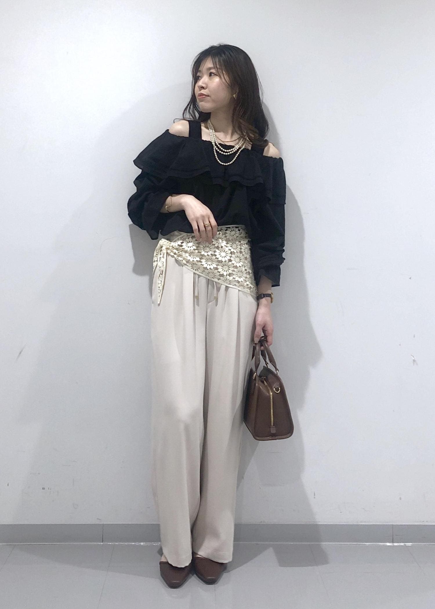 華やかなフリルカラーのオフショルダーブラウスに、イージーワイドパンツを合わせ、さらにプラス1のおしゃれアイテムとして、花柄レース編みスカーフを腰に巻きました!