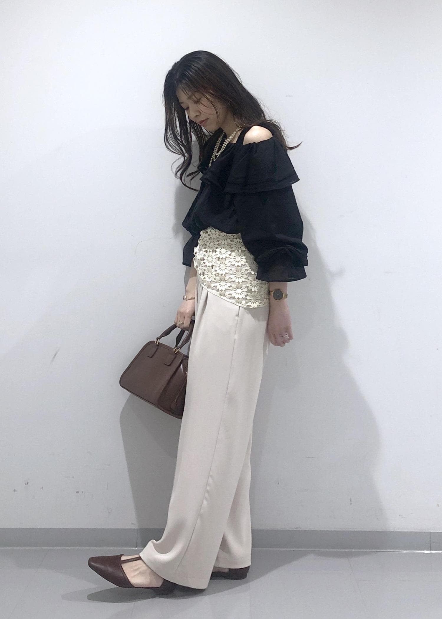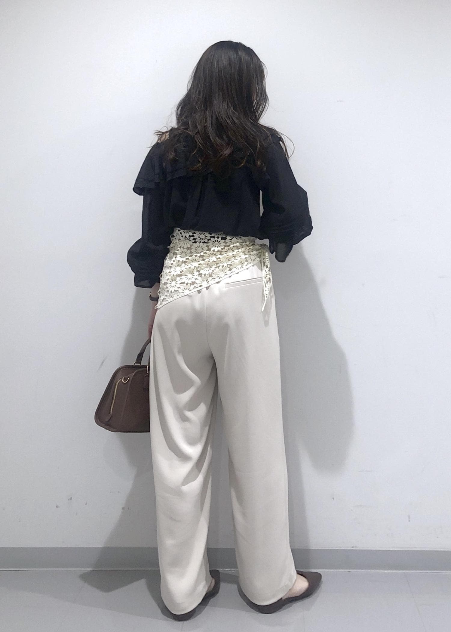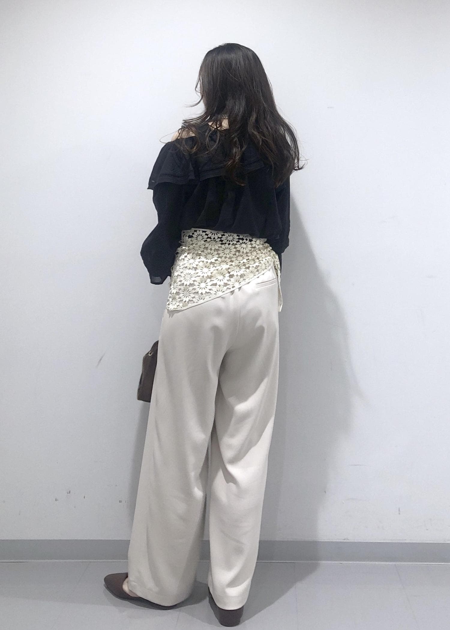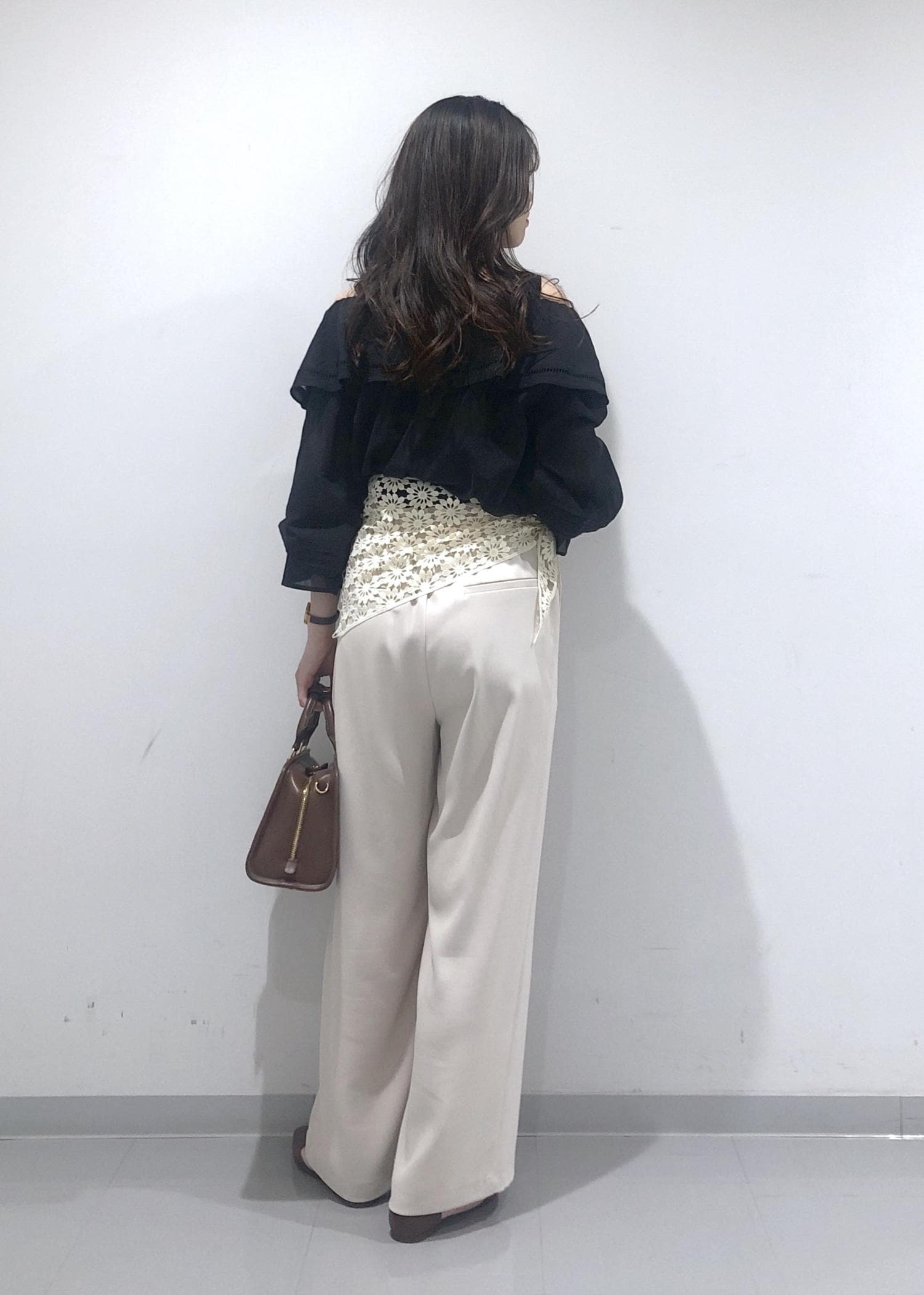 華やかなフリルカラーのオフショルダーブラウスに、イージーワイドパンツを合わせ、さらにプラス1のおしゃれアイテムとして、花柄レース編みスカーフを腰に巻きました!