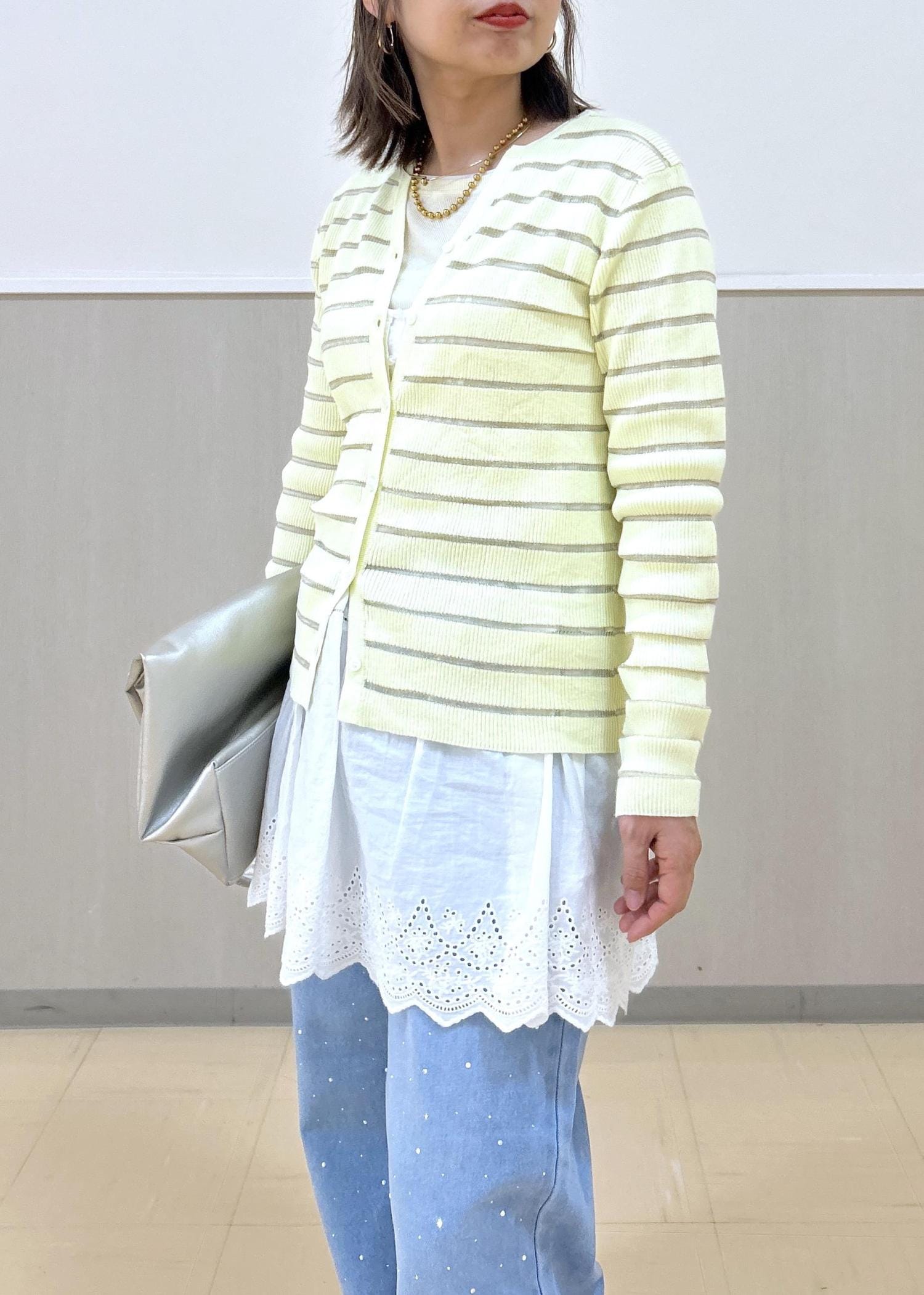カラーが可愛いカーデを主役に、レースのビスチェでトレンド感もプラス。