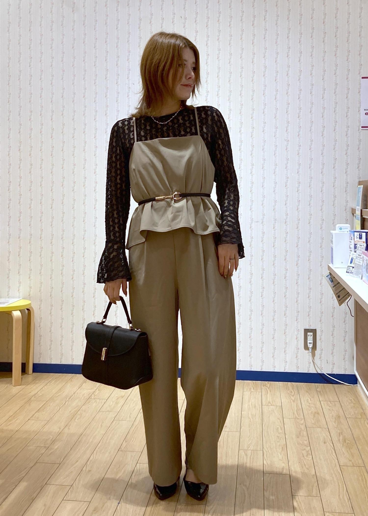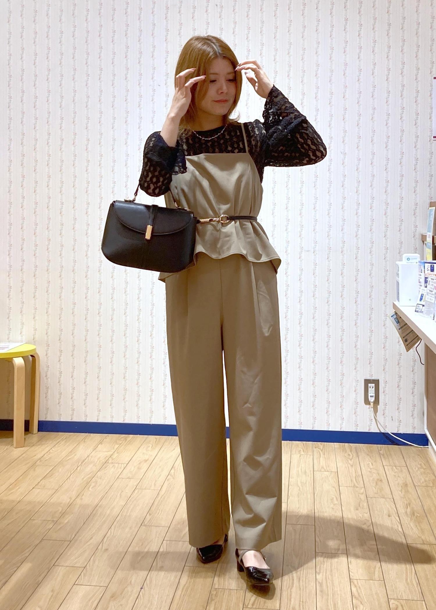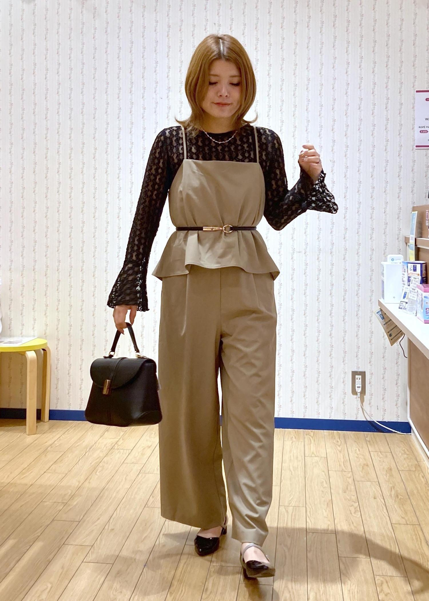 着るだけでコーディネートが決まるオールインワンをキレイめにまとめたモードっぽいコーディネートです。