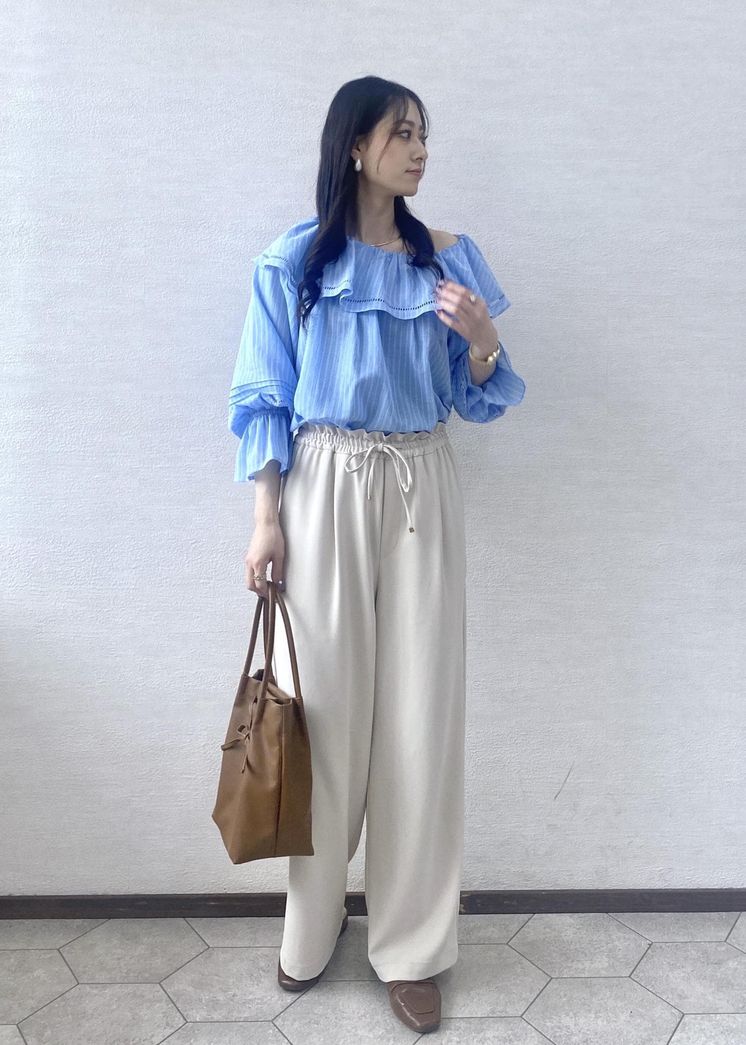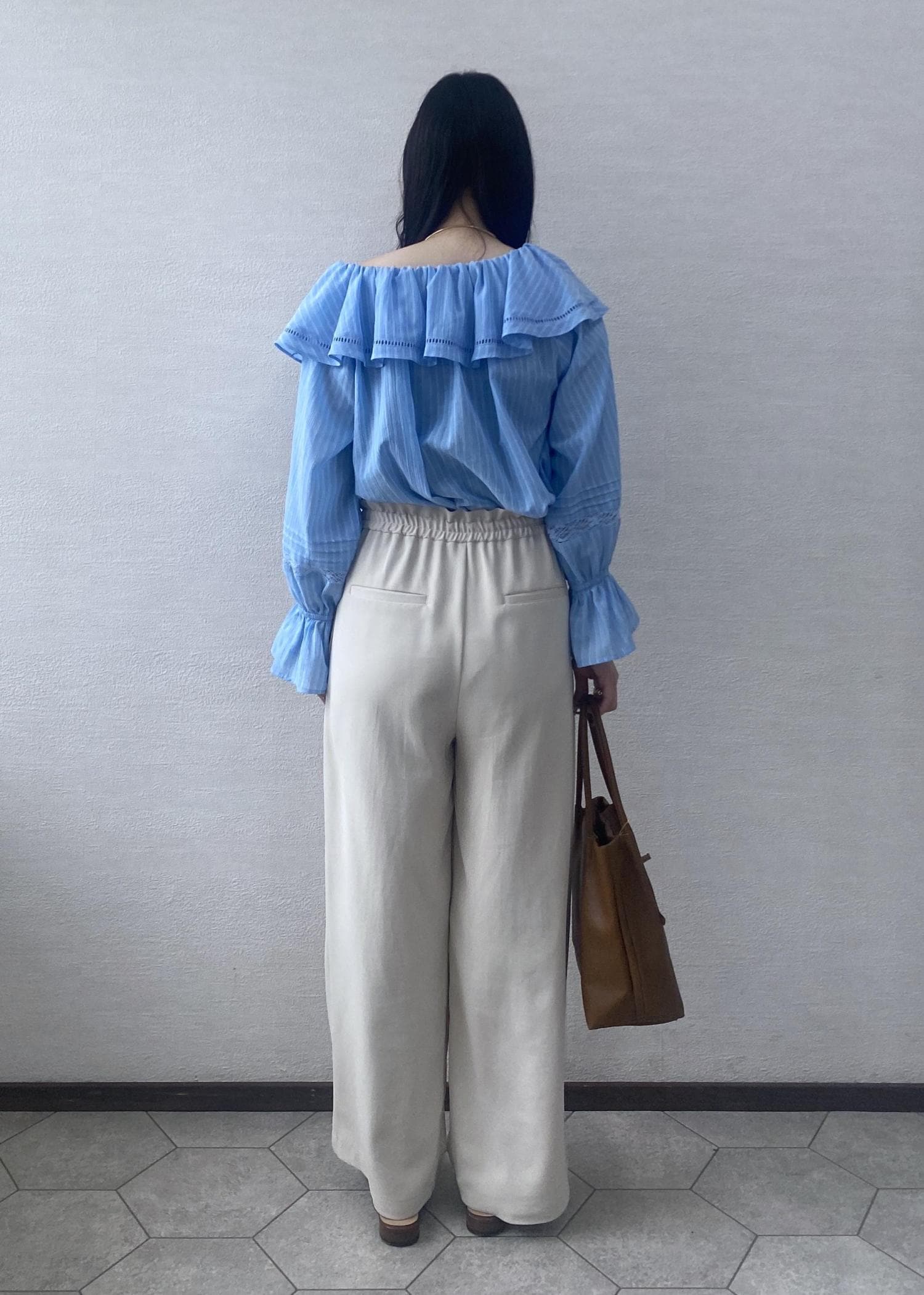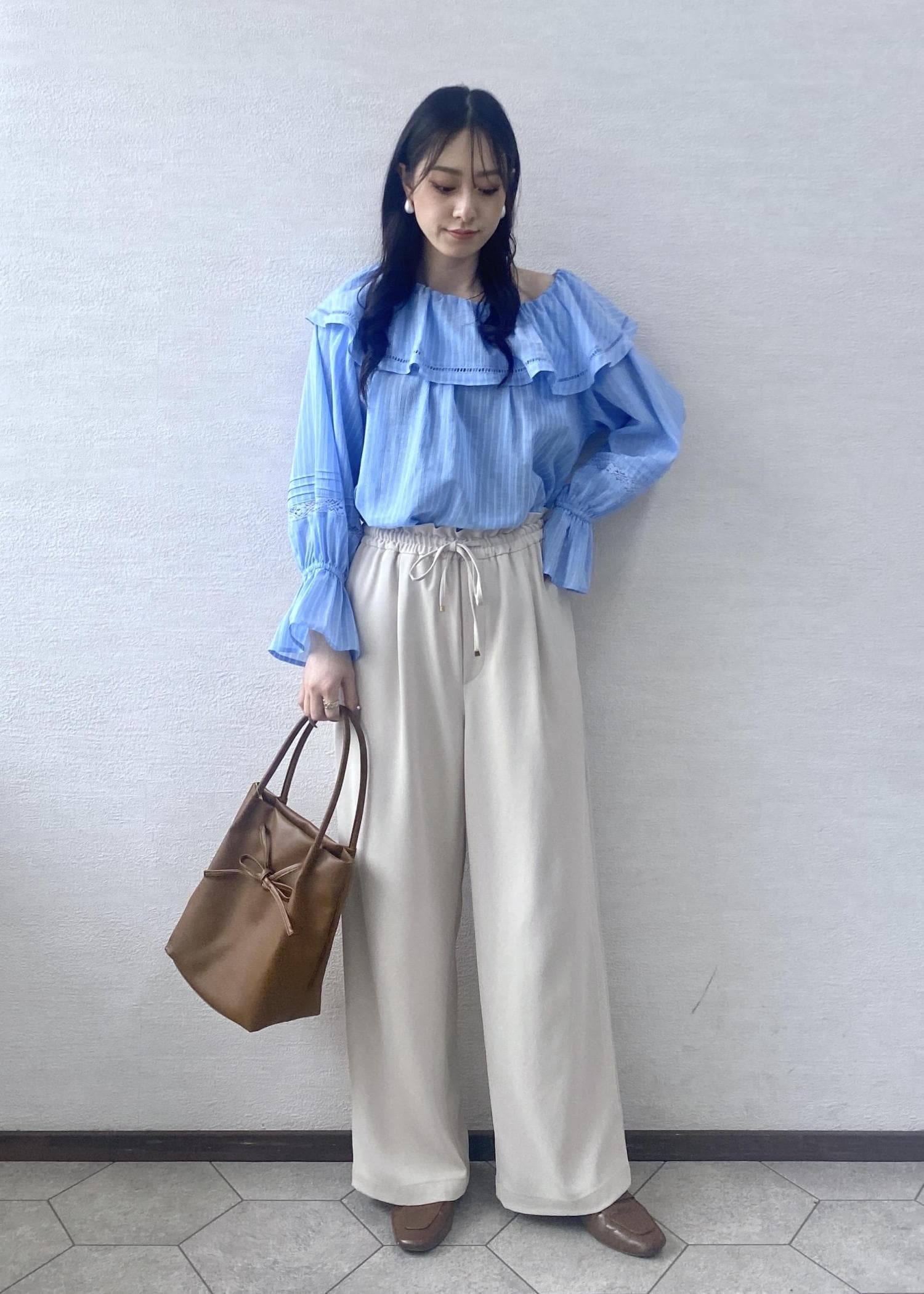 レースフリルのオフショルダーにもなる2WAYブラウスに落ち感のあるパンツを合わせた大人カジュアルなコーディネートです。