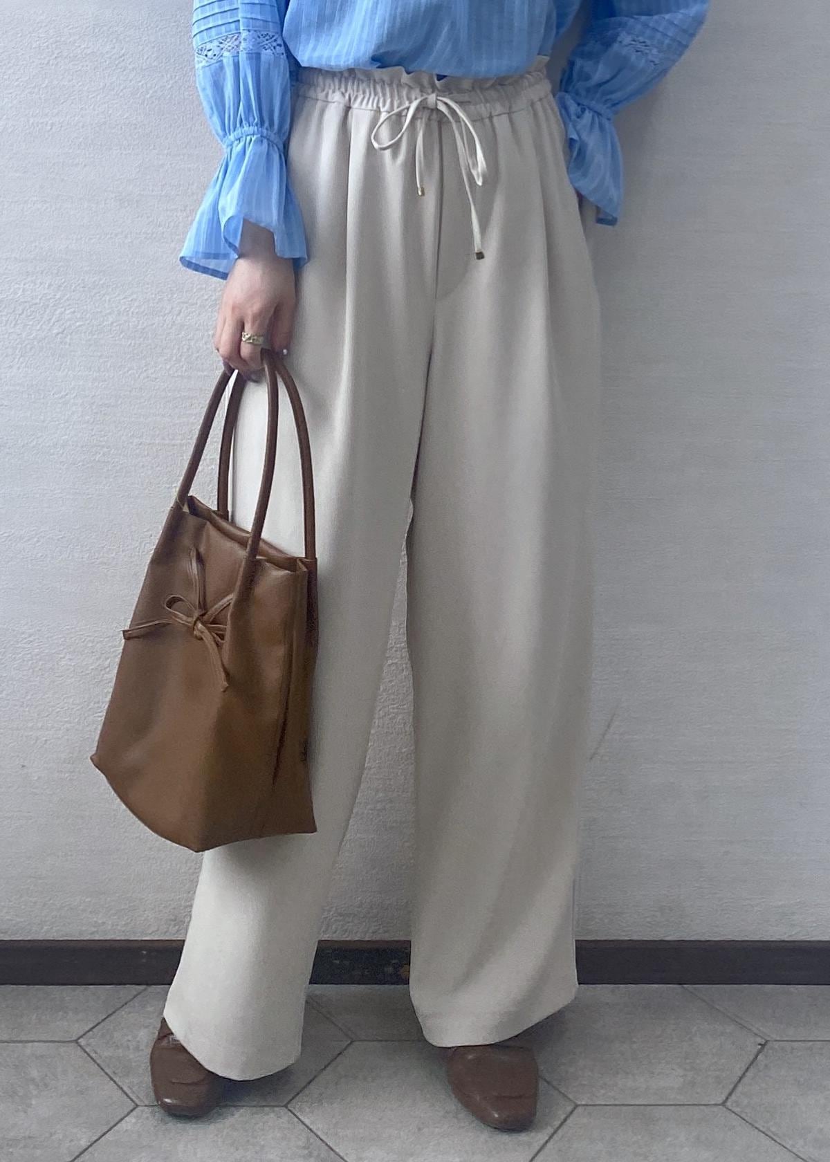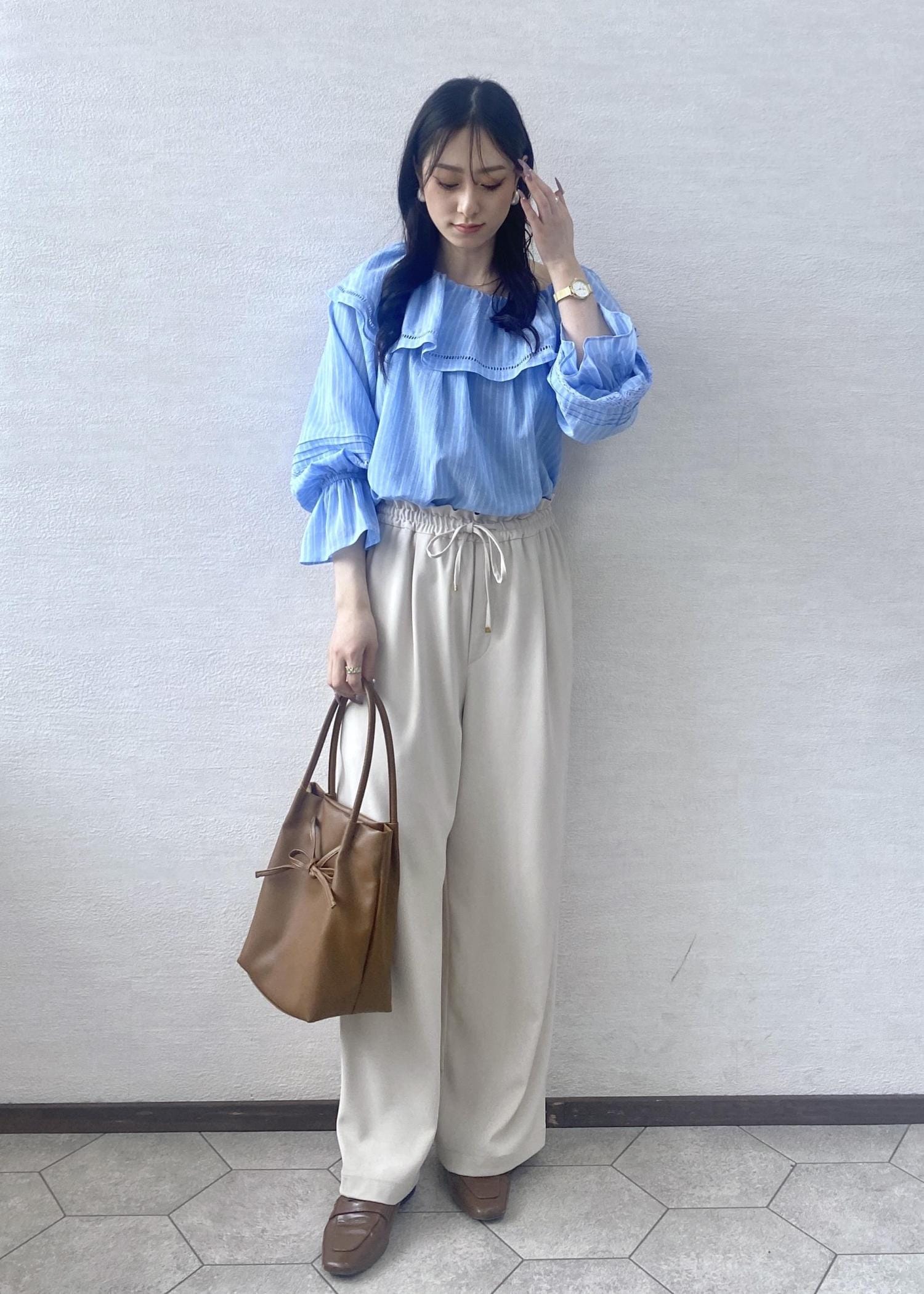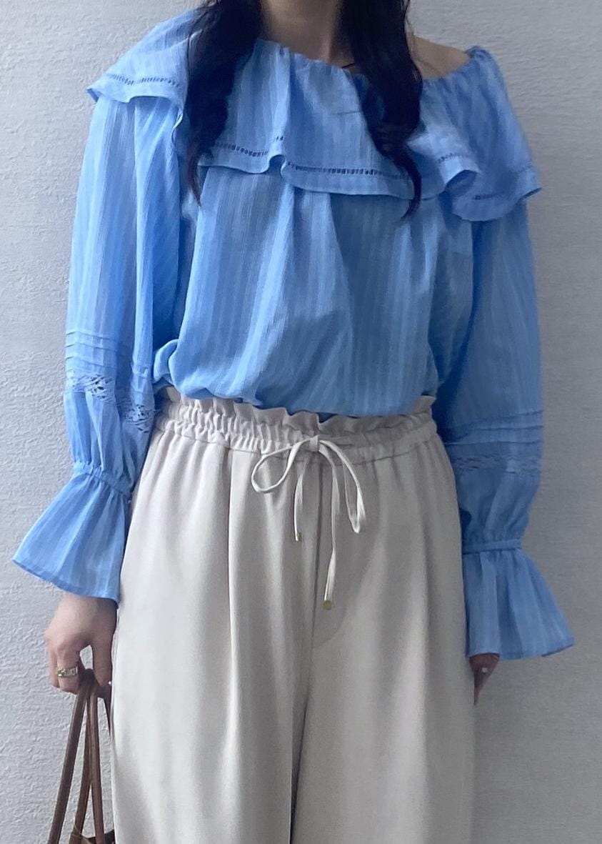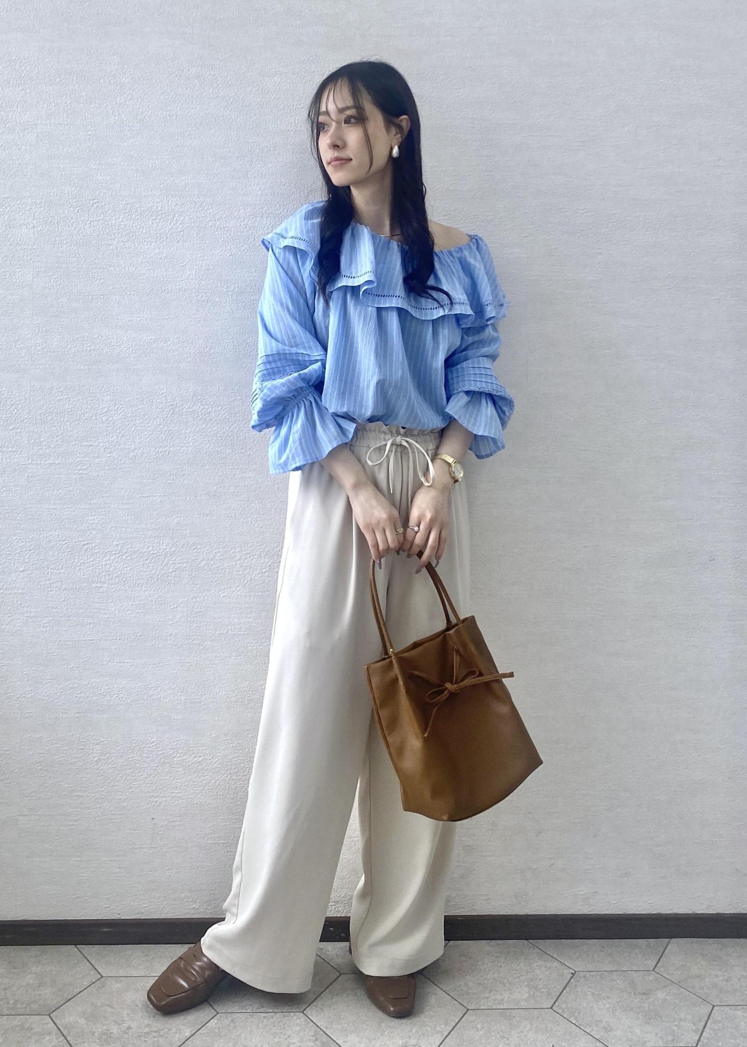 レースフリルのオフショルダーにもなる2WAYブラウスに落ち感のあるパンツを合わせた大人カジュアルなコーディネートです。