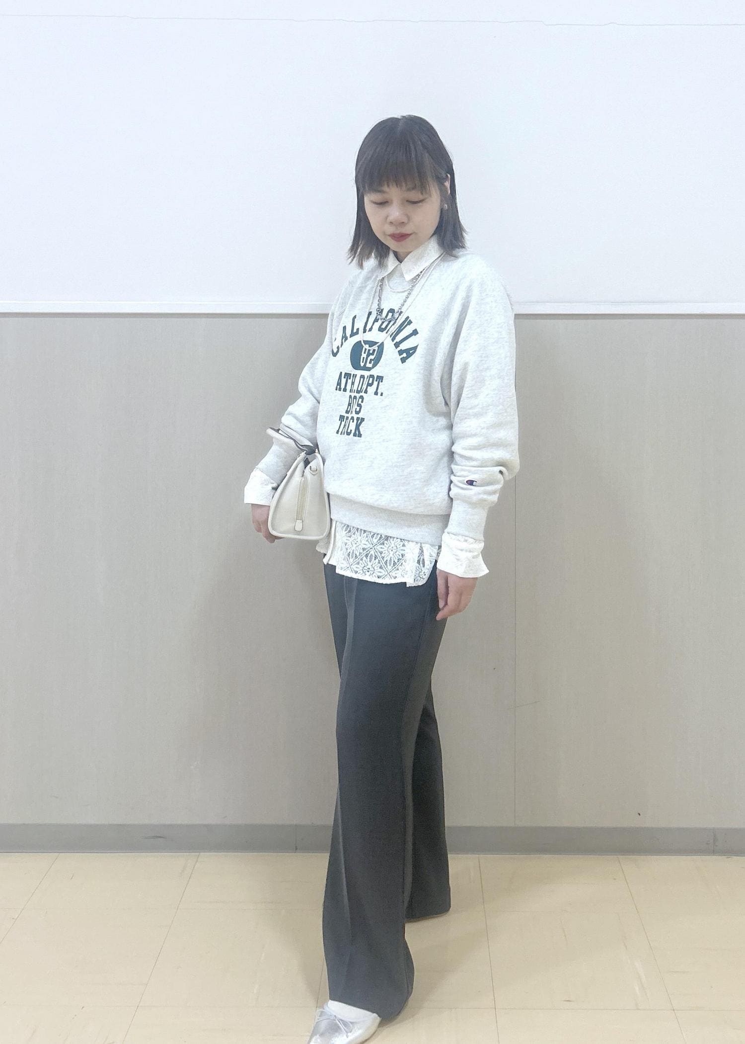 カジュアルなチャンピオンのスウェットにレースブラウスやフレアパンツを合わせて大人のキレイめカジュアルに。