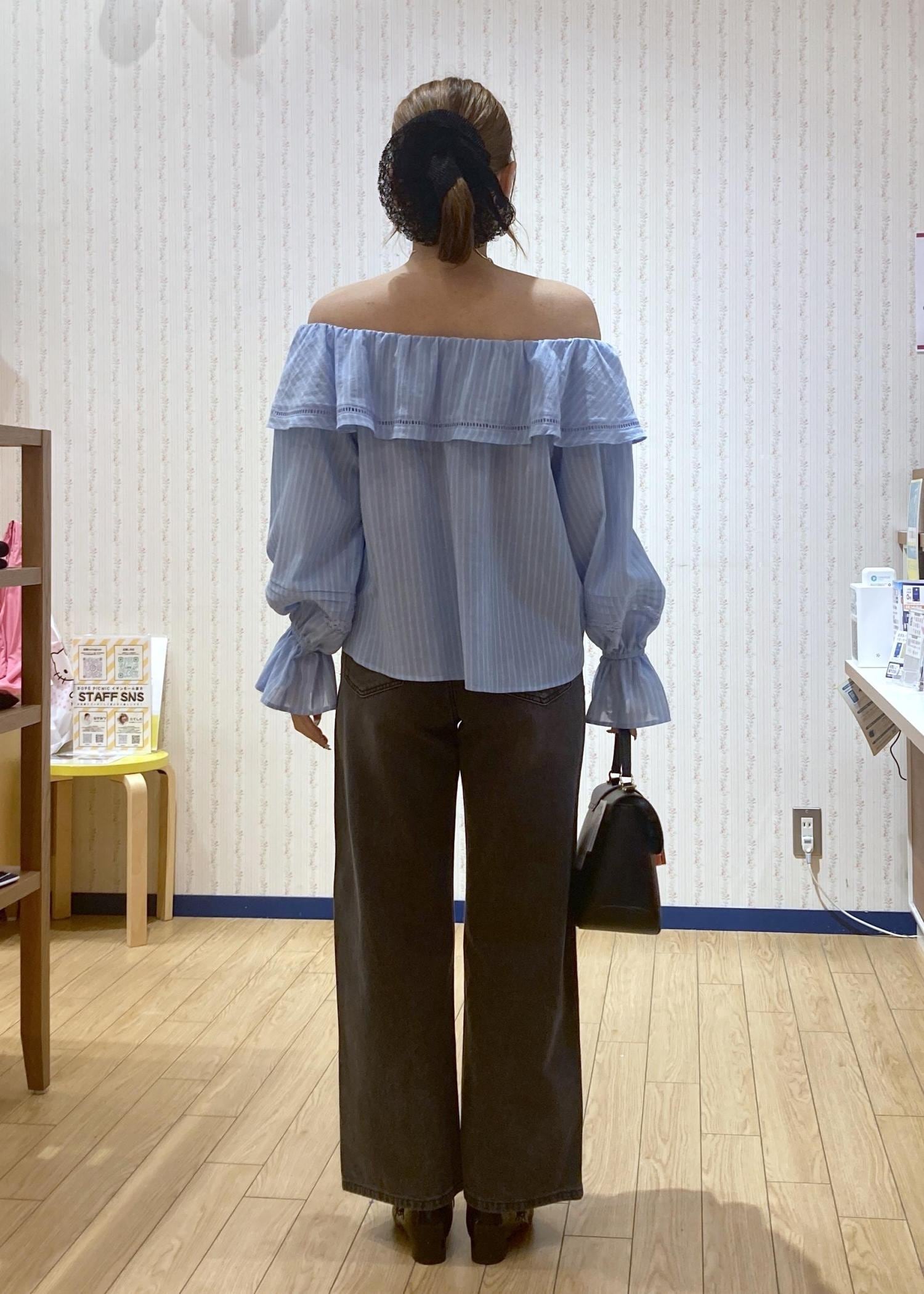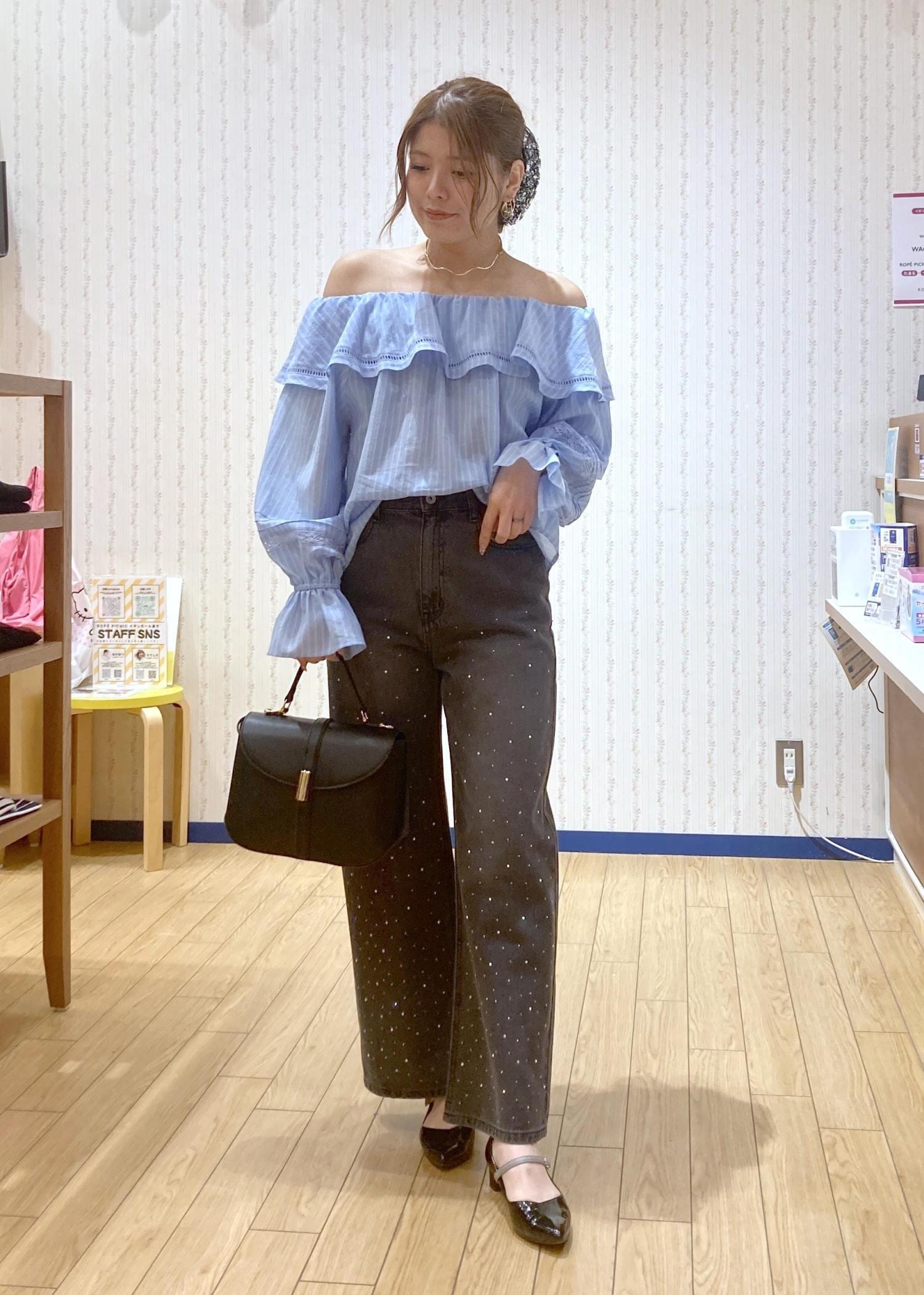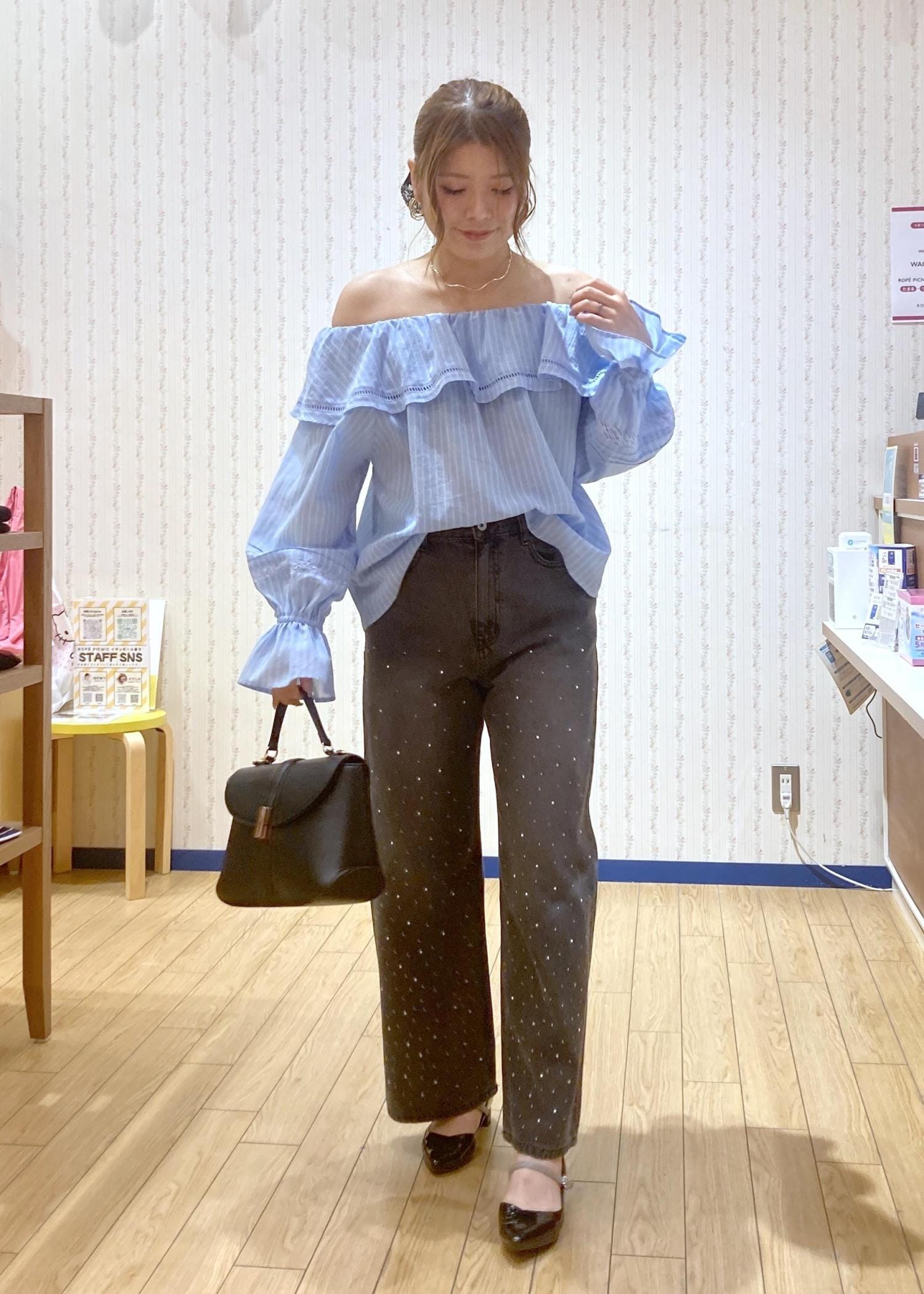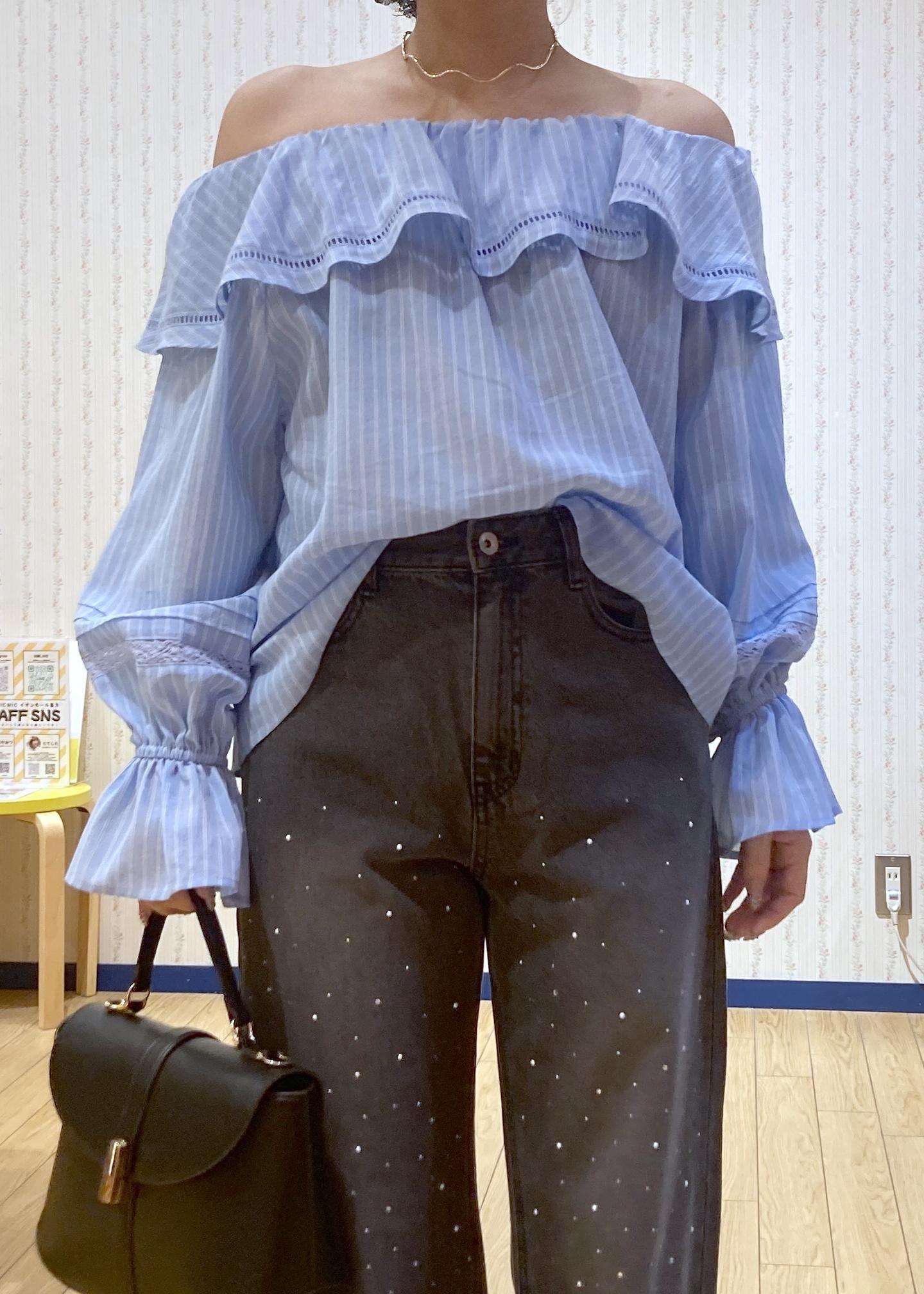 爽やかなブルーストライプのブラウスをオフショルにしてカジュアルにデニムと合わせた女性らしさのあるデニムコーディネートです。