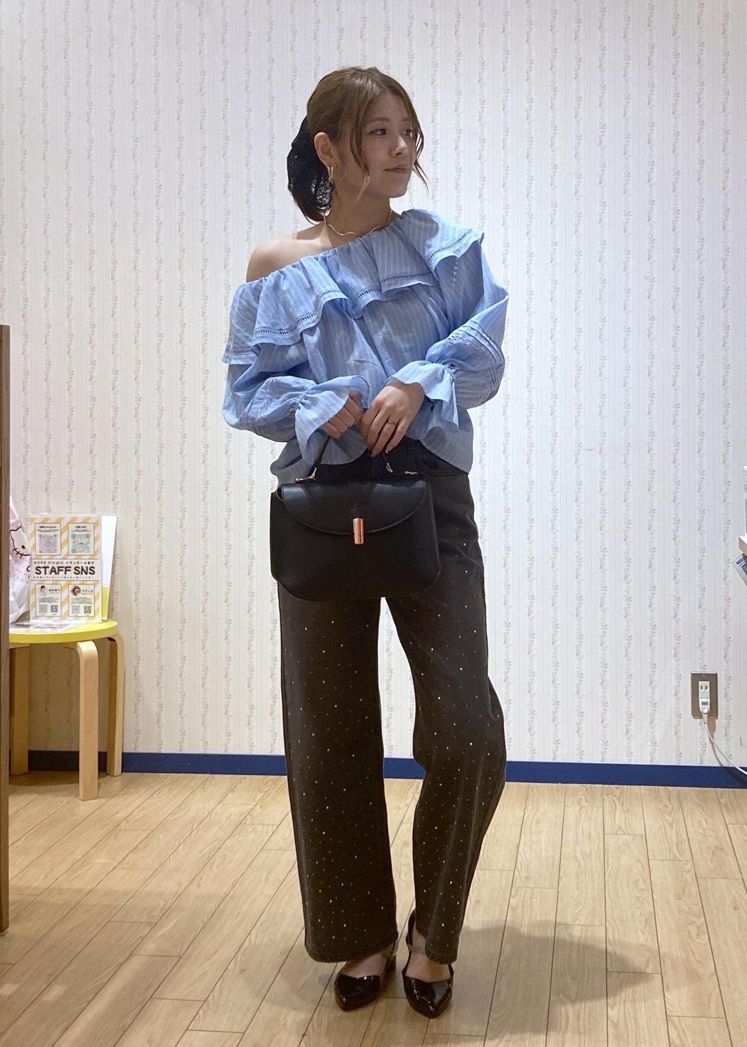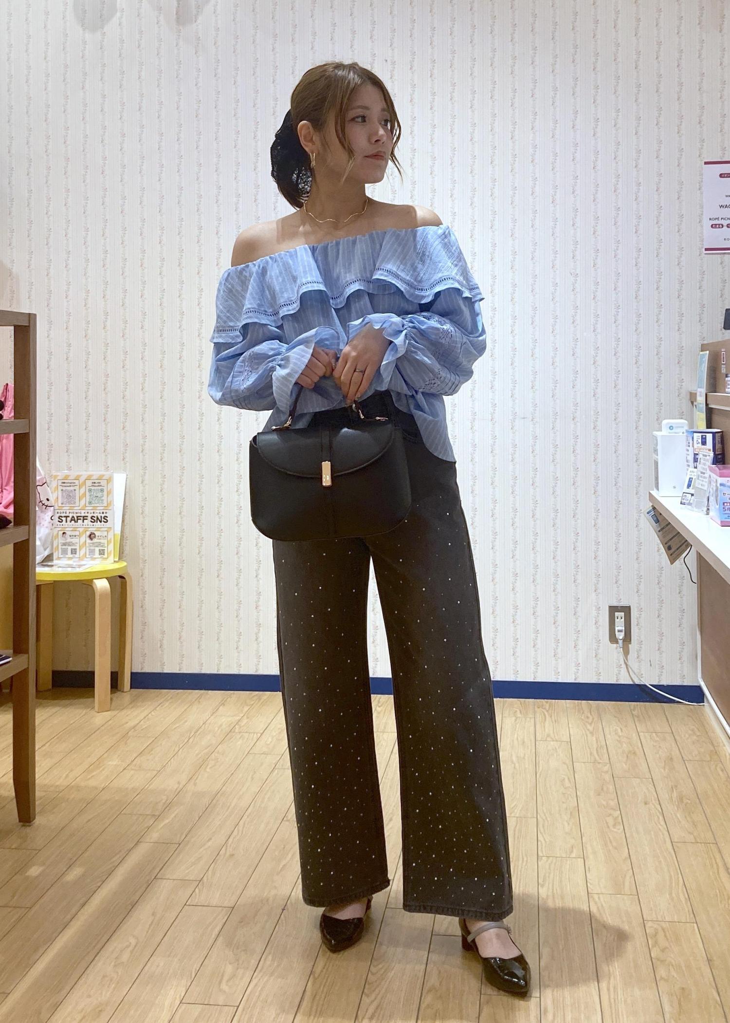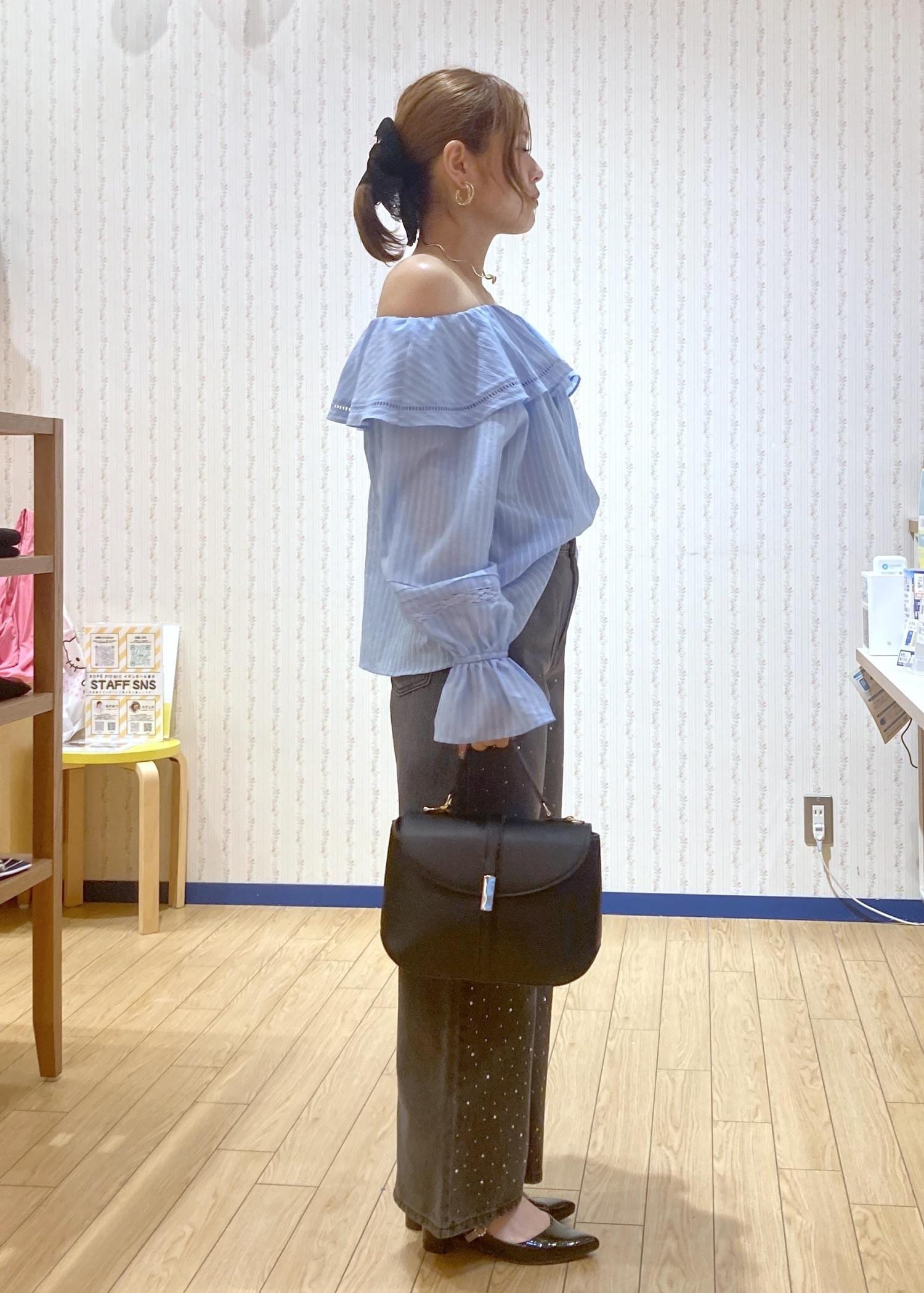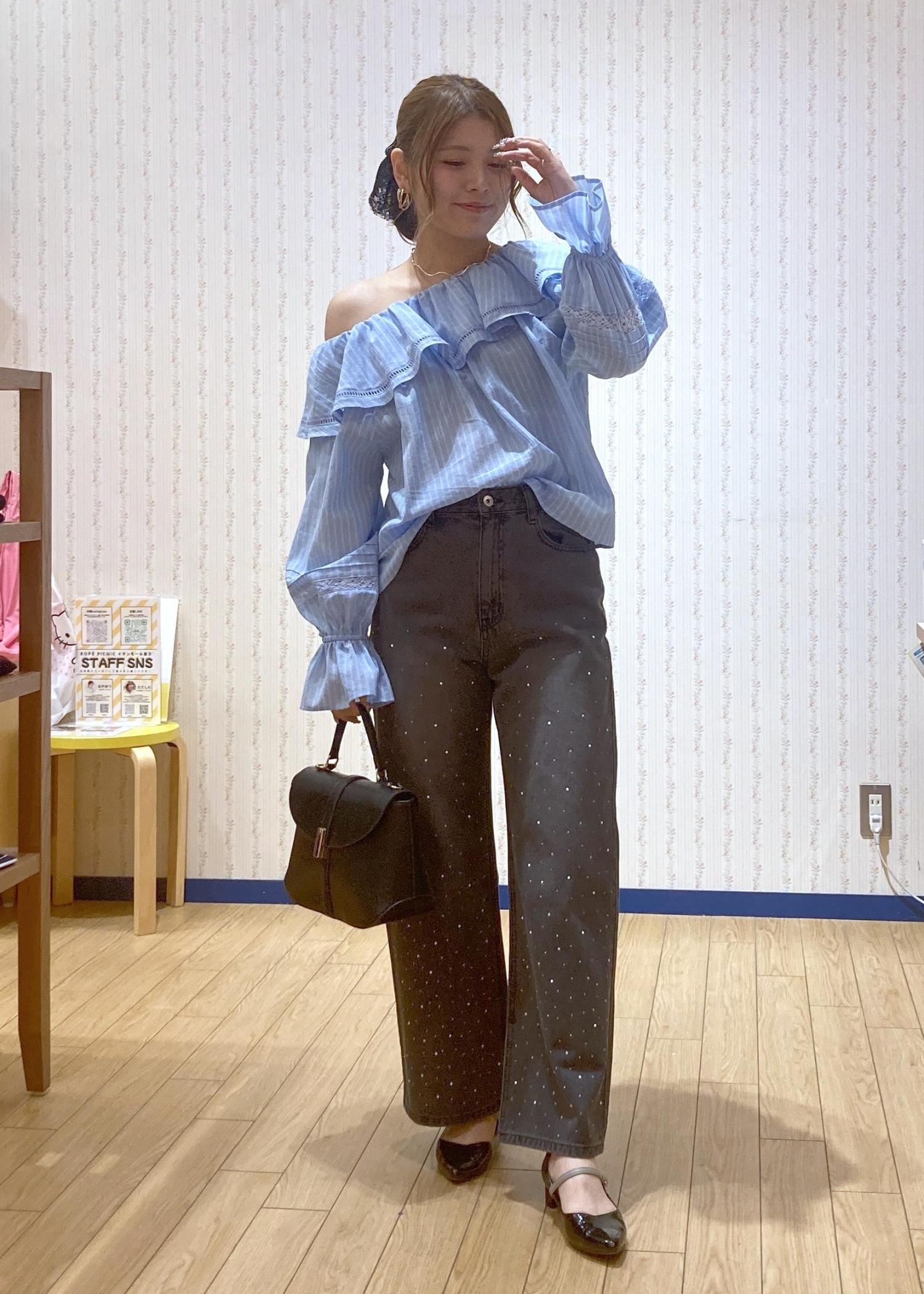 爽やかなブルーストライプのブラウスをオフショルにしてカジュアルにデニムと合わせた女性らしさのあるデニムコーディネートです。