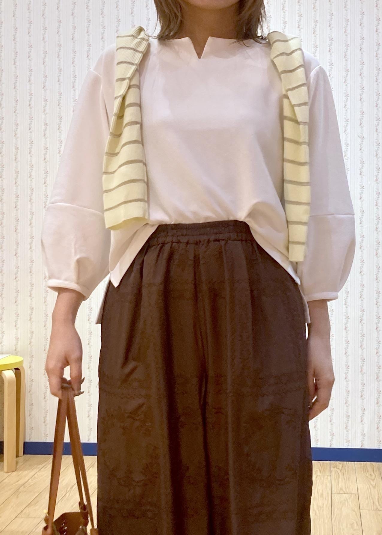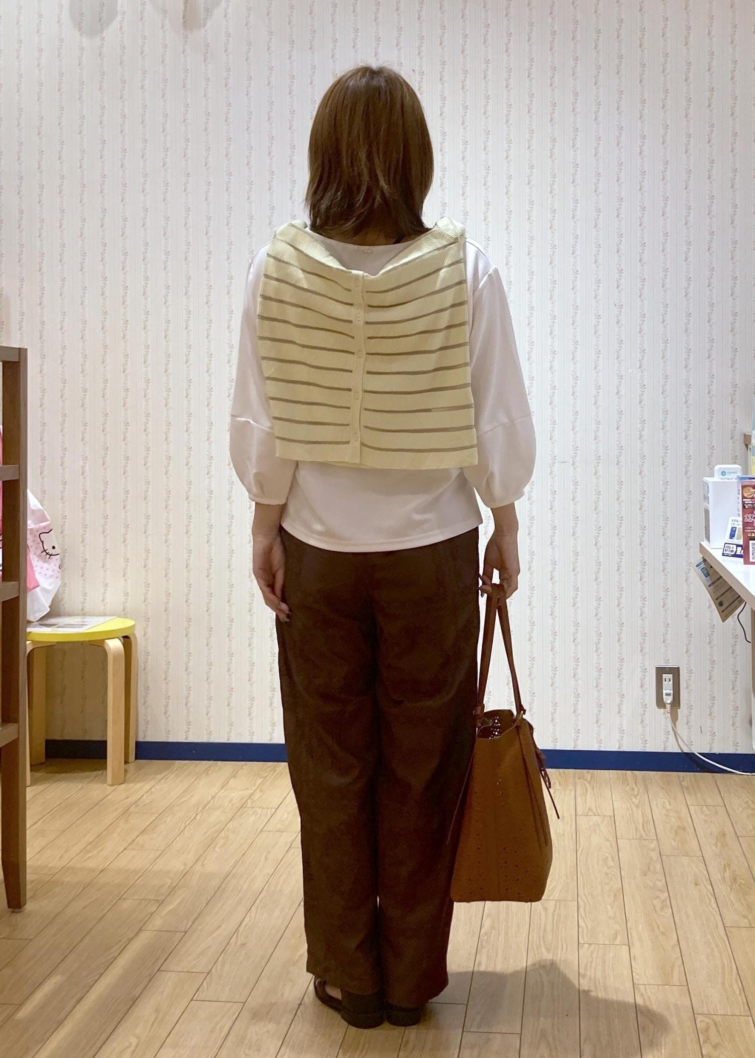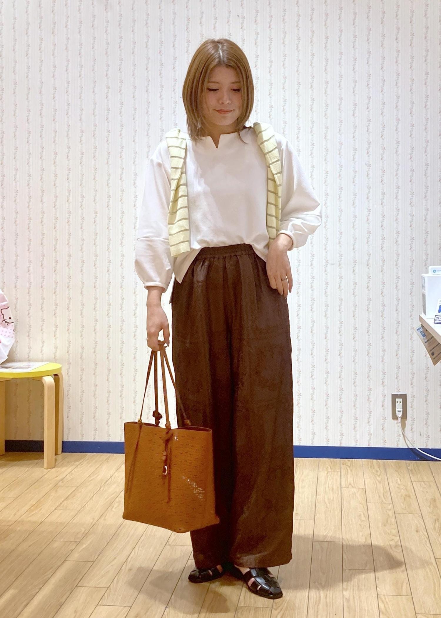肩がけしたカーディガンとレースパンチングのバッグで軽さを出して春らしさをプラスしました。