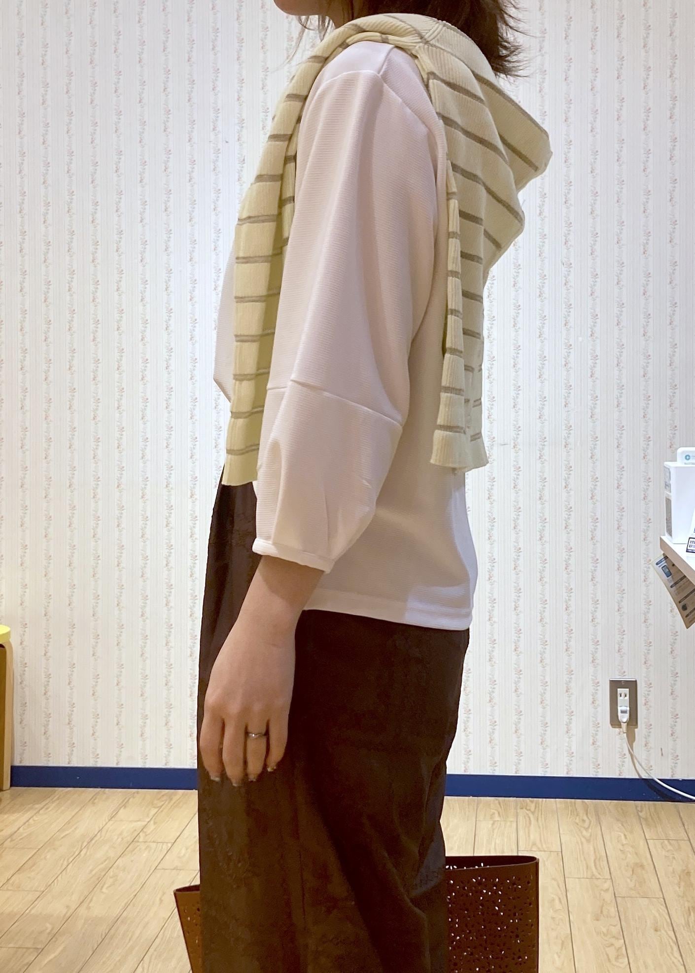 ゆったりとしたサイズ感で体のラインを拾わず着れます!