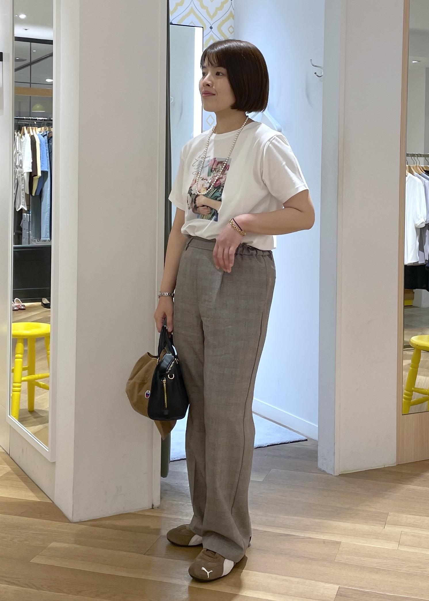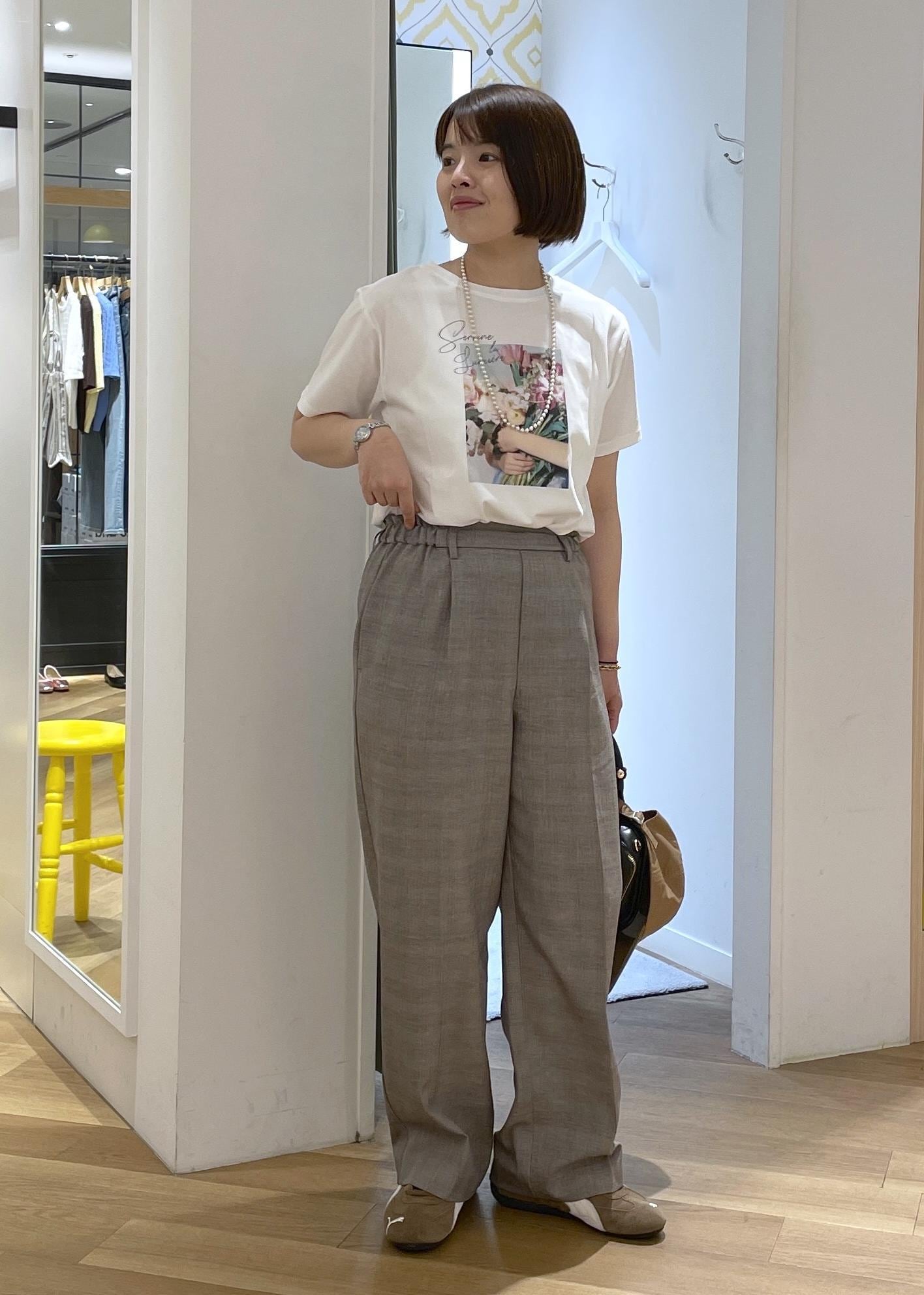 トラッドなチェック柄のパンツにフォトプリントのTシャツを合わせた、休日カジュアルコーデです!