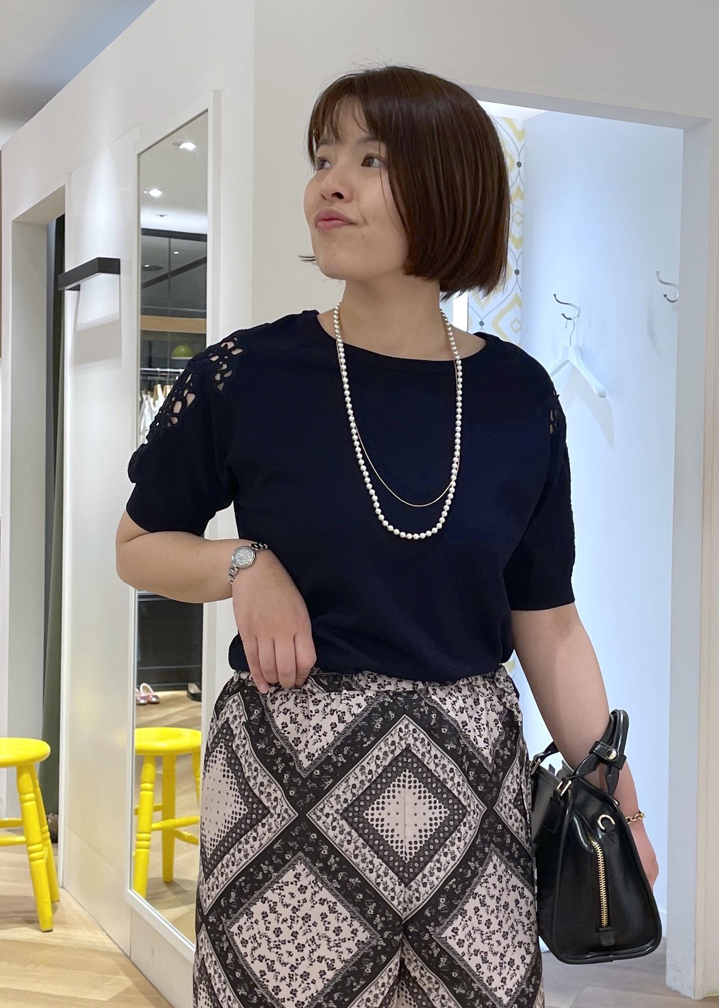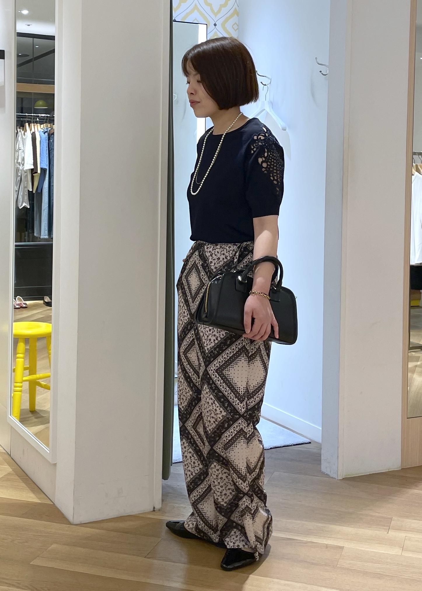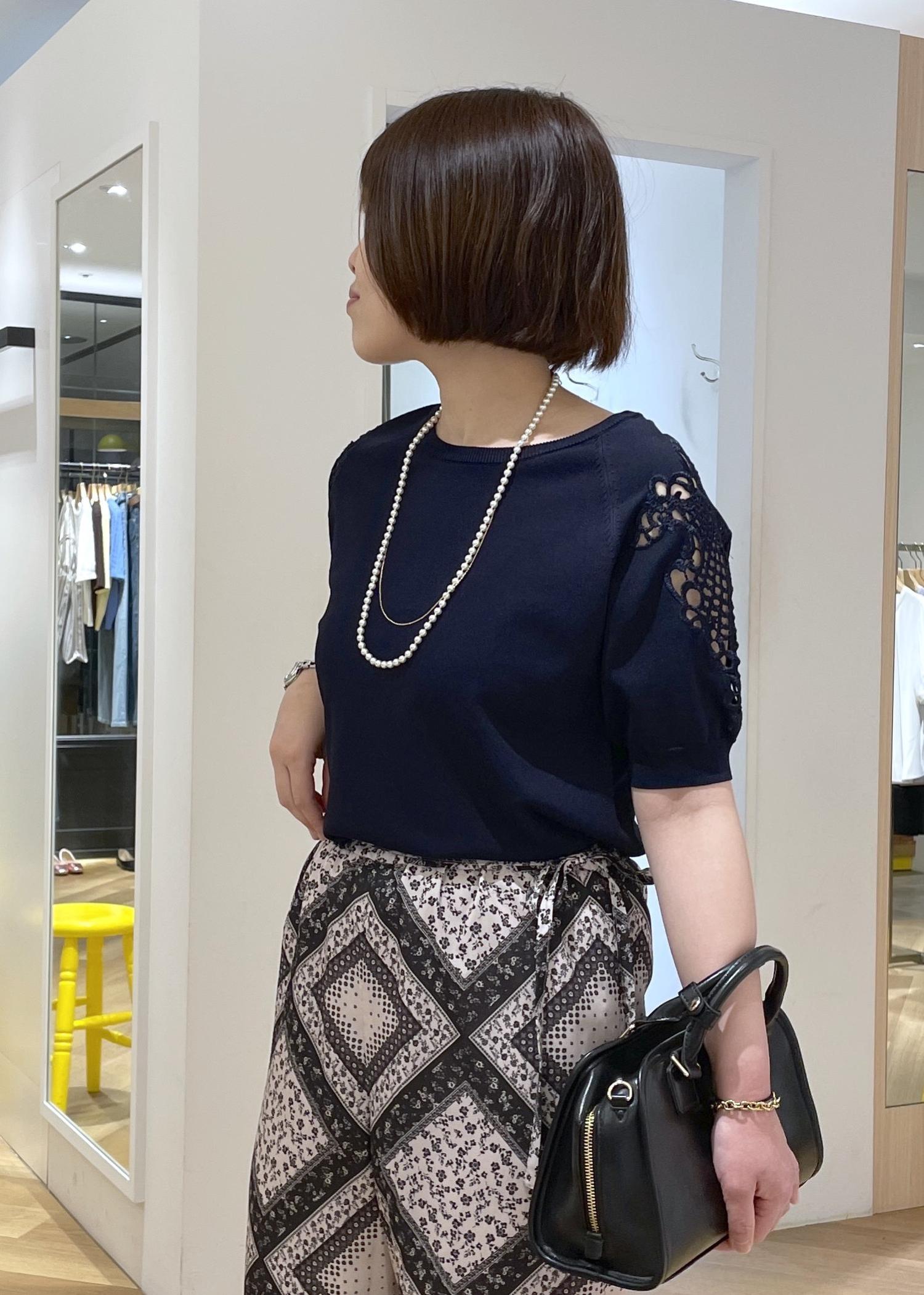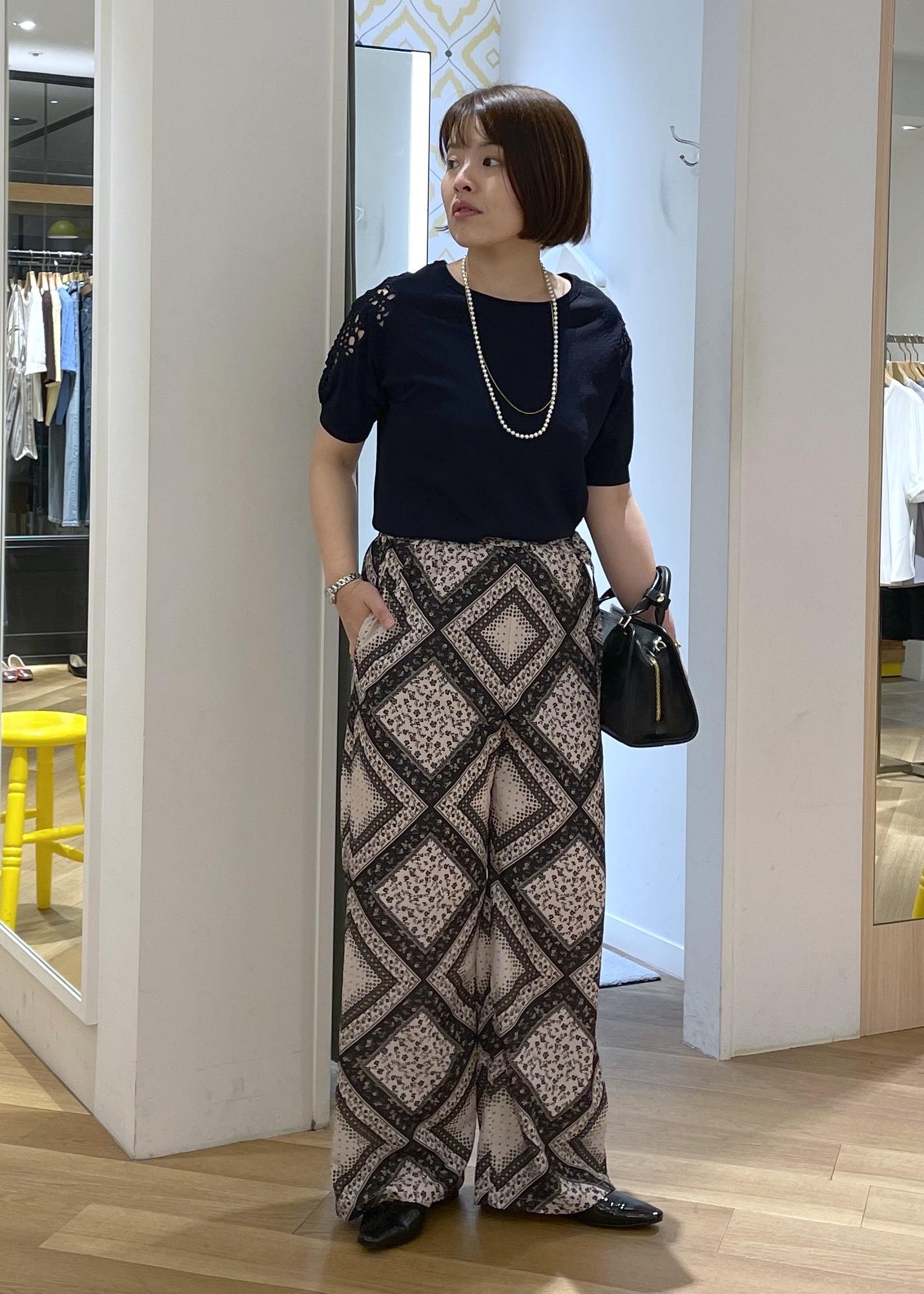 リラックス感あるスカーフ柄のパンツにきれい見えする袖レースのサマーニットを合わせた、女性らしさのカジュアルコーデです!
