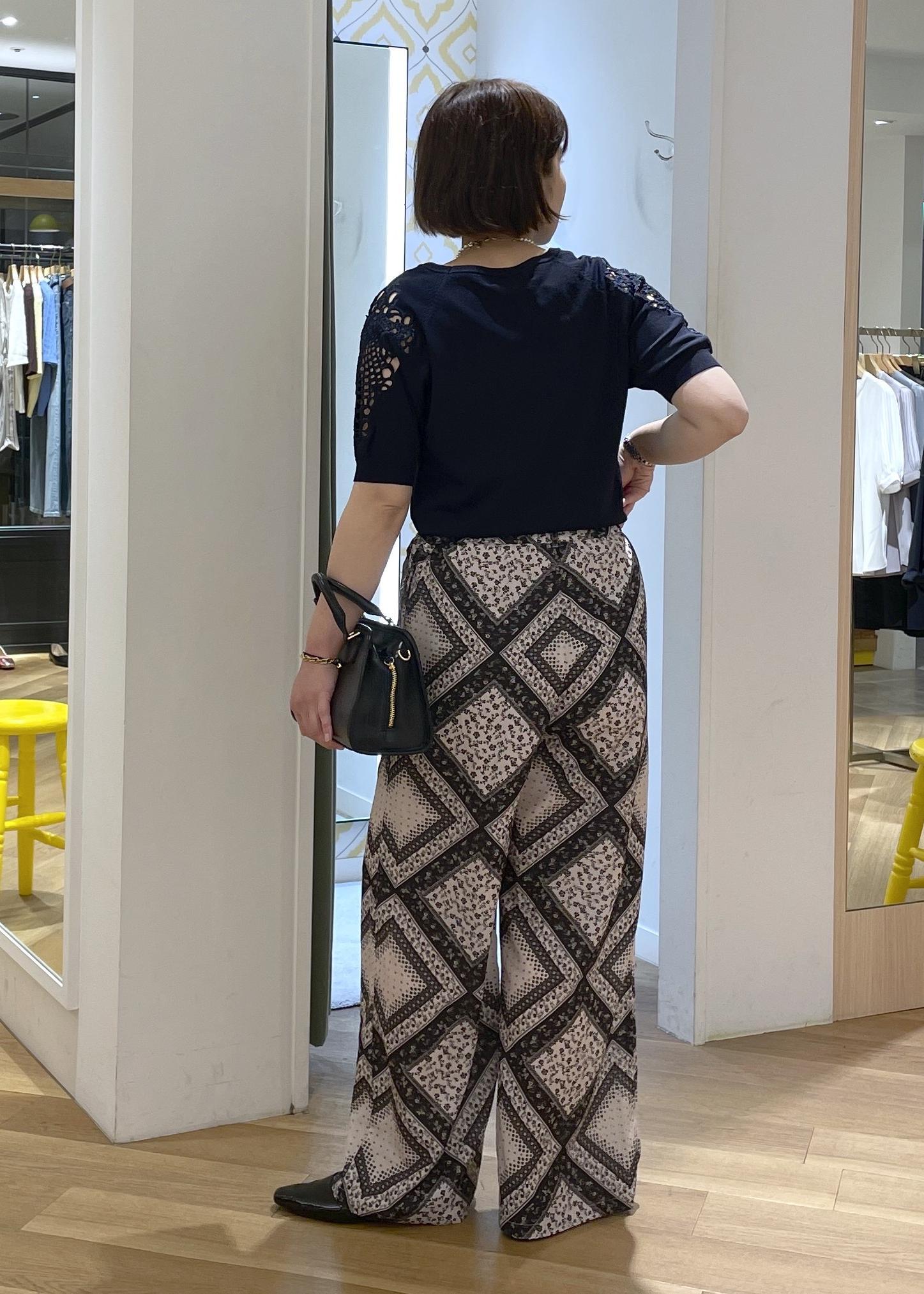 スカーフ柄パンツの袖レースニットコーデ