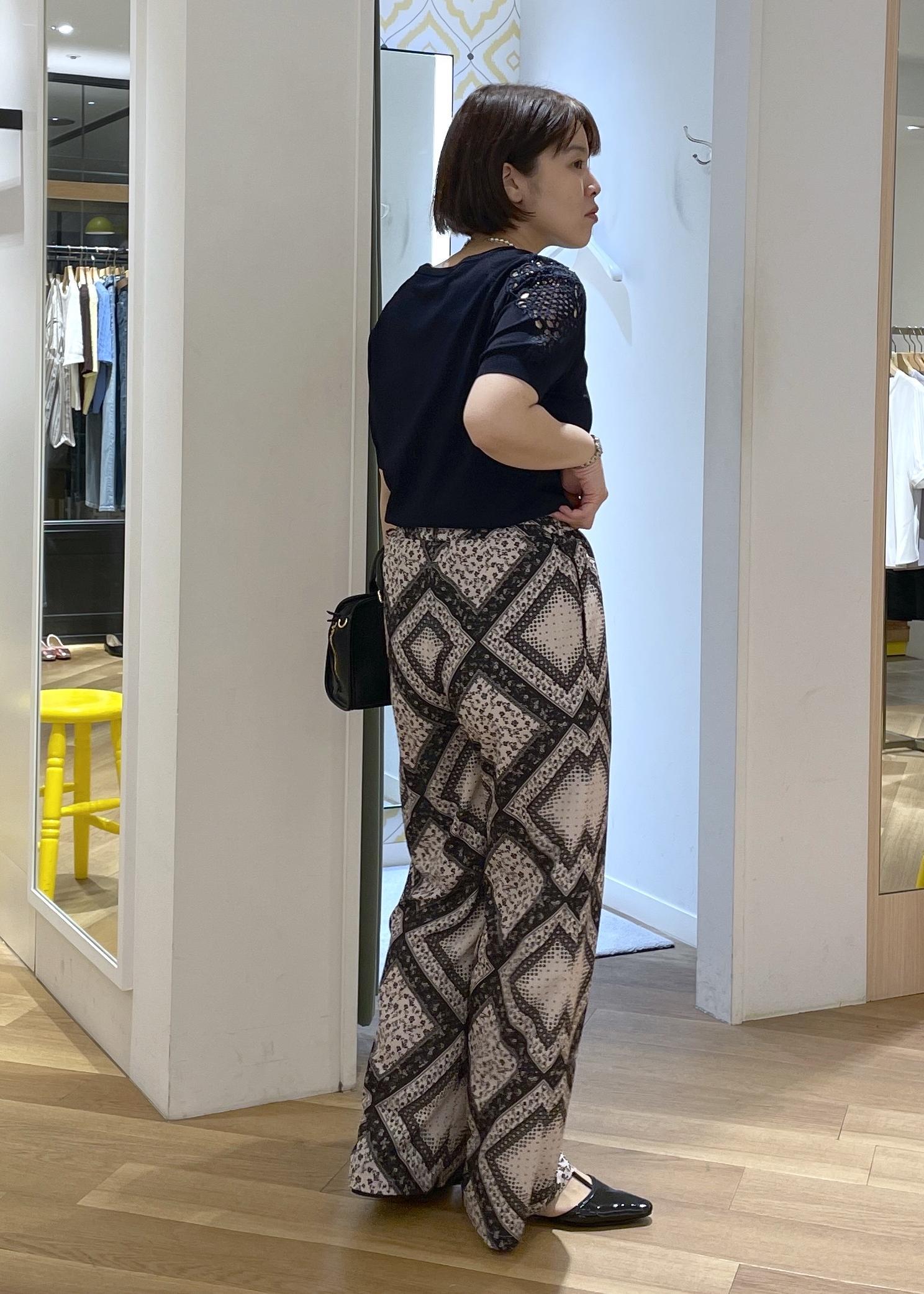 ROPÉ PICNICスカーフ柄イージーパンツブラック / M¥6,996レビューさらりとした薄地の生地で、肌離れも良く夏も着やすいパンツです。ウエストはゴム仕様でリラックス感のある履き心地です。全面のスカーフ柄がコーディネートのアクセントになります。今回はMサイズ着用で、着丈はフラットシューズだと地面に擦りそうな長さでした。シルエットもルーズな雰囲気で合わせて頂けるサイズ感です。