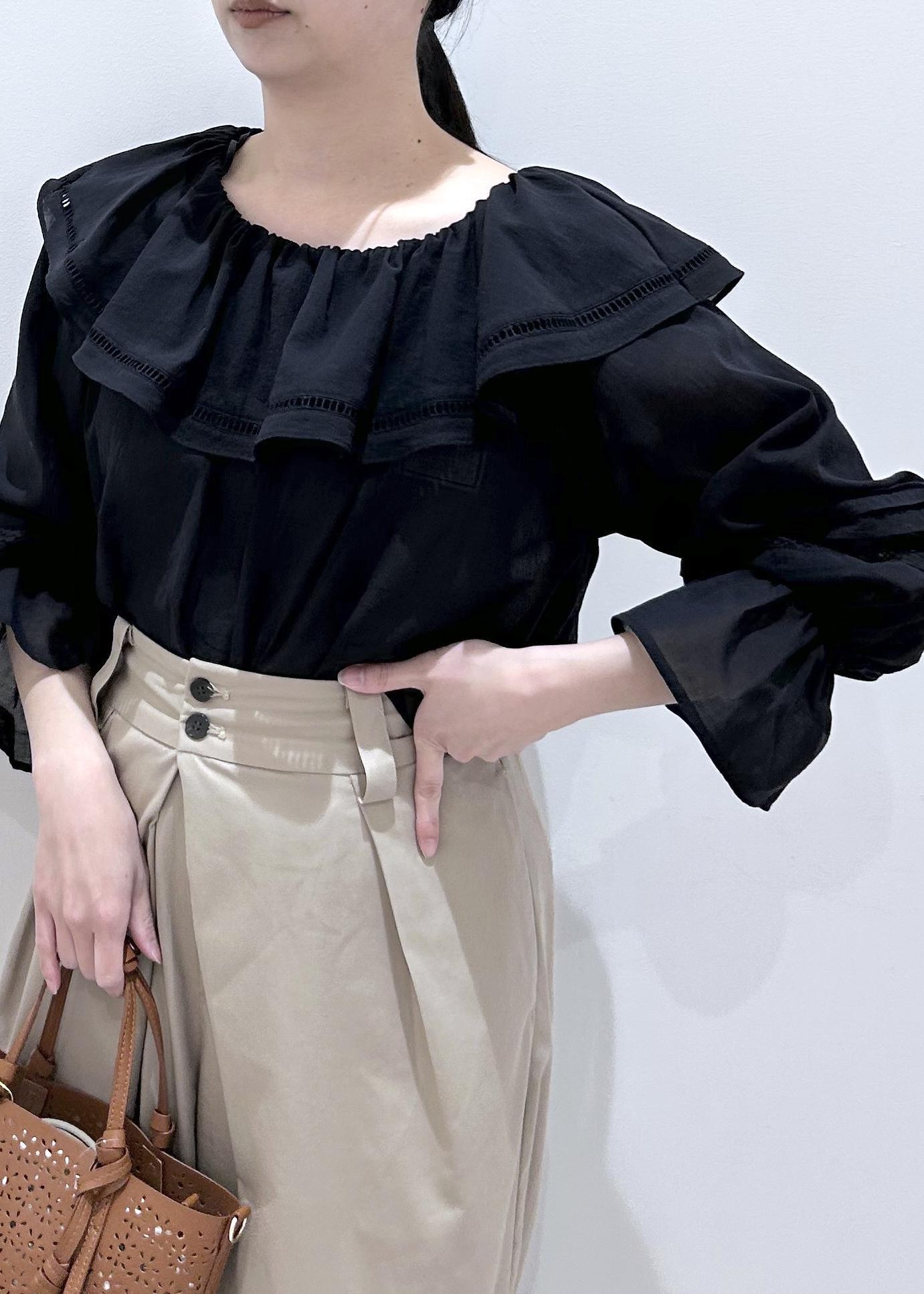 ゴムが入っているのでオフショルにしやすく、袖もゴムが入っていて手洗いもしやすく便利なトップスです◎