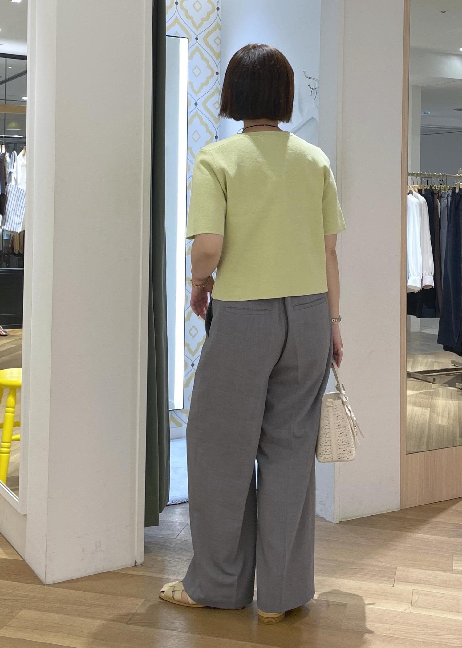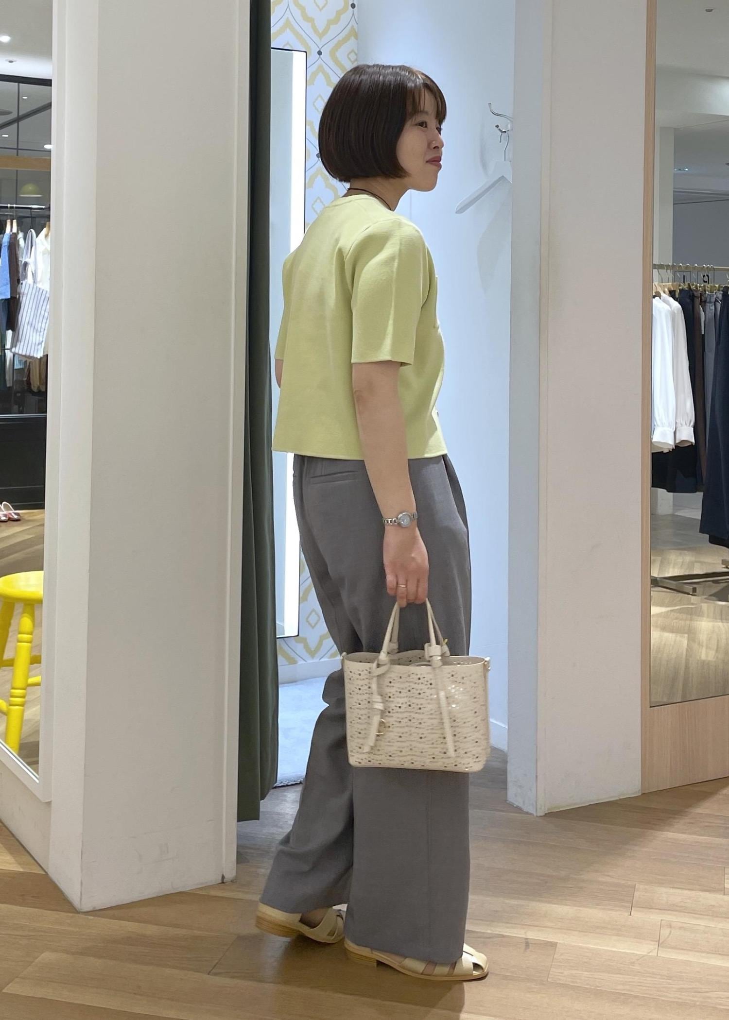 爽やかなキミドリがポイントになるカーディガン、スマート雰囲気のグレーのワイドパンツ合わせたきれいめカジュアルコーデです!