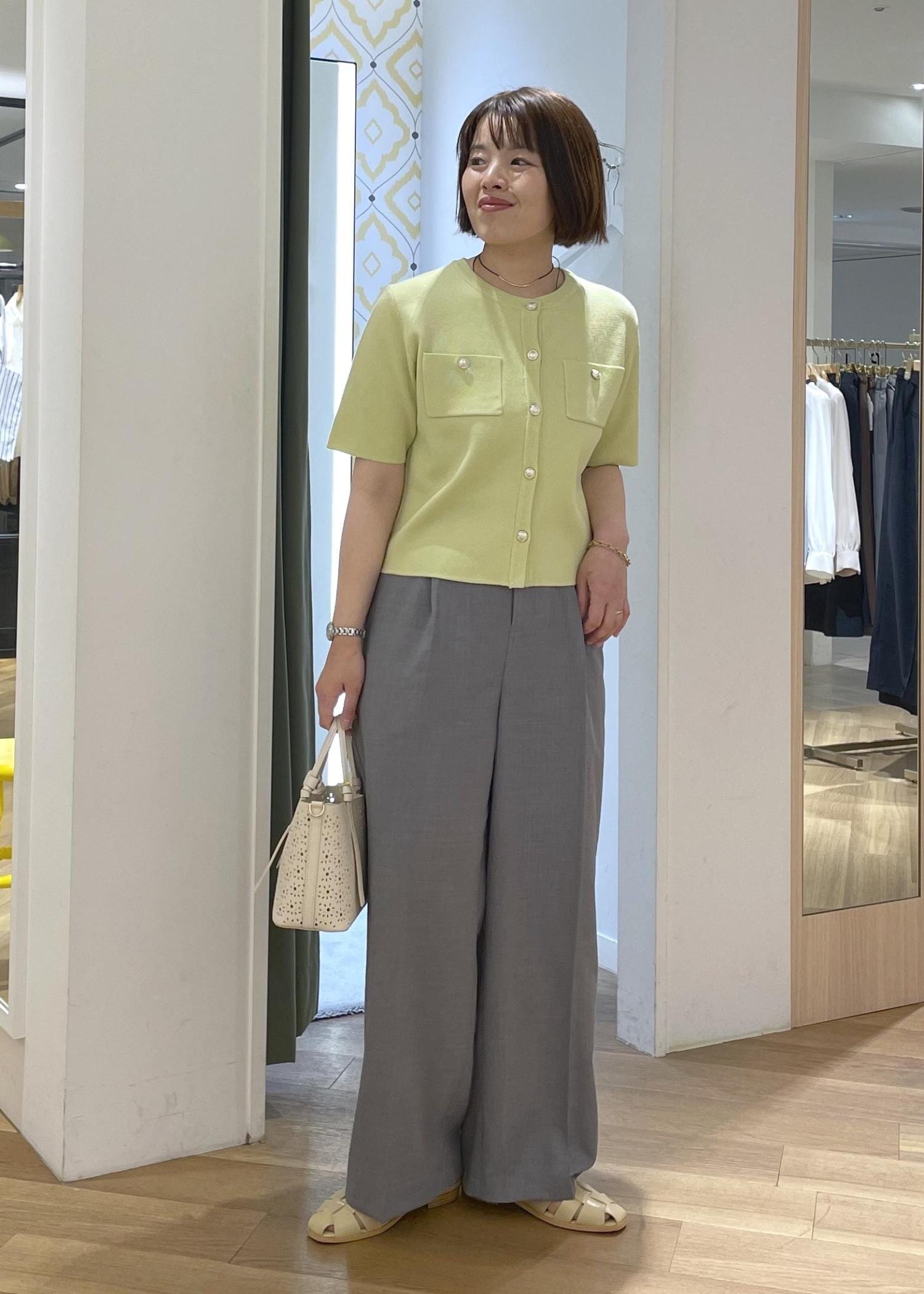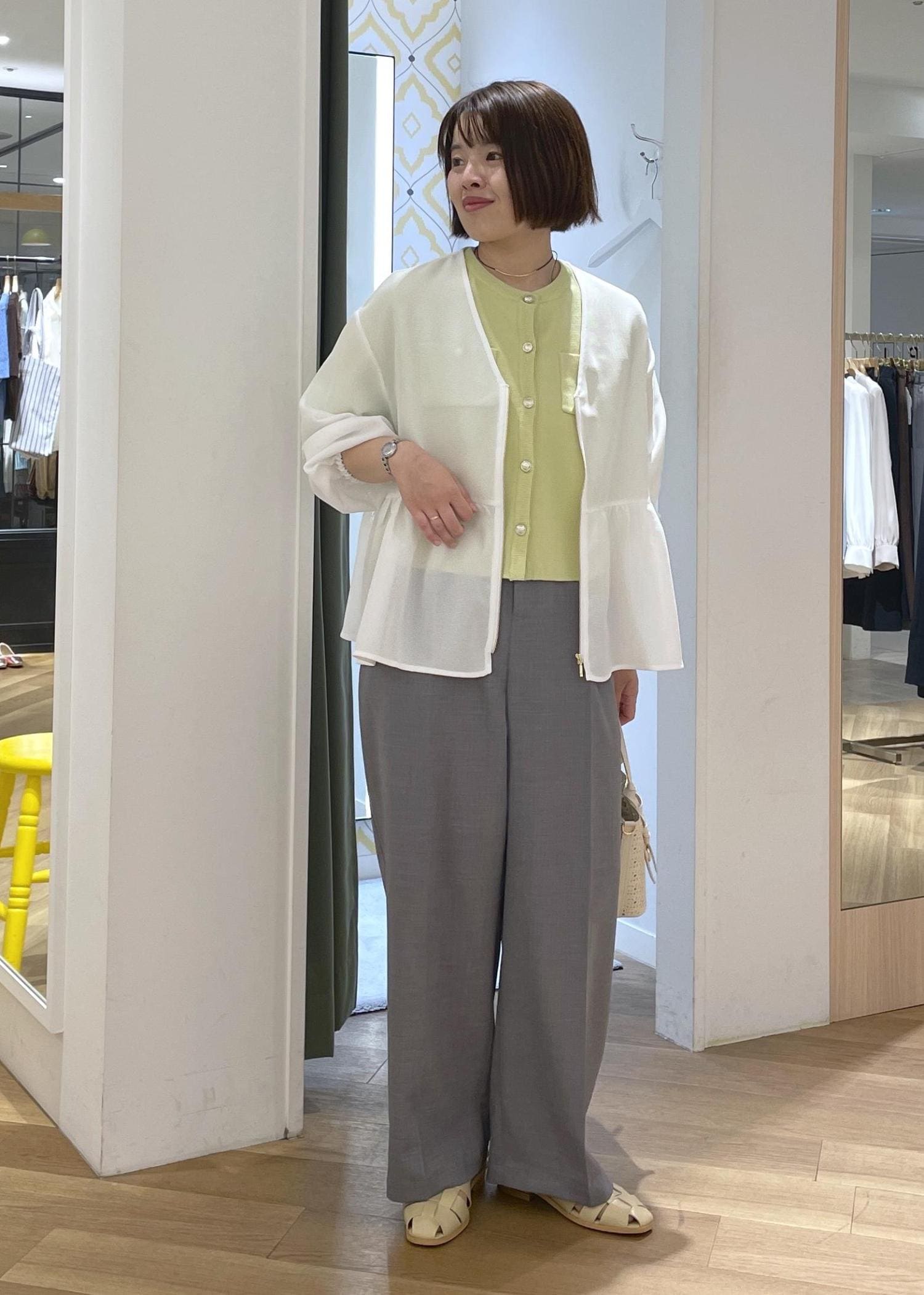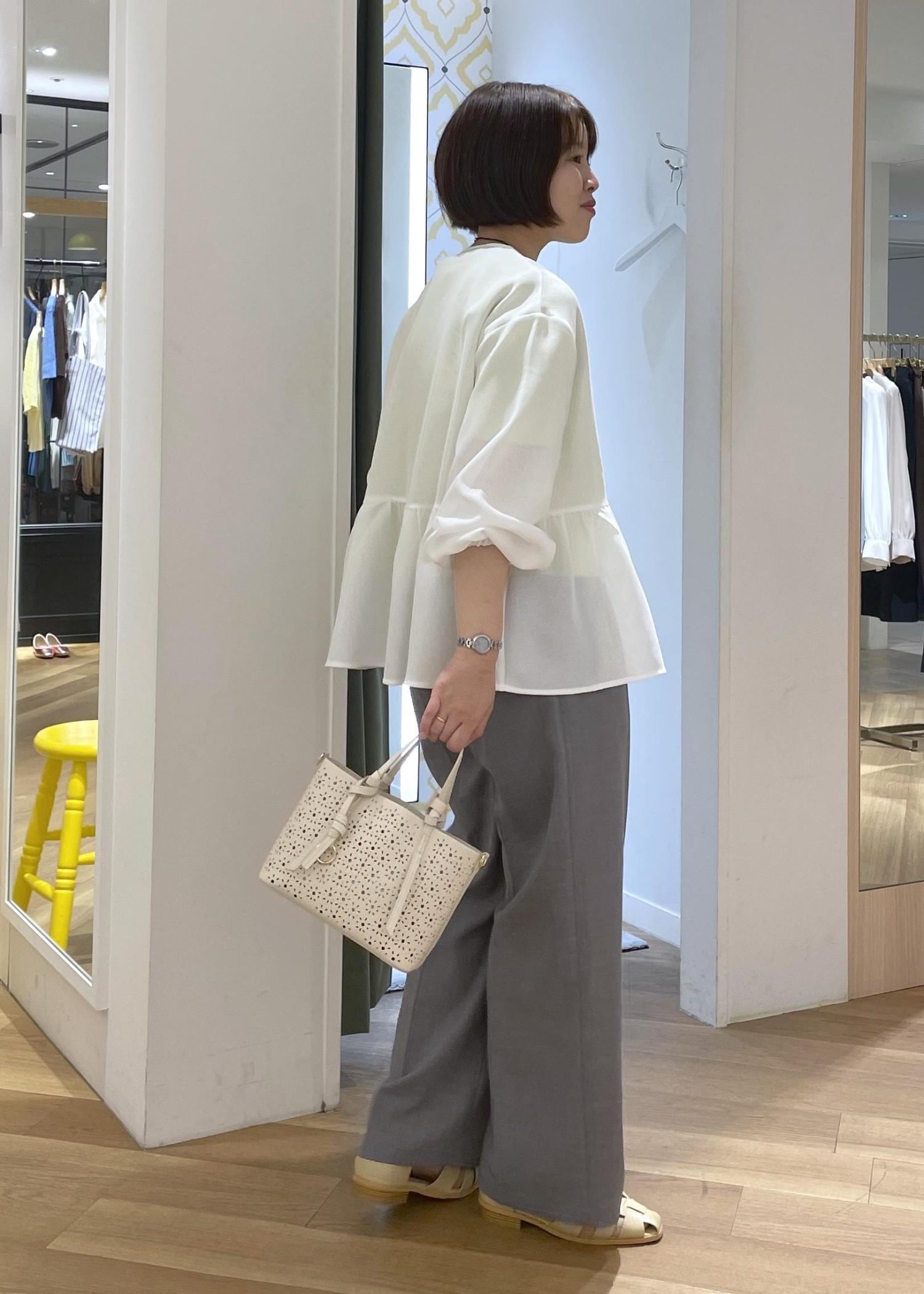 ボトムはグレーのワイドパンツを合わせて、甘過ぎないスマートな印象もプラスしました◎