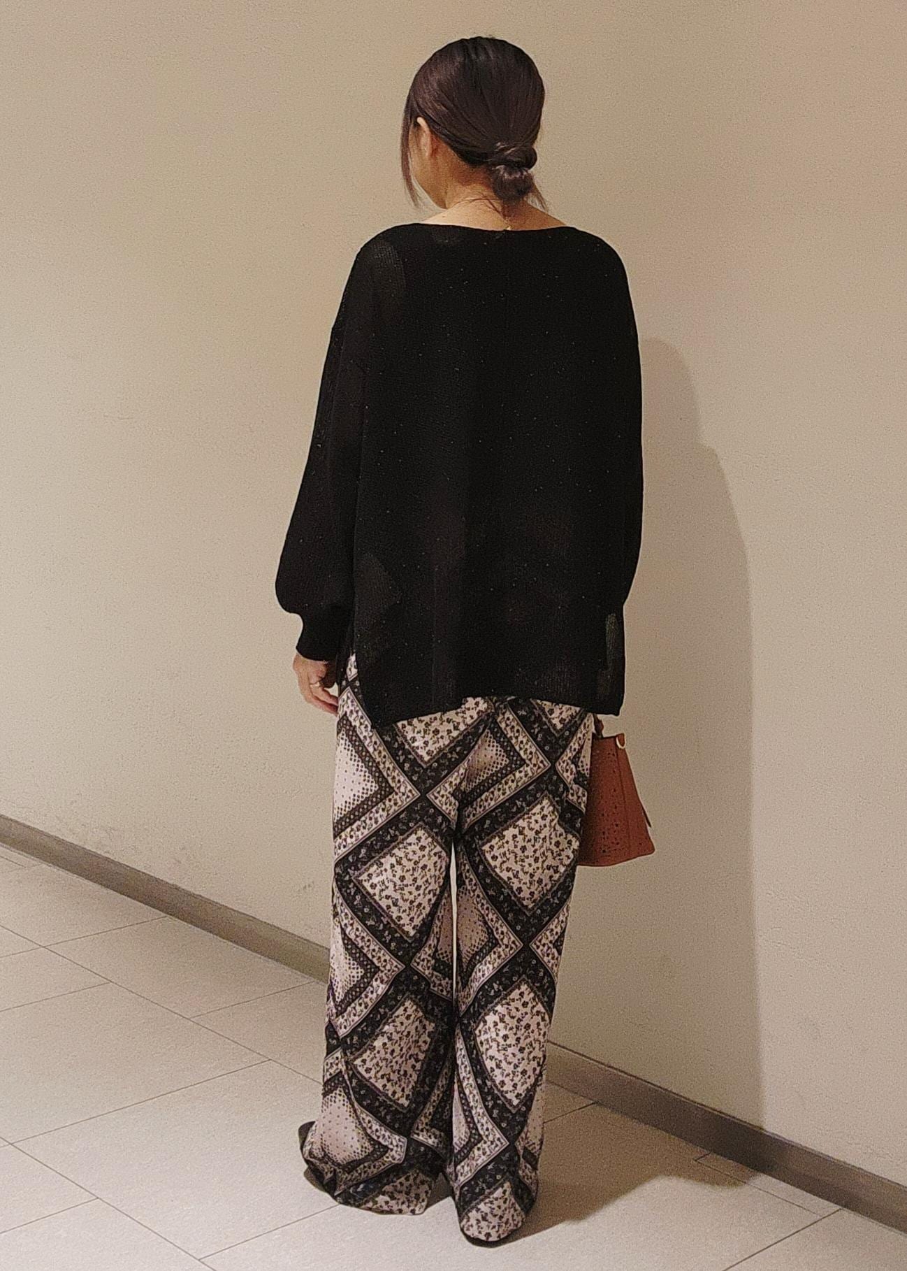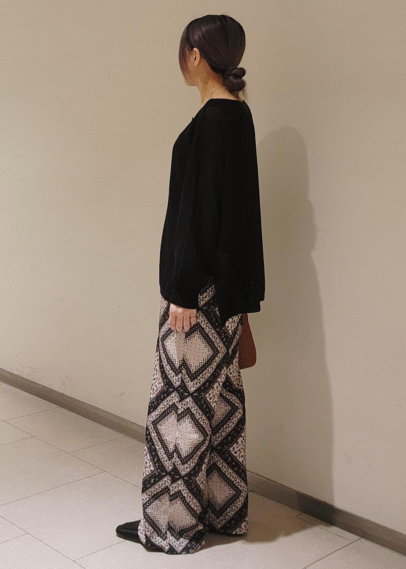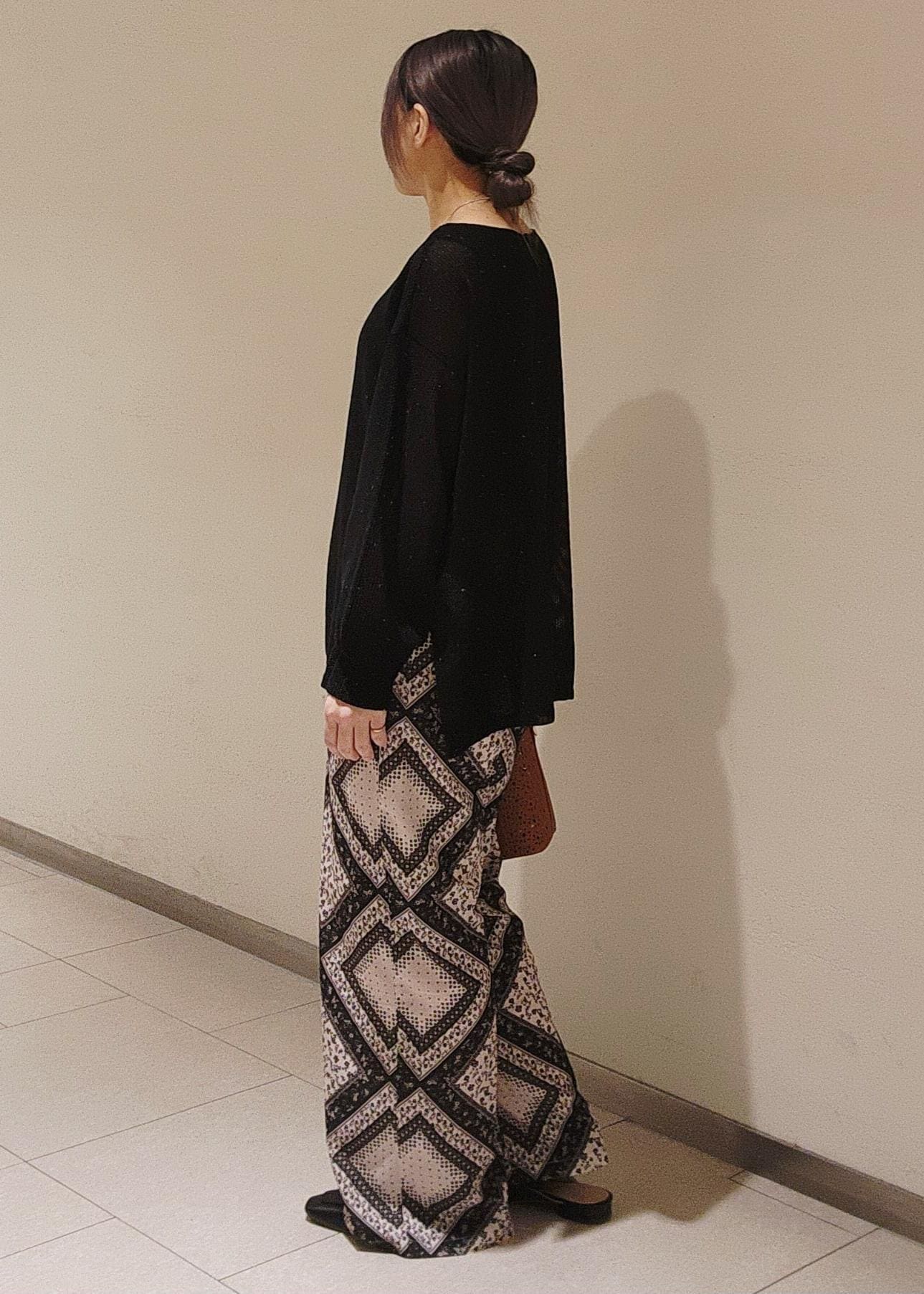 サラッとした柄ボトムスを合わせて、リラックス感のあるコーデにしました。