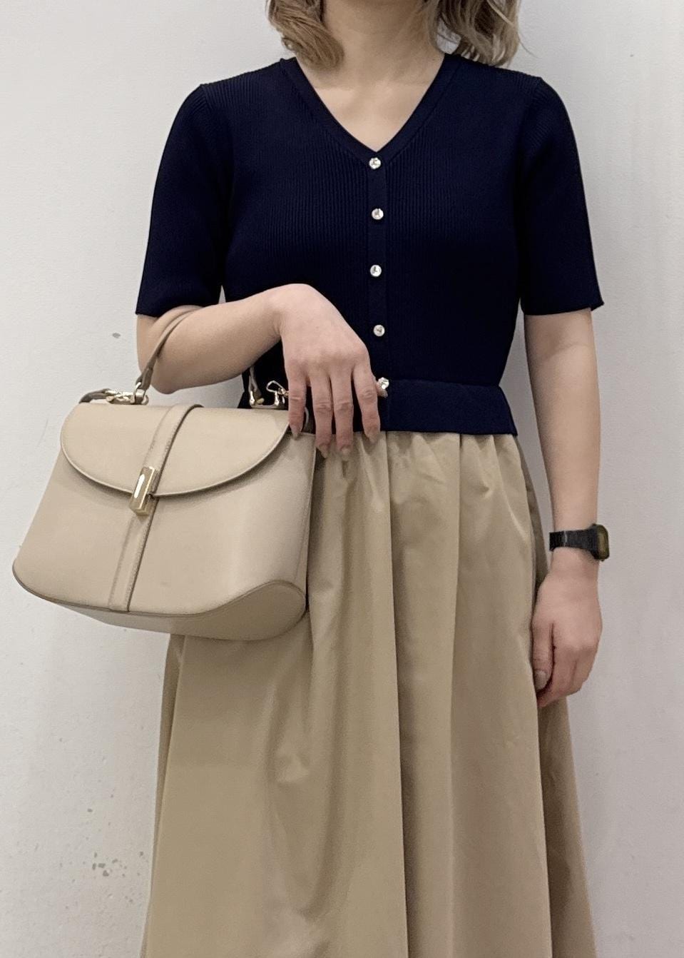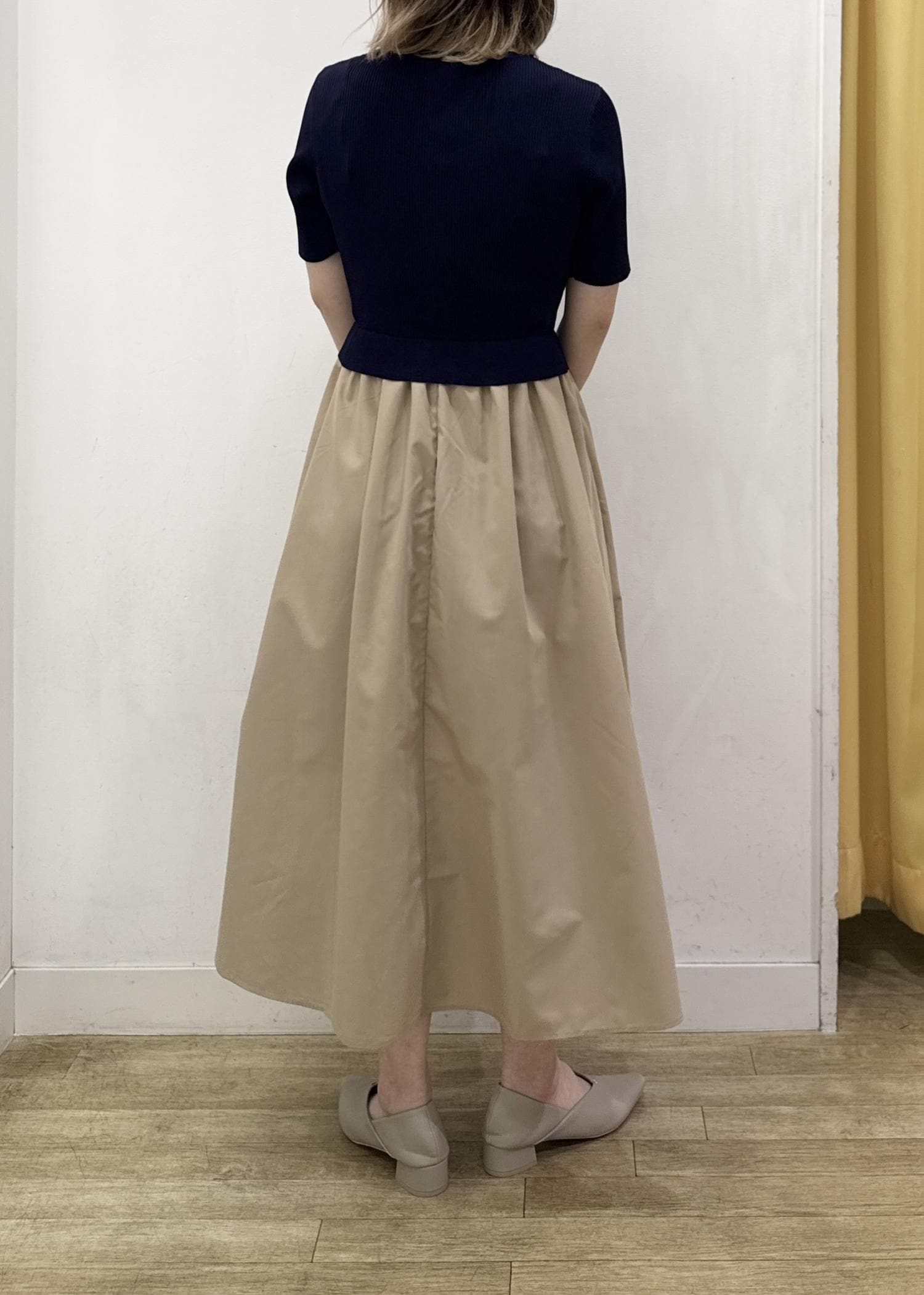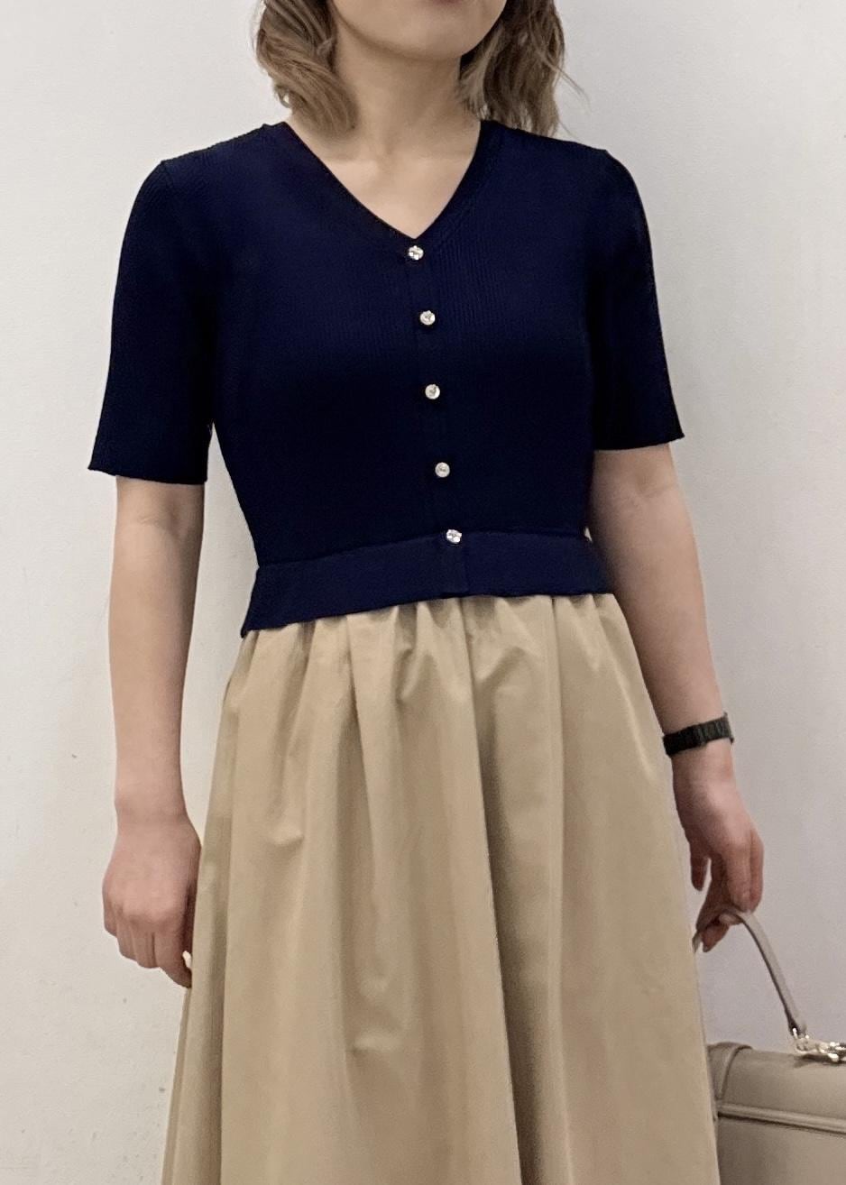 メタル釦布帛ドッキングハーフスリーブニットワンピース