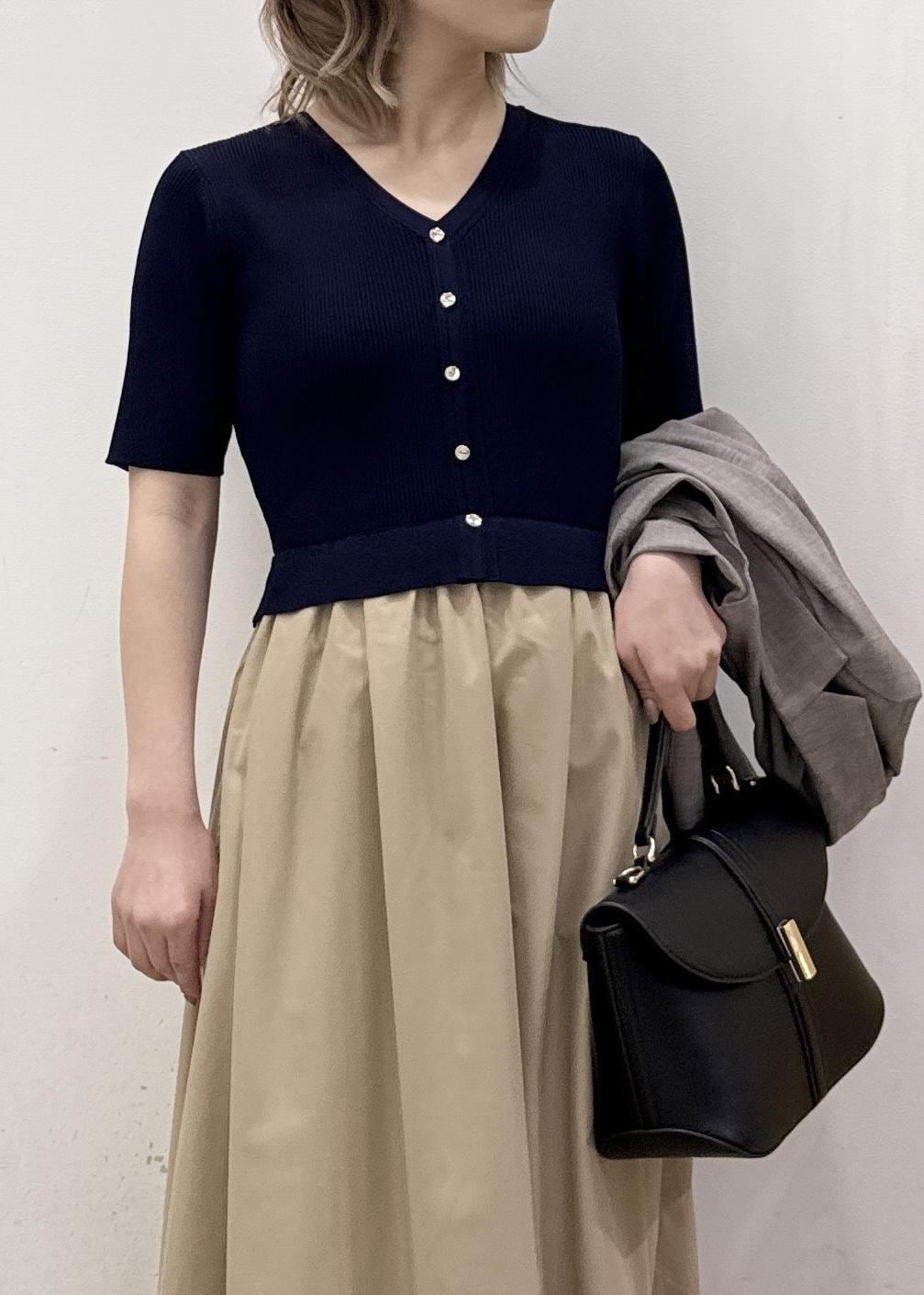 メタル釦布帛ドッキングハーフスリーブニットワンピース
