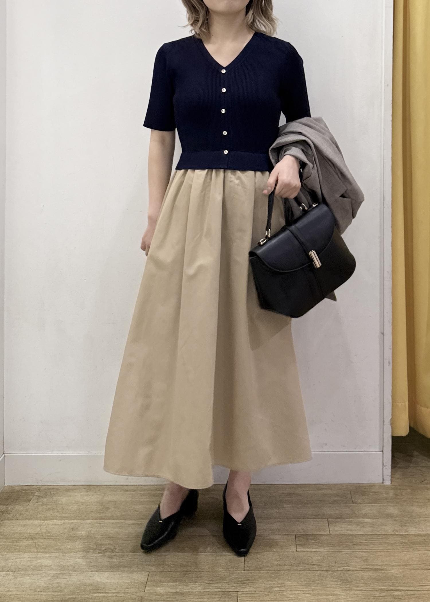 スカート部分がふんわりとフレアなシルエットで、着るだけでメリハリの出せるワンピースになります。