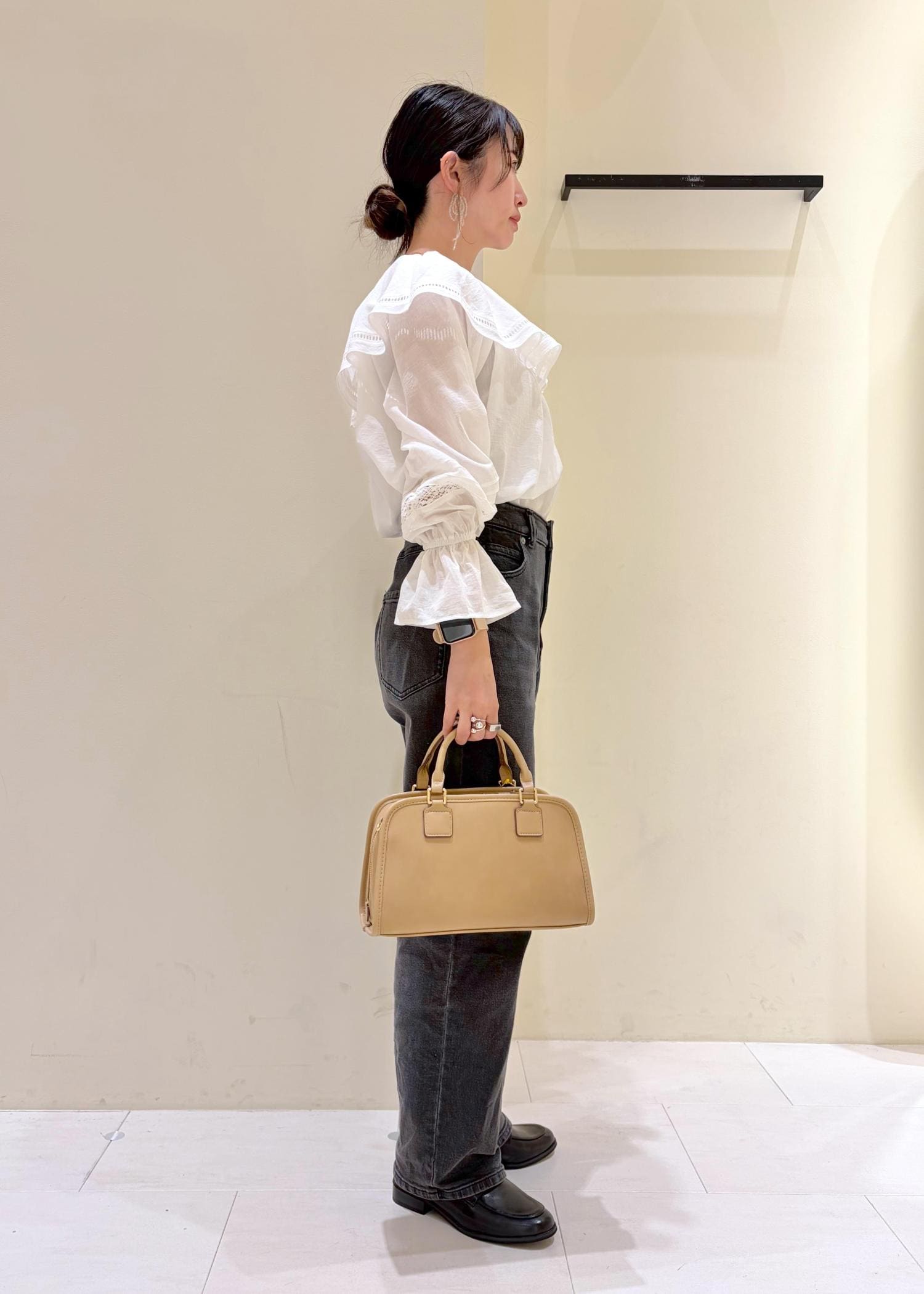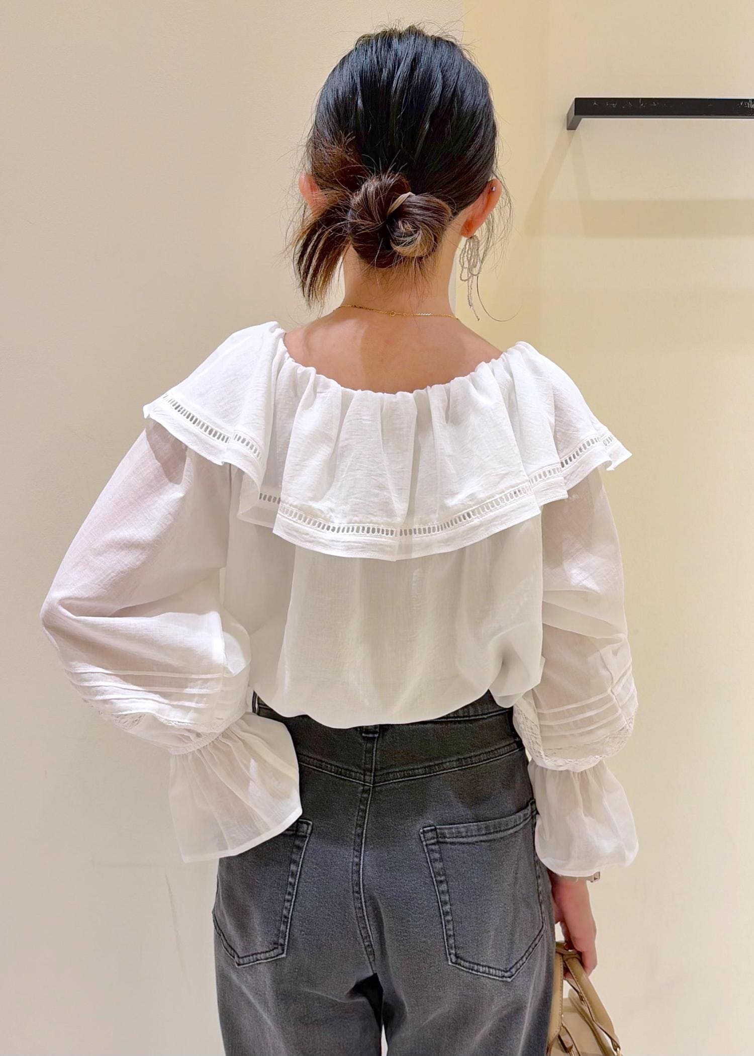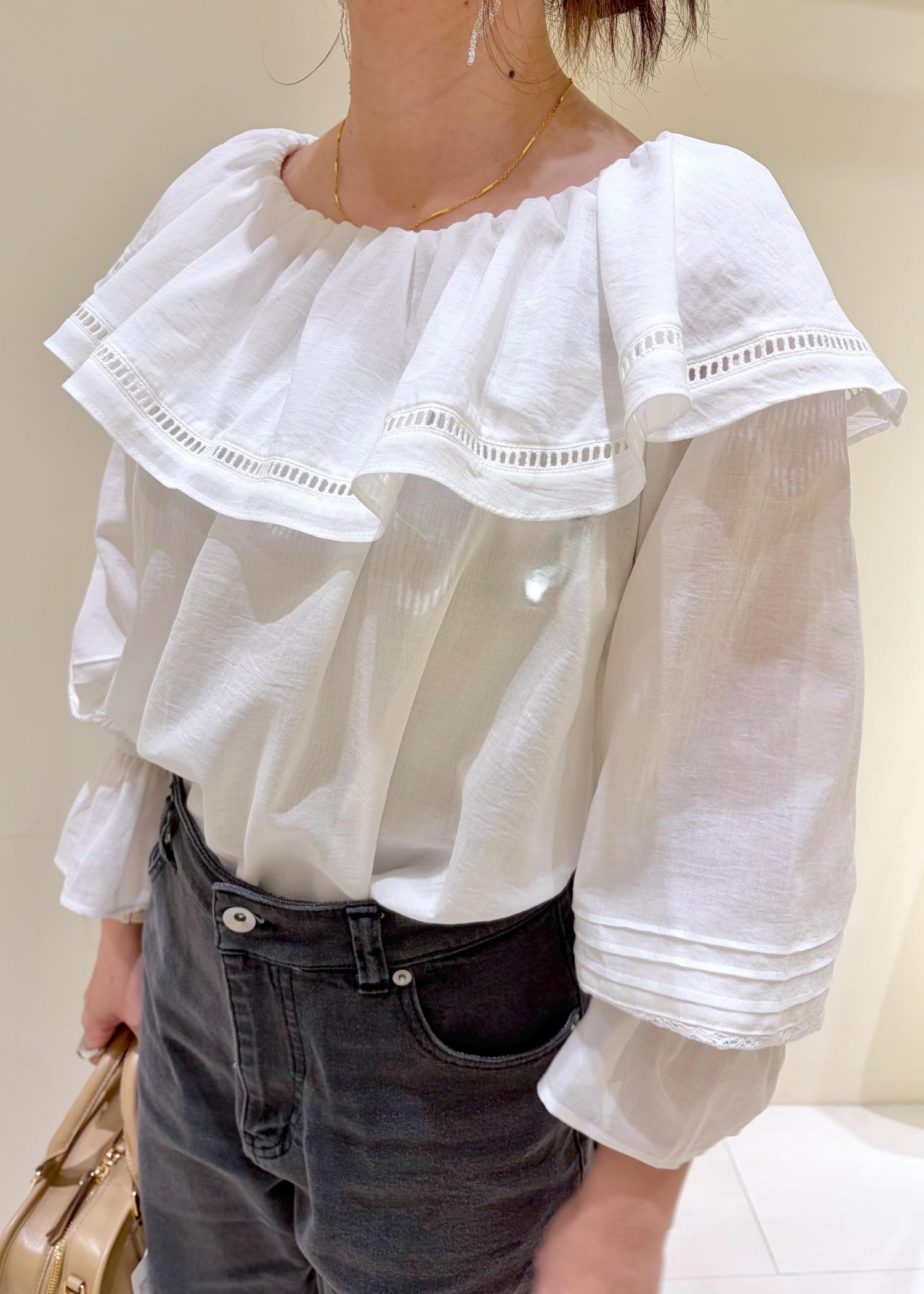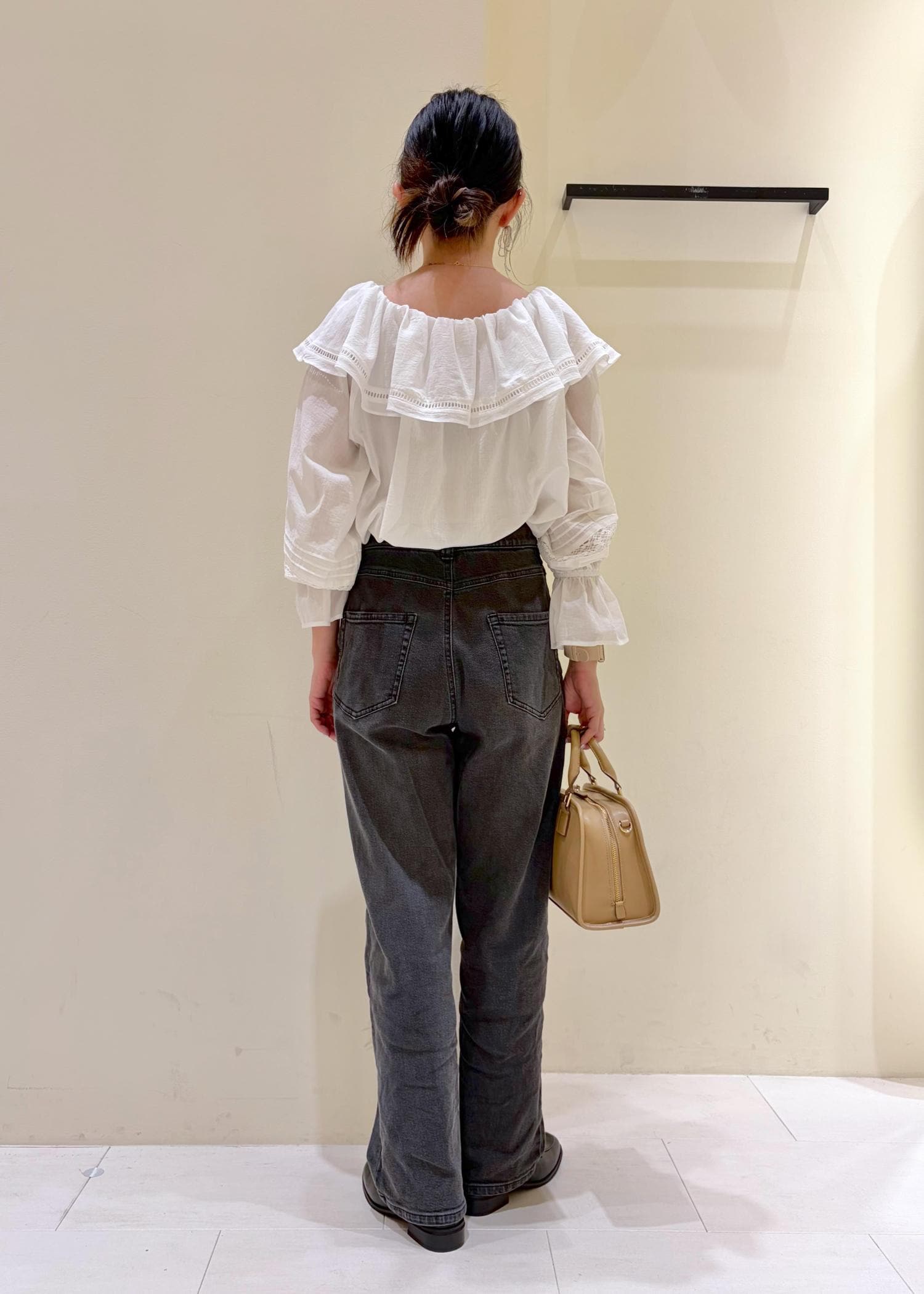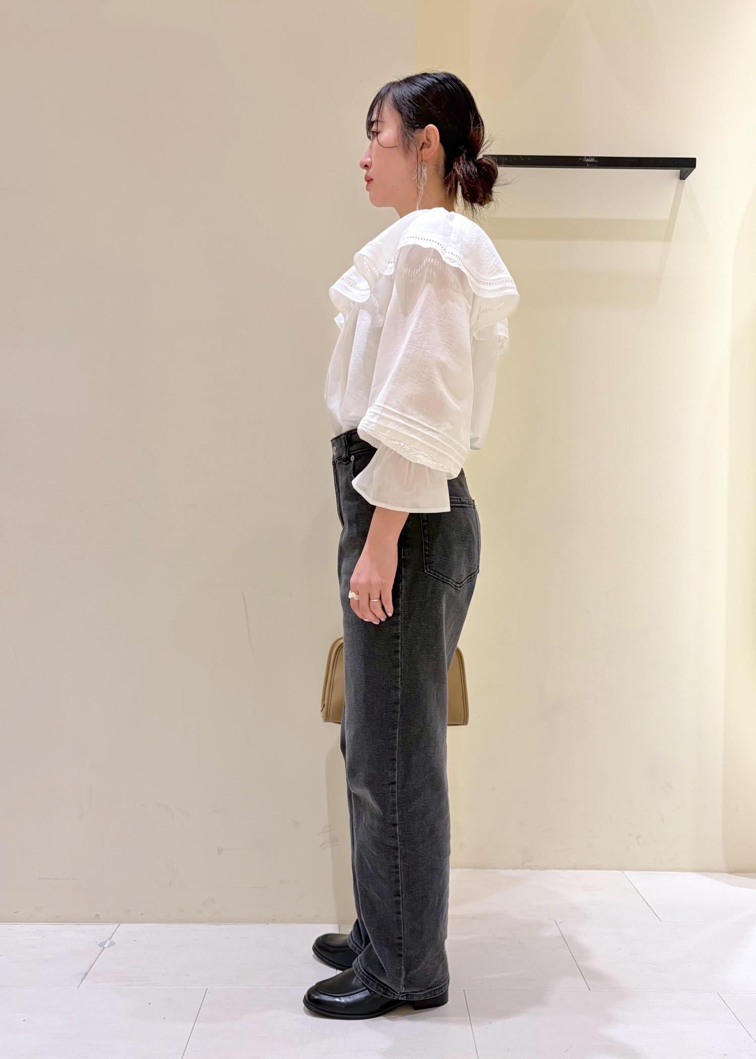 フリルブラウスを使った甘くなりすぎないシンプルコーデ。