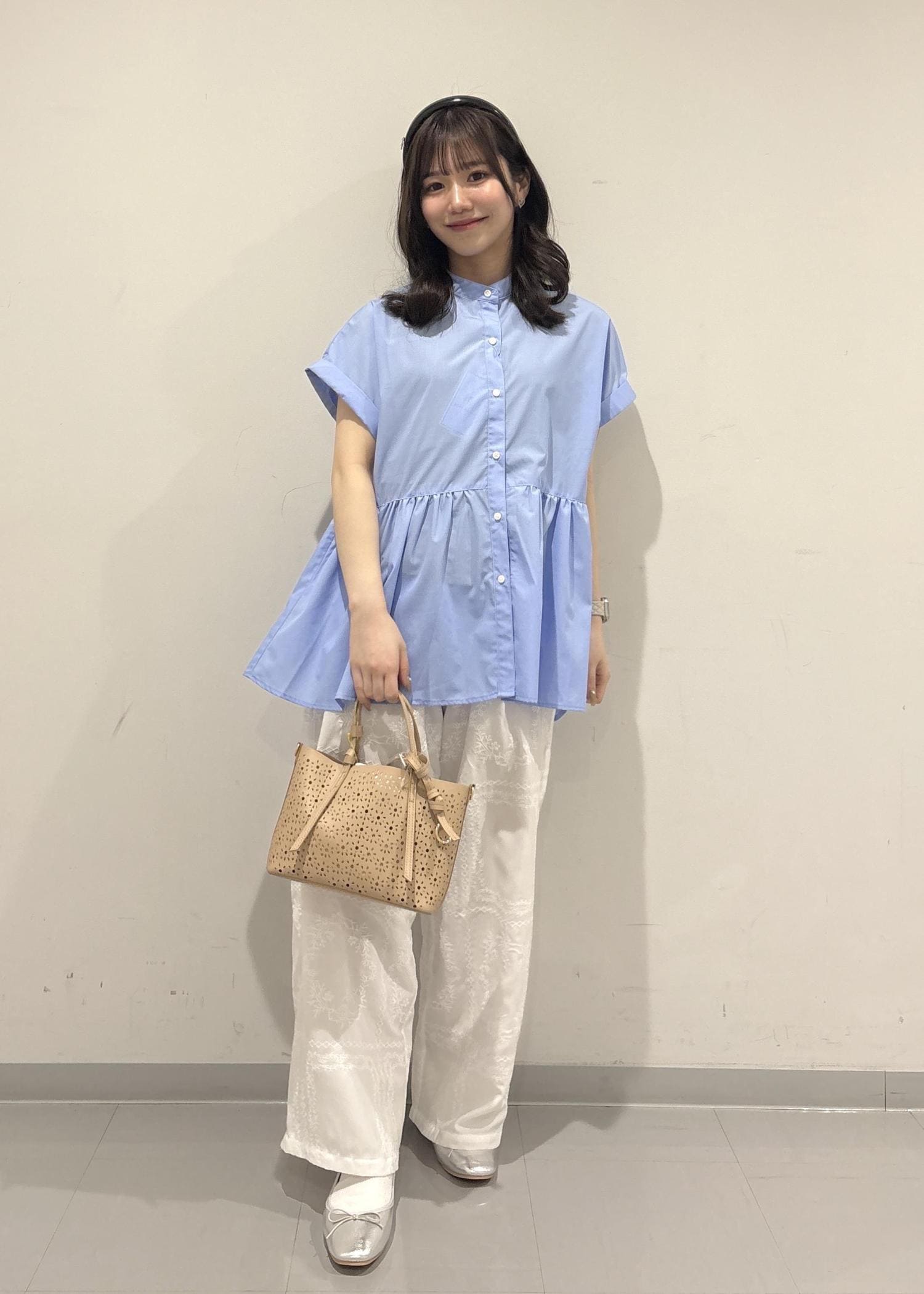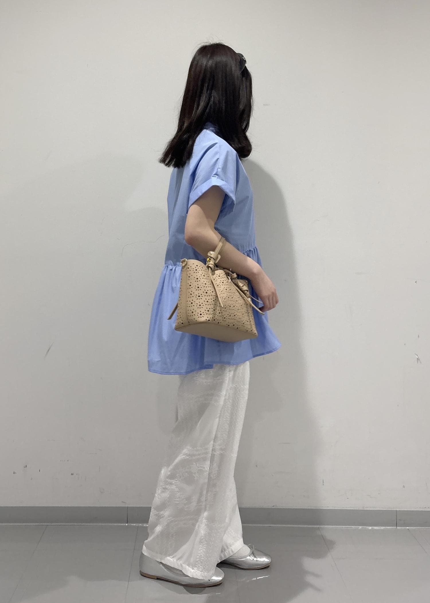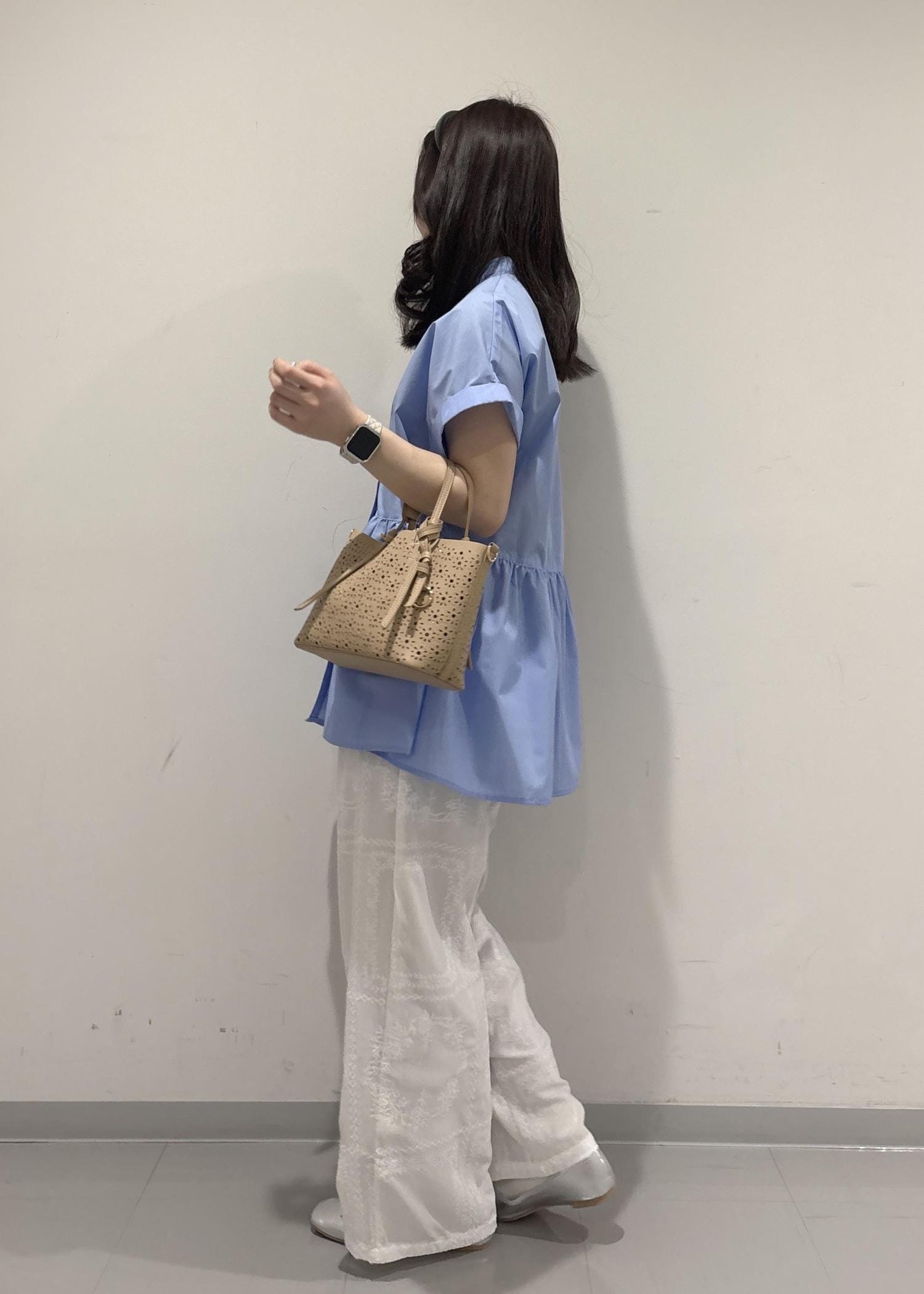 ふんわりとしたペプラムデザインで甘い雰囲気を出して、爽やかなブルーで春夏っぽい印象になります!パンチングレースのバッグで抜け感を出して、シルバーのバレエシューズは足元もリボンで可愛らしい雰囲気を出してみました!