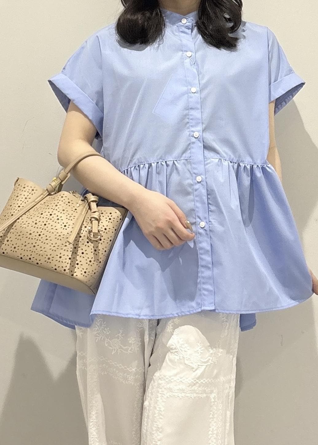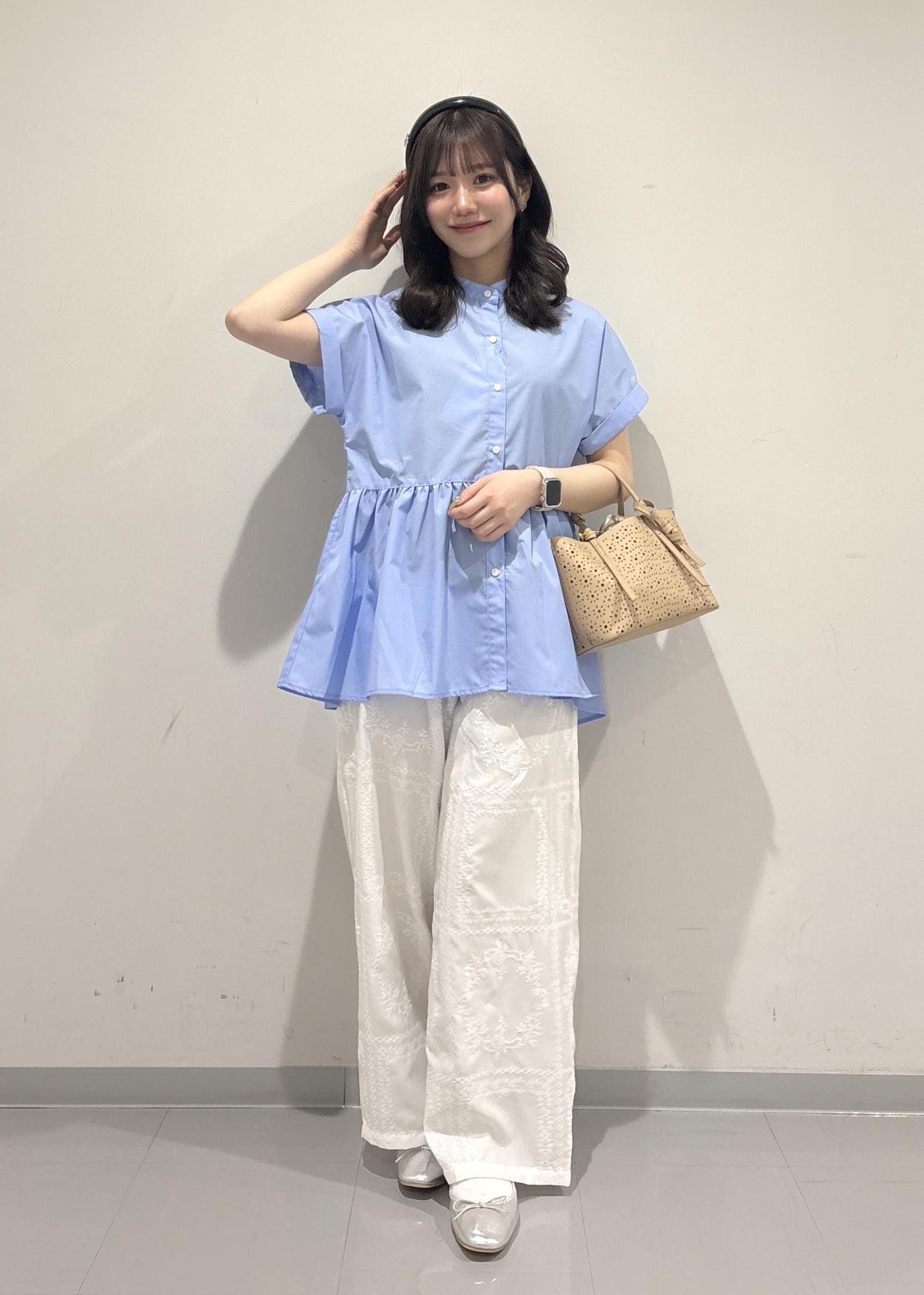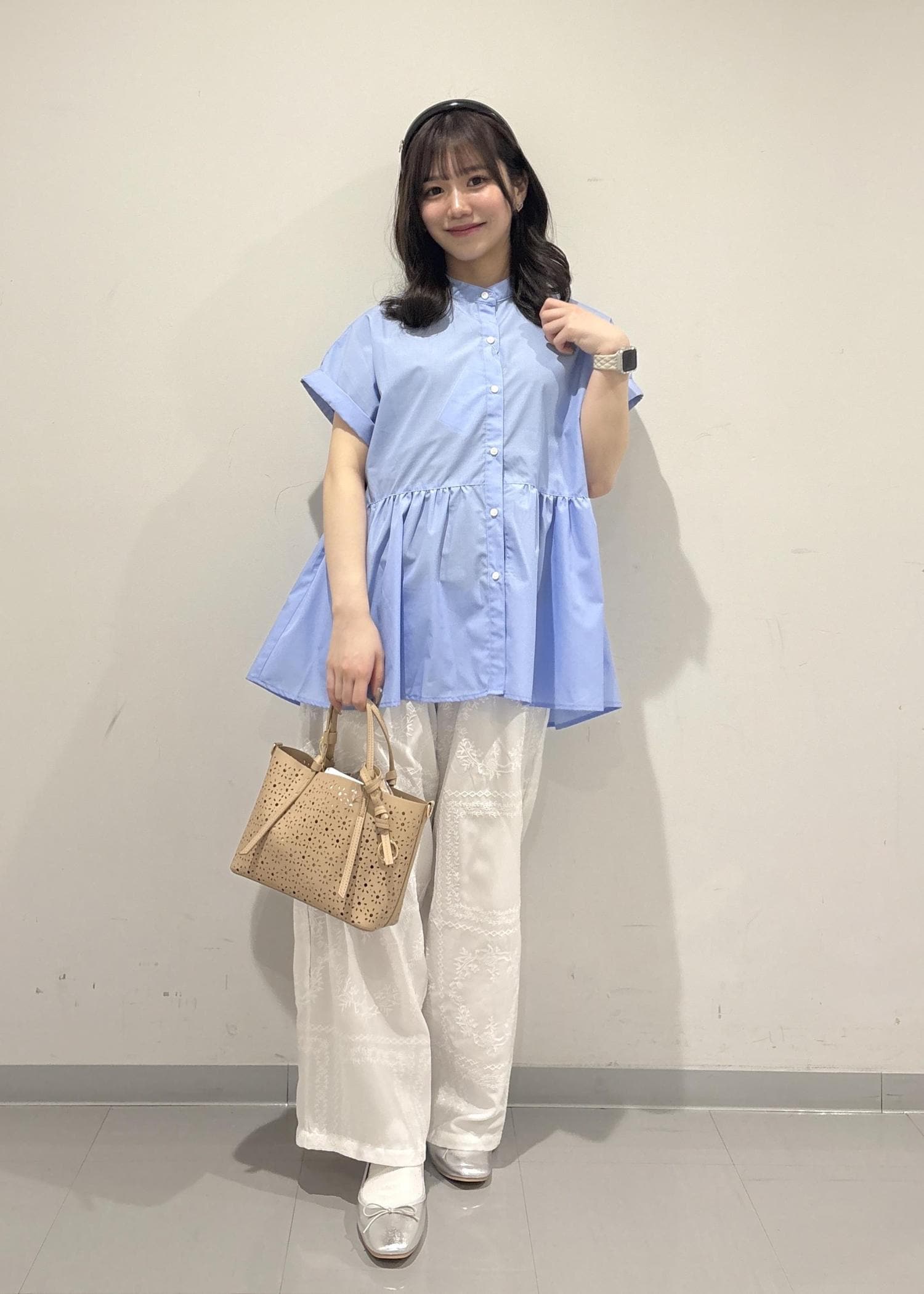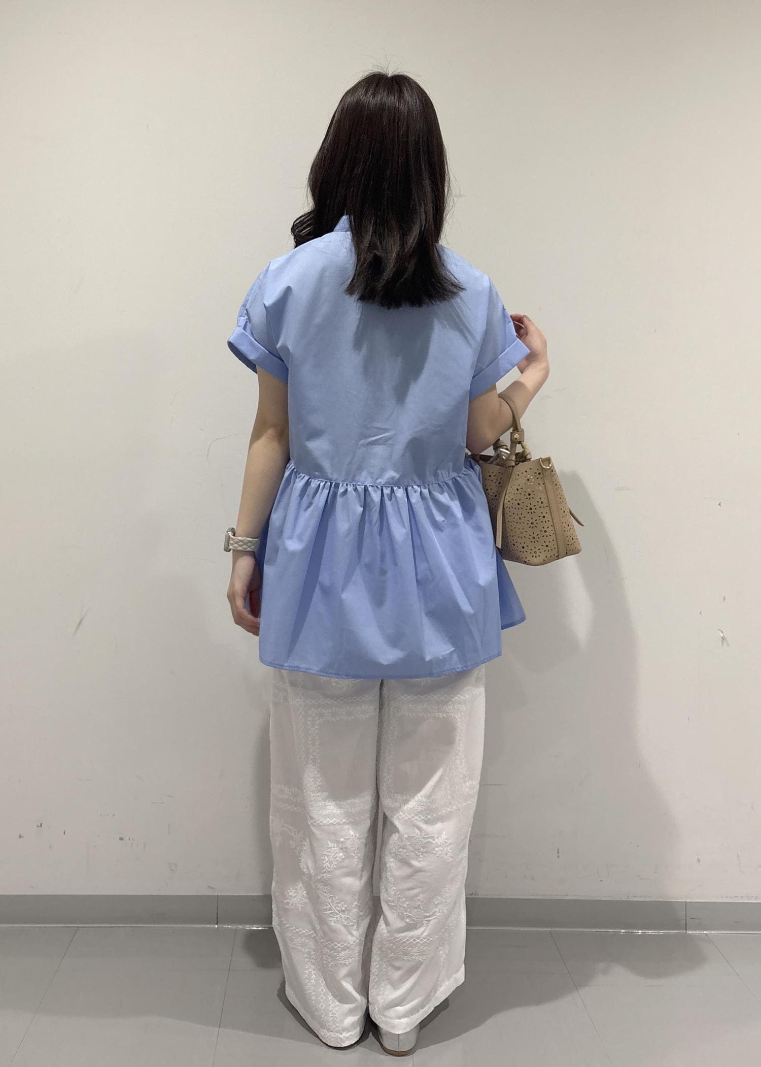 こちらのコーデのポイントは、ブルーのペプラムシャツです!