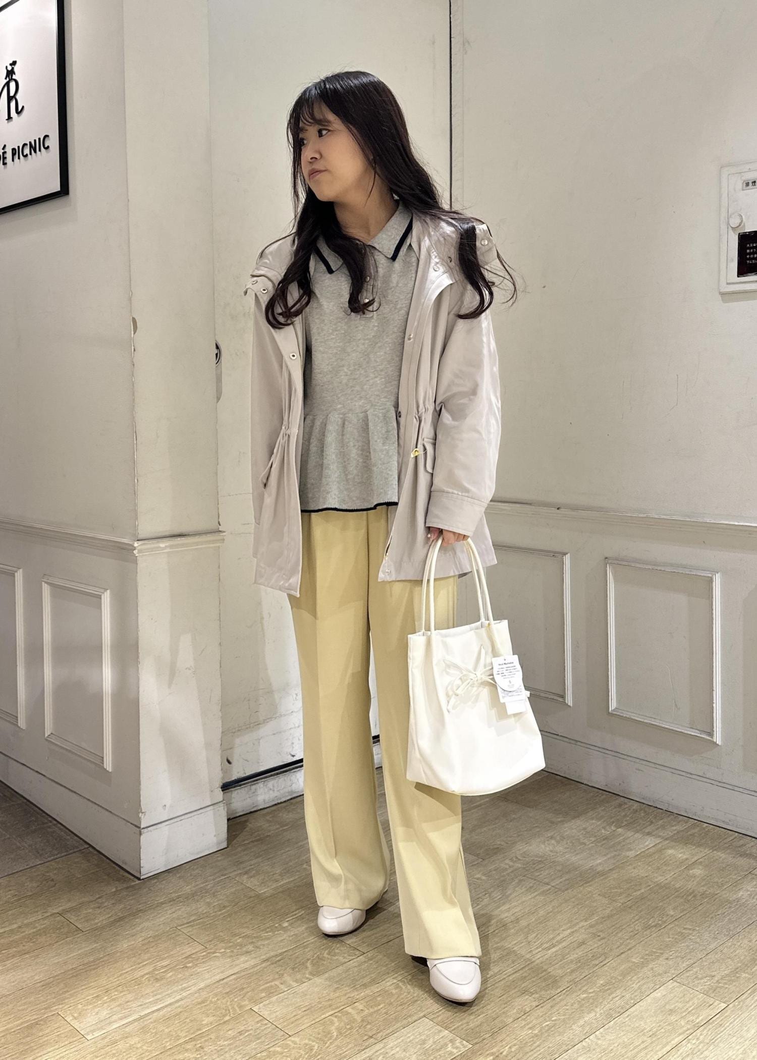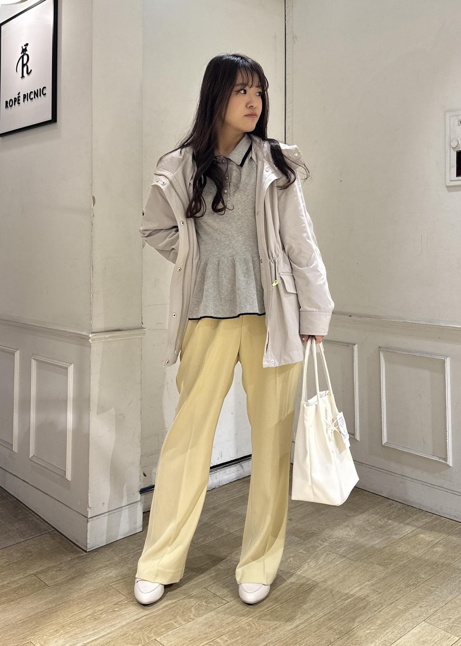 インナーに着ているペプラム型ニットはデザイン性があるのでアウターを脱いでも可愛いコーデです。