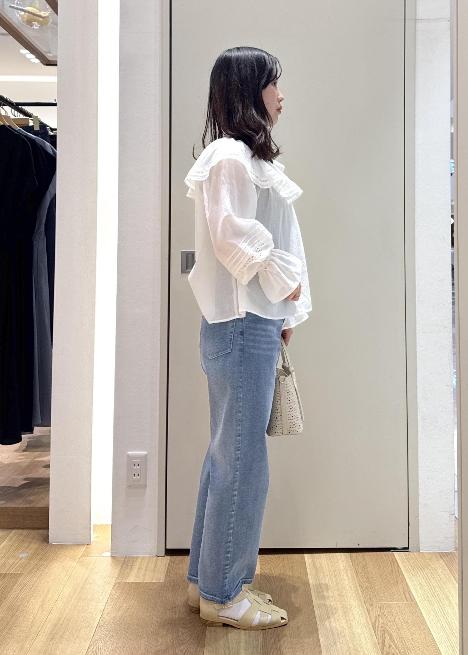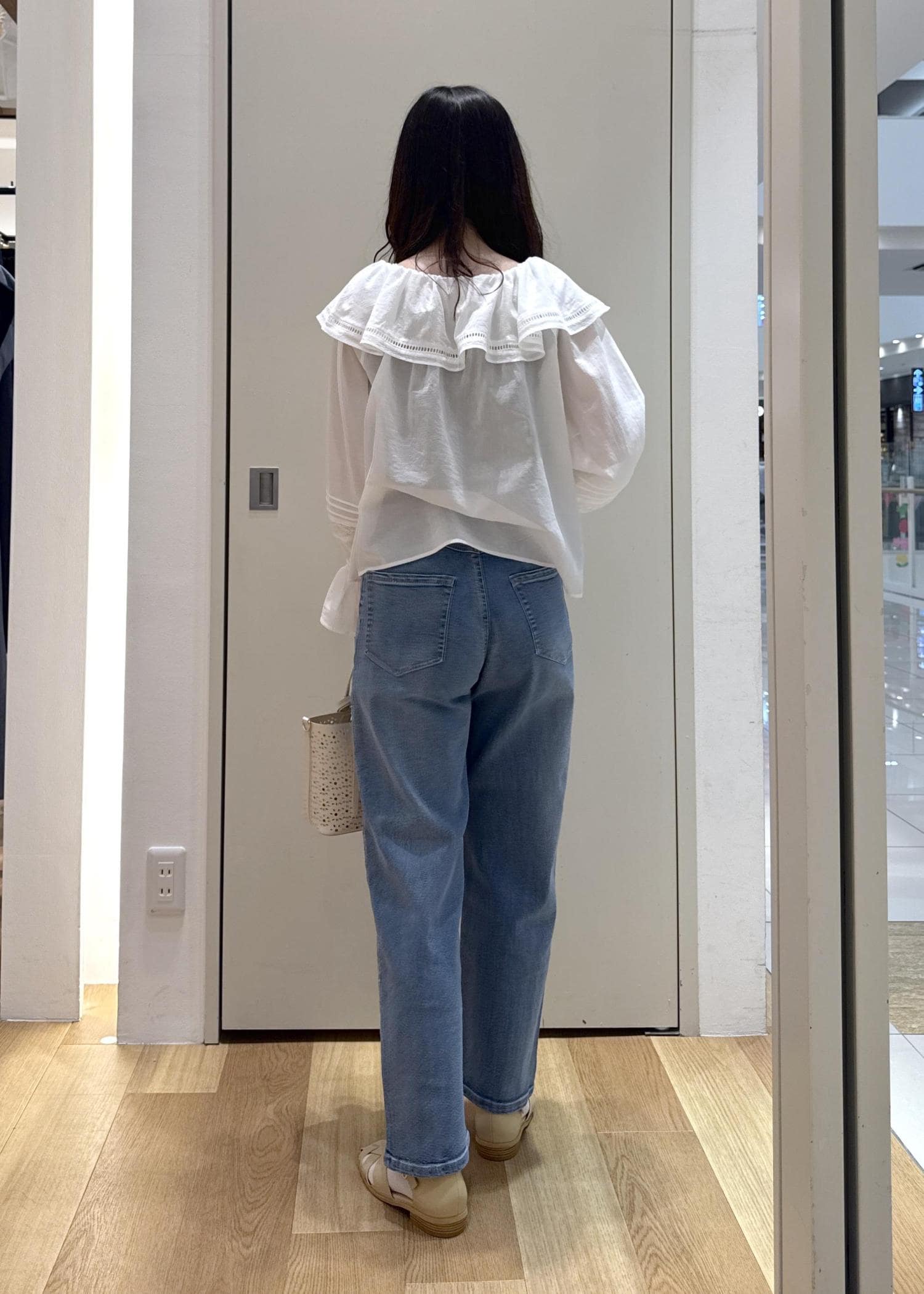 肌離れしてさらっと着やすいオフショルブラウスに、淡めのブルーのマムデニムを合わせたさわやかなカジュアルコーデ。