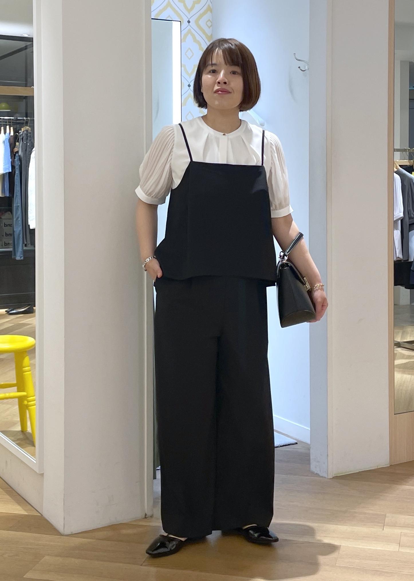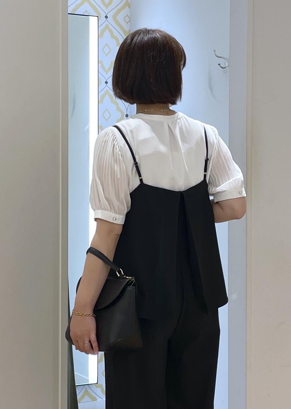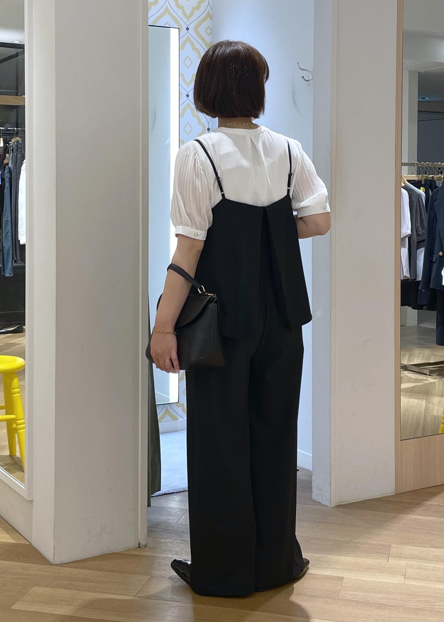 ブラックのオールインワンに袖プリーツのブラウスを合わせたきれいめコーデです!