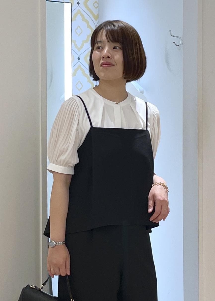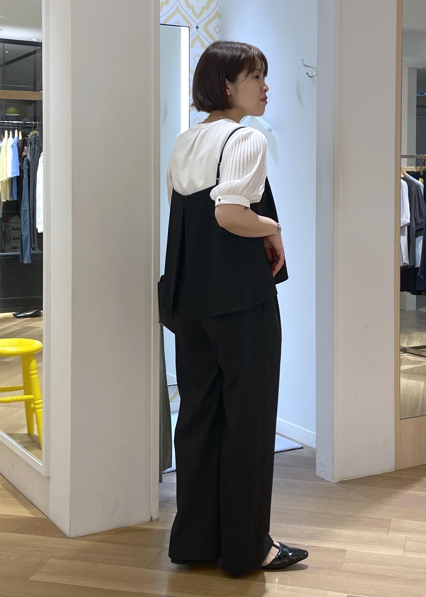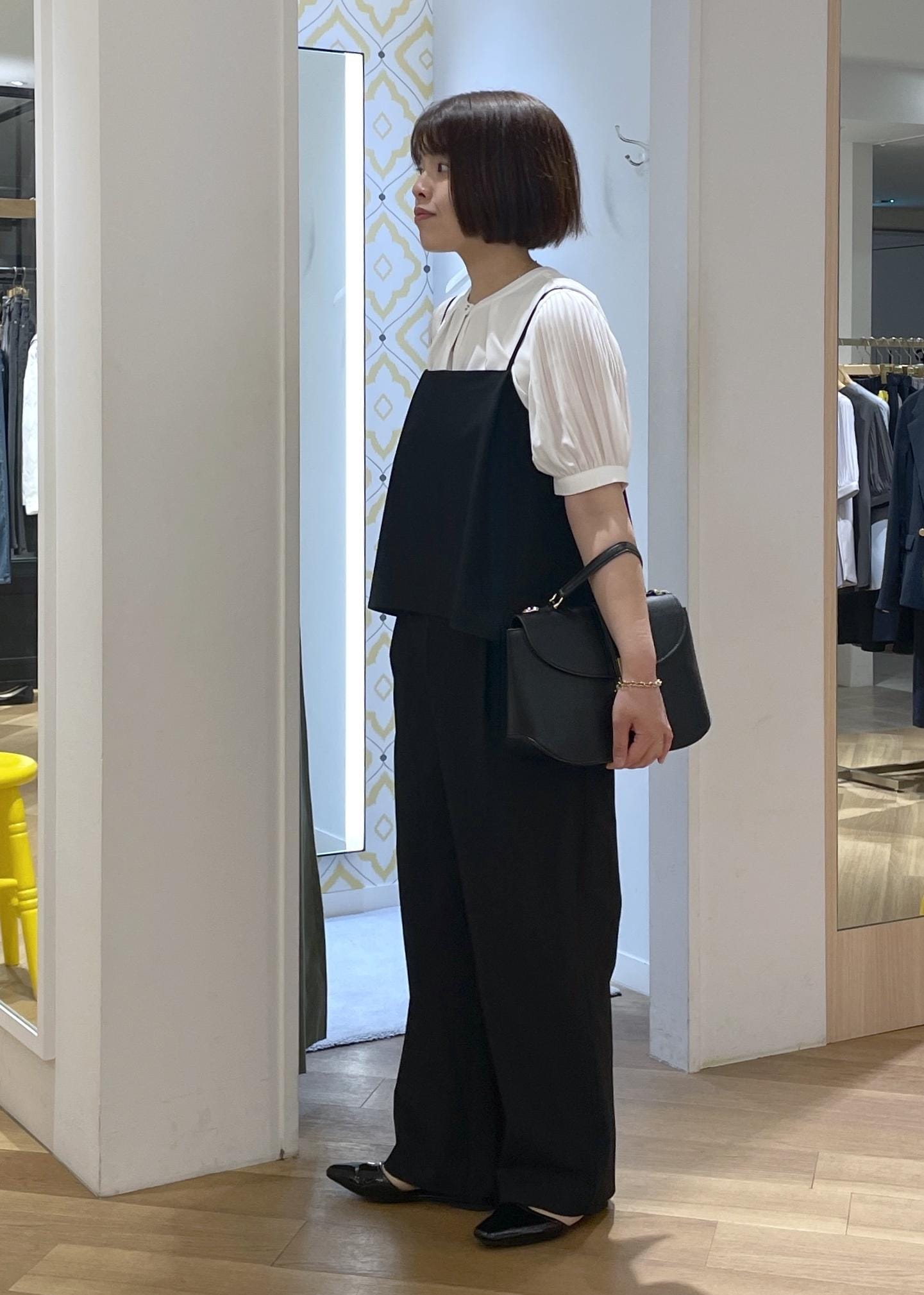 ブラックのオールインワンに袖プリーツのブラウスを合わせたきれいめコーデです!