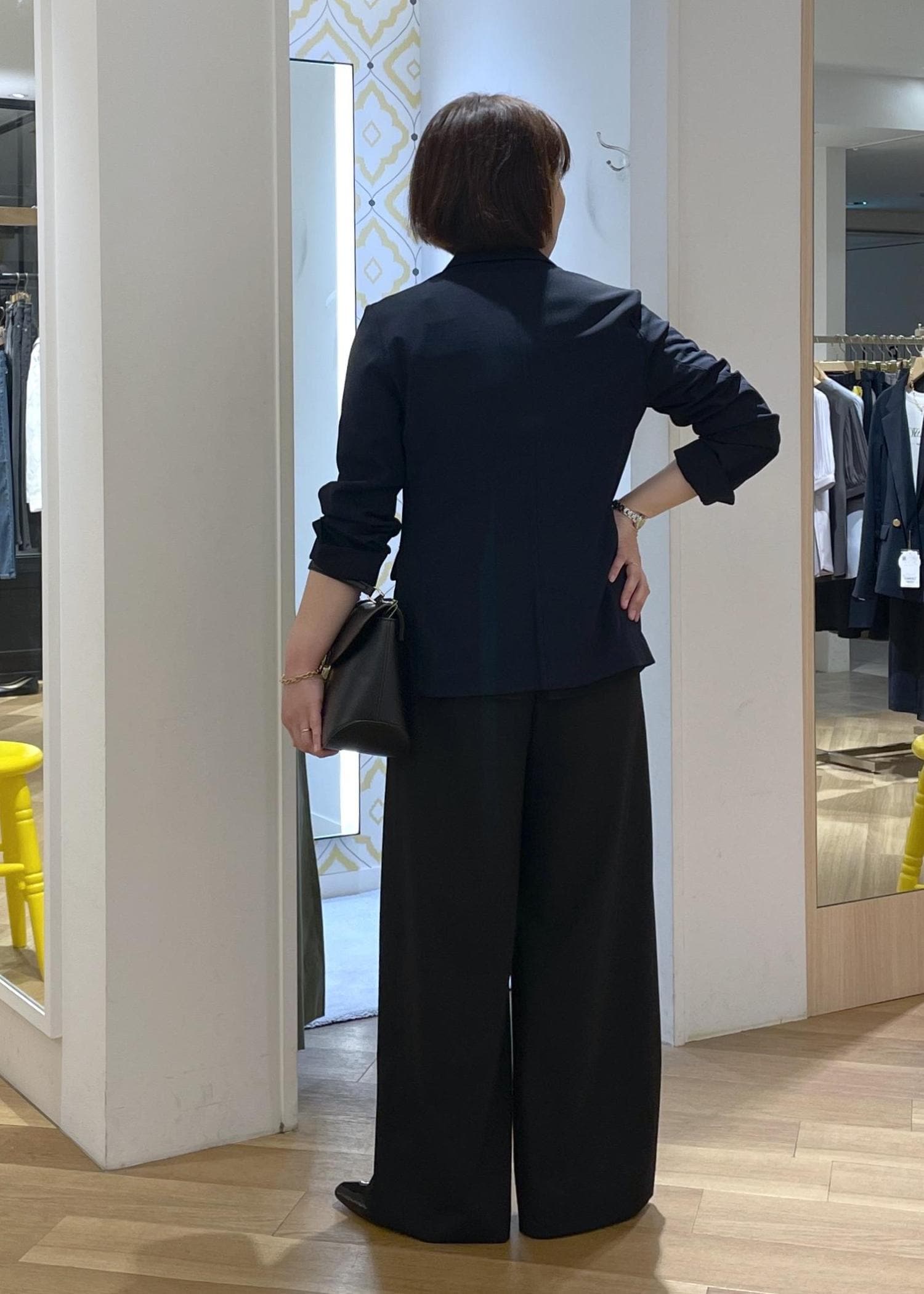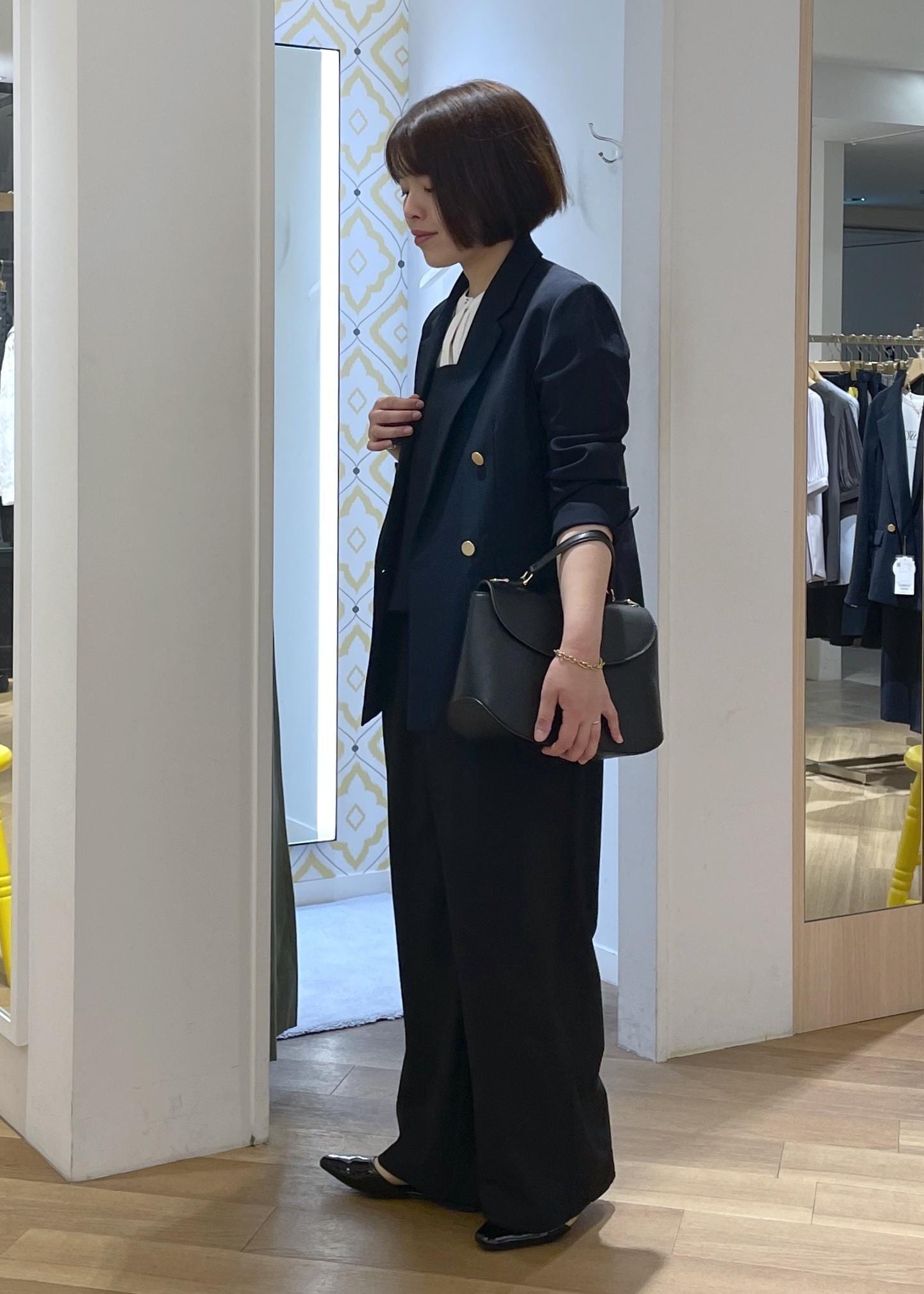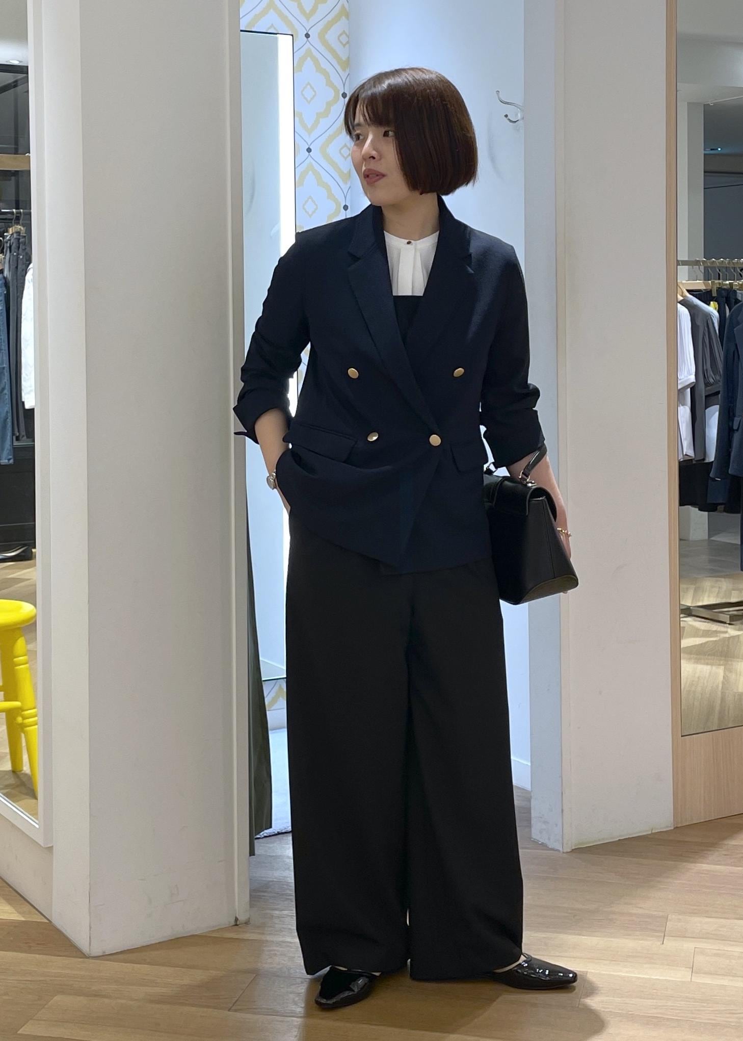 オールインワンのインナーには袖プリーツのブラウスを合わせて、ジャケットを脱いでもきちんとお洒落見えが叶うスタイルに◎